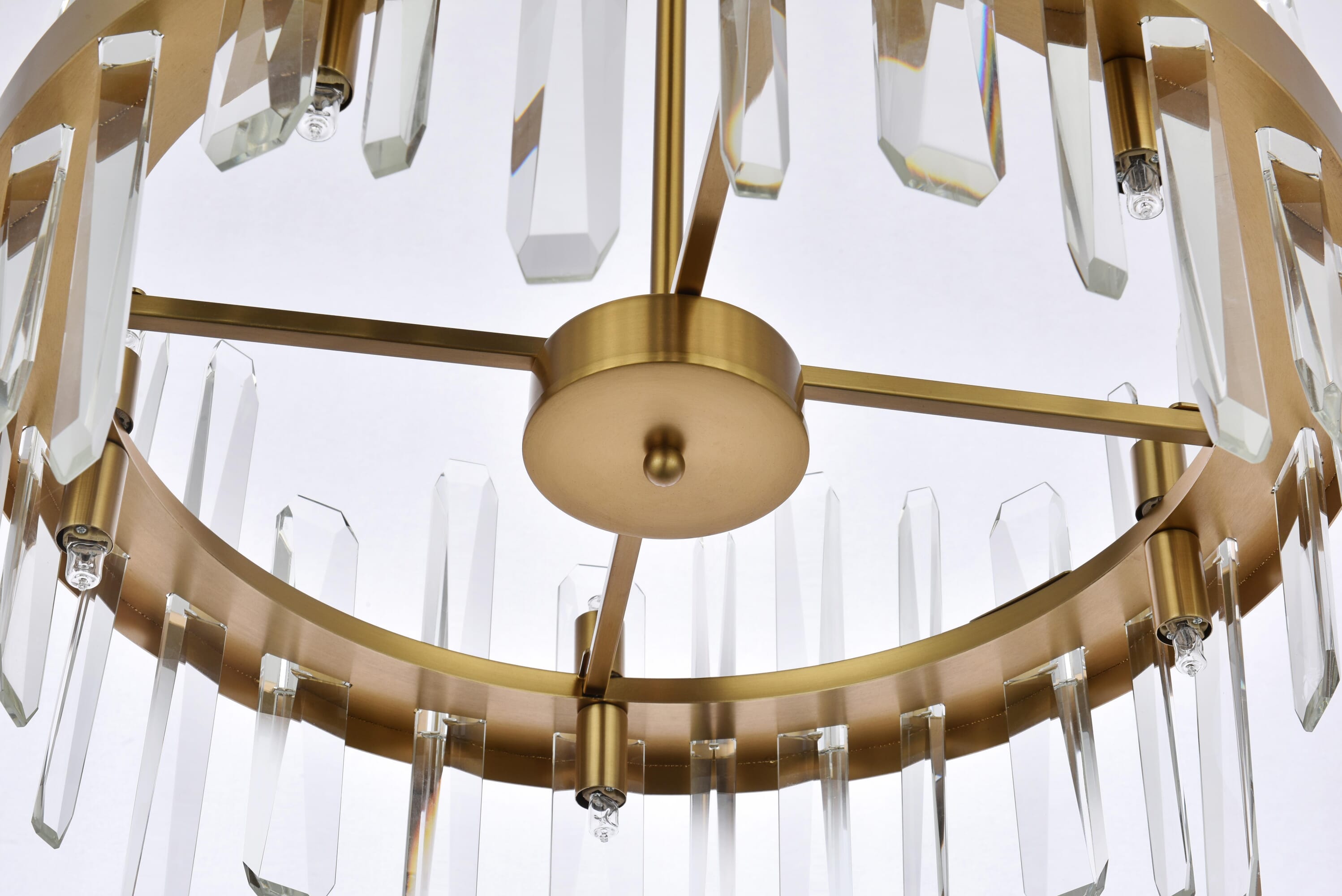 Dimensions Chain/Rod Length: 46" Length: 20" Width: 20" Height: 12" Maximum Height: 57.5" Wire Length: 75" Specifications Product Type: Pendants Hanging Device: Rod Voltage: 110V - 125V Dimmable: Yes Socket Type: G9 Number of Lights: 10 Wattage/Bulb: 20W Max/Nominal Watt: 200W Crystal/Glass Color: Clear Wire Included: Yes ETL: Yes Harware Material: Iron Fixture Material: Iron and Crystal Product Shape: Round Assembly Required: Yes Distressed Finish: No Hardware Finish: Satin Gold Bulb Included: No Dry/Wet/Damp: Dry Weight: 15.3 Product Warranty: 1 year limited Shipment type: small parcel