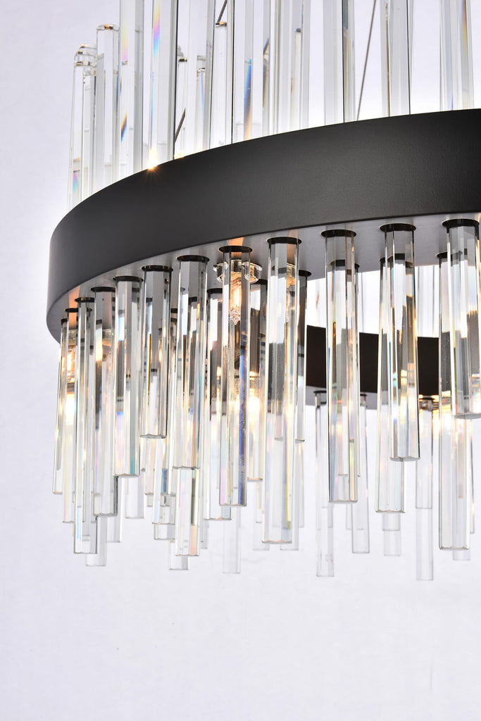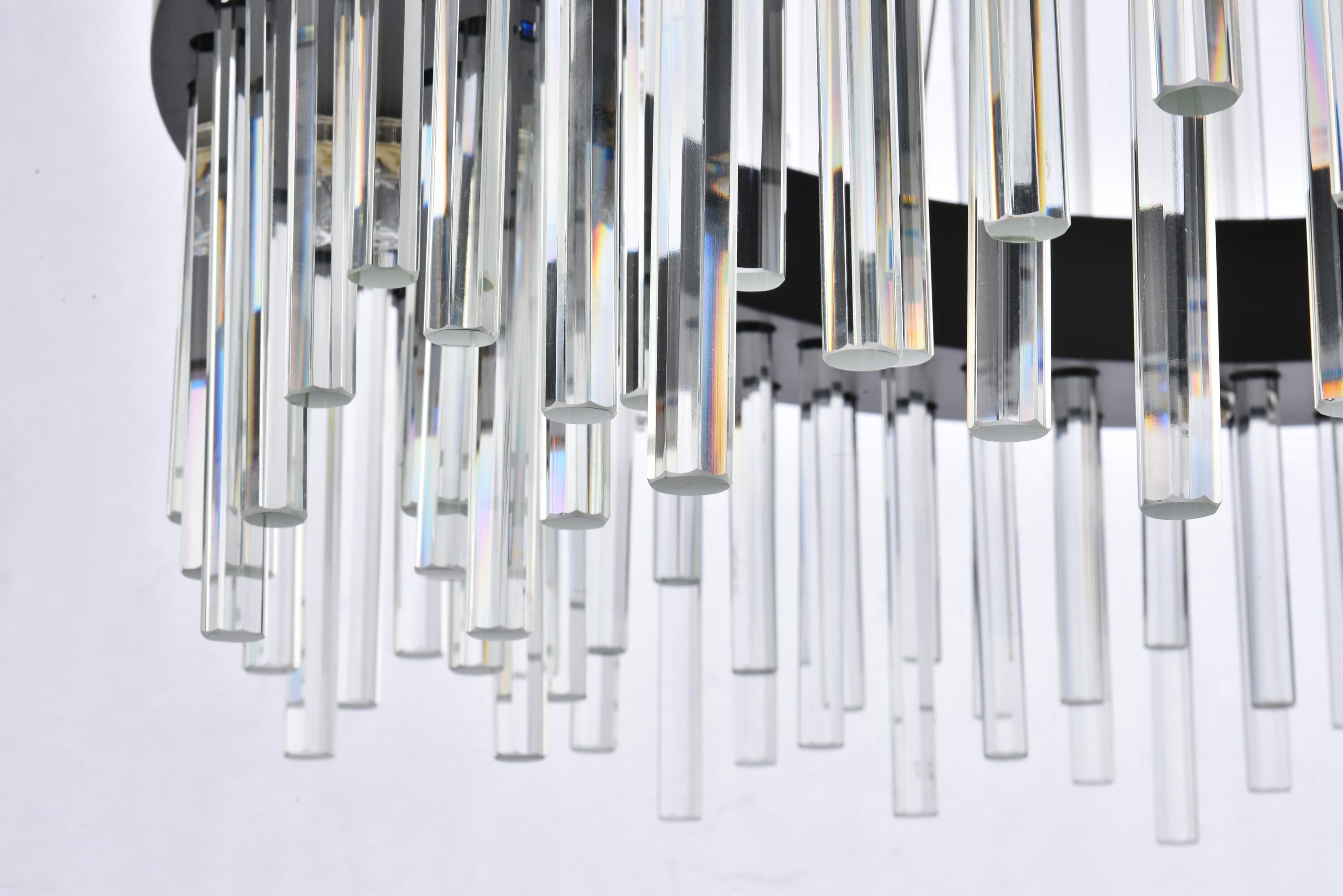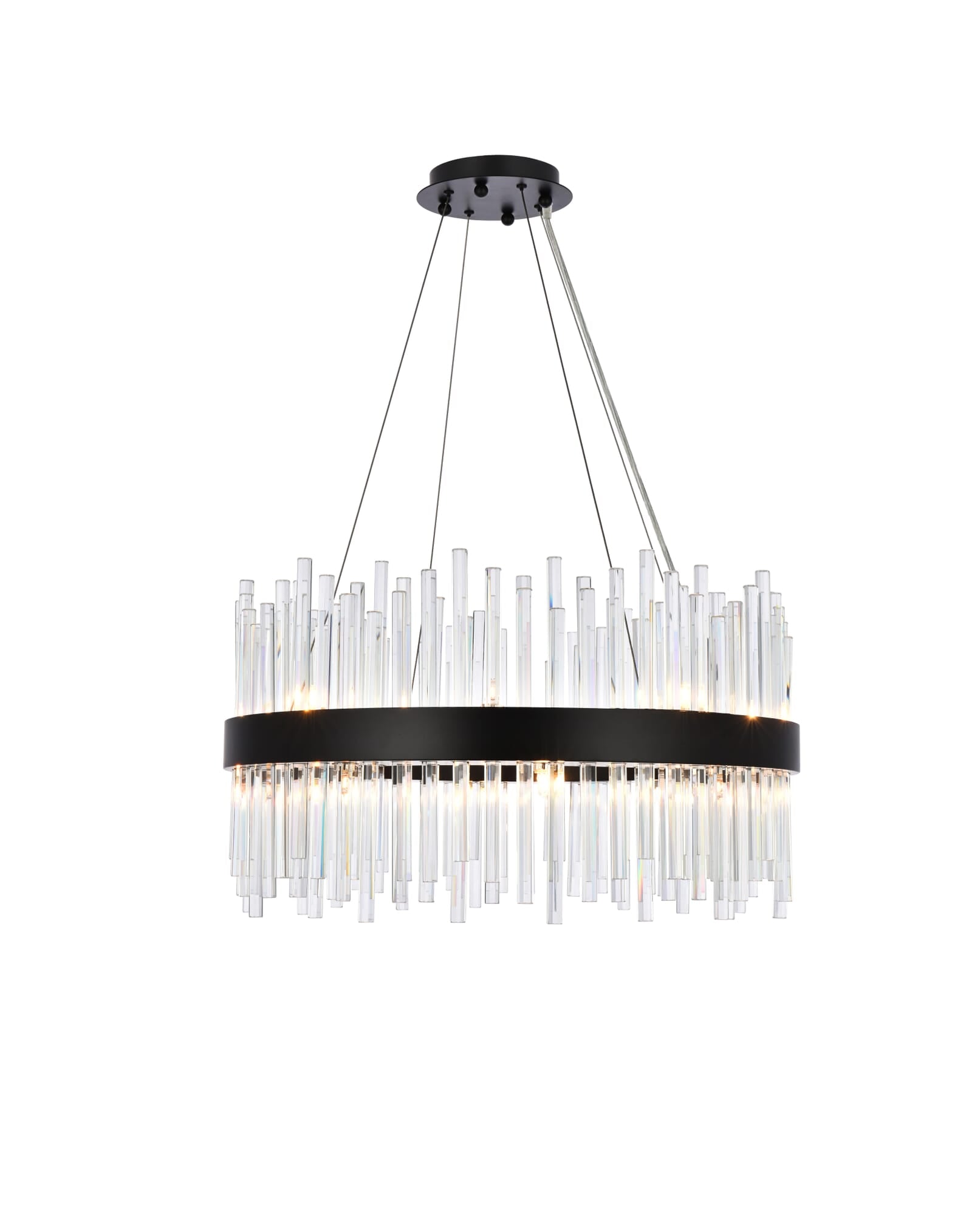 Dimensions Chain/Rod Length: 59" Length: 25" Width: 25" Height: 14" Maximum Height: 60" Wire Length: 118" Specifications Product Type: Pendants Hanging Device: Steel Wire Voltage: 110V - 125V Dimmable: Yes Socket Type: G9 Number of Lights: 16 Wattage/Bulb: 20W Max/Nominal Watt: 320W Crystal/Glass Color: Clear Wire Included: Yes ETL: Yes Harware Material: Iron Fixture Material: Iron and Crystal Product Shape: Round Assembly Required: Yes Distressed Finish: No Hardware Finish: Black Bulb Included: No Dry/Wet/Damp: Dry Weight: 37 Product Warranty: 1 year limited Shipment type: small parcel