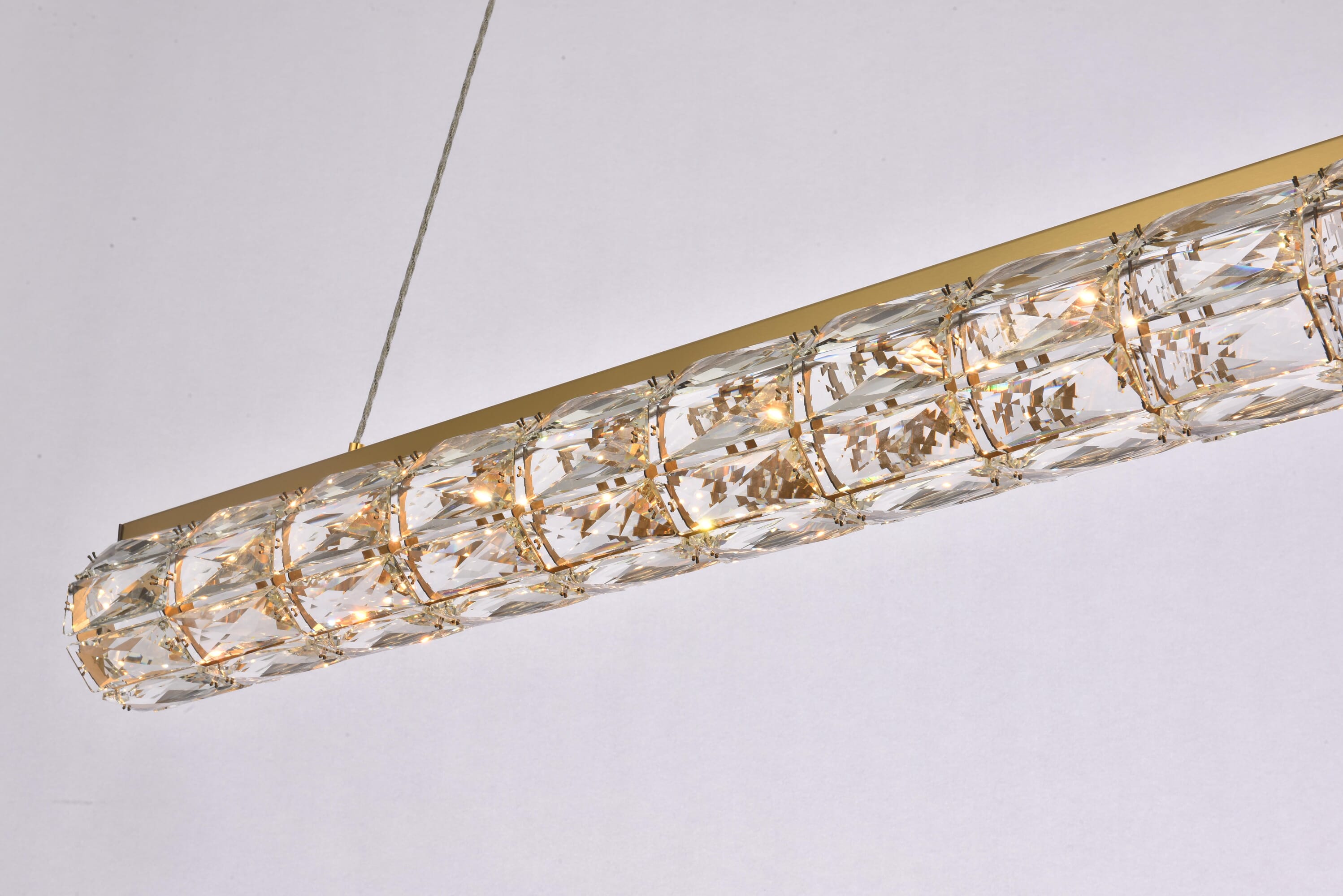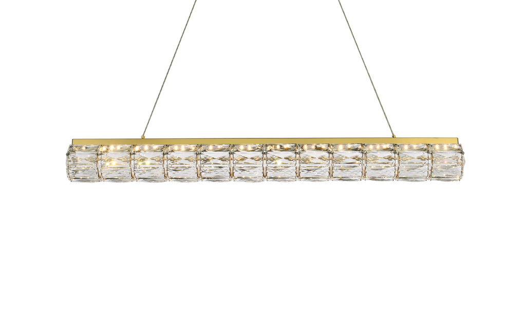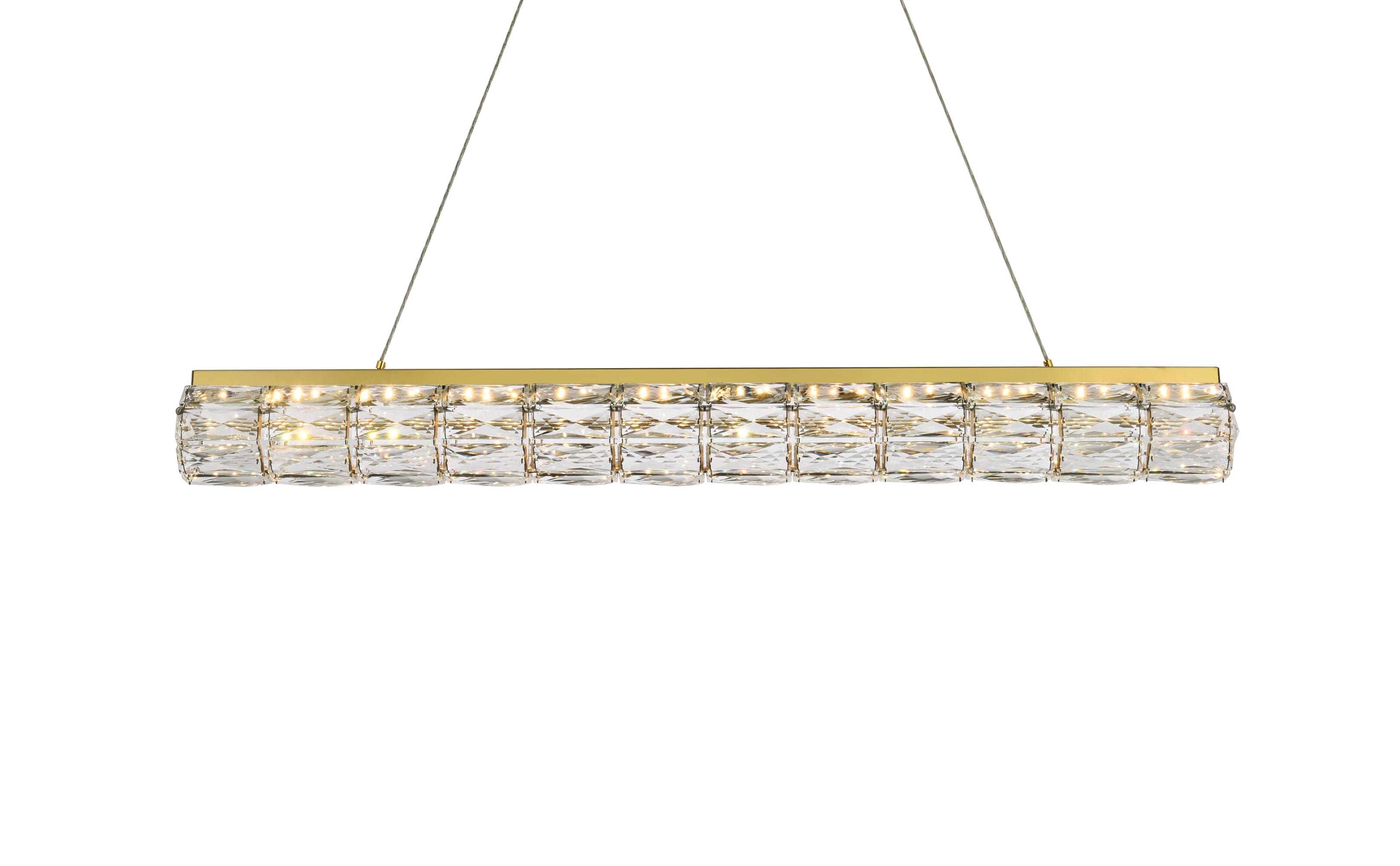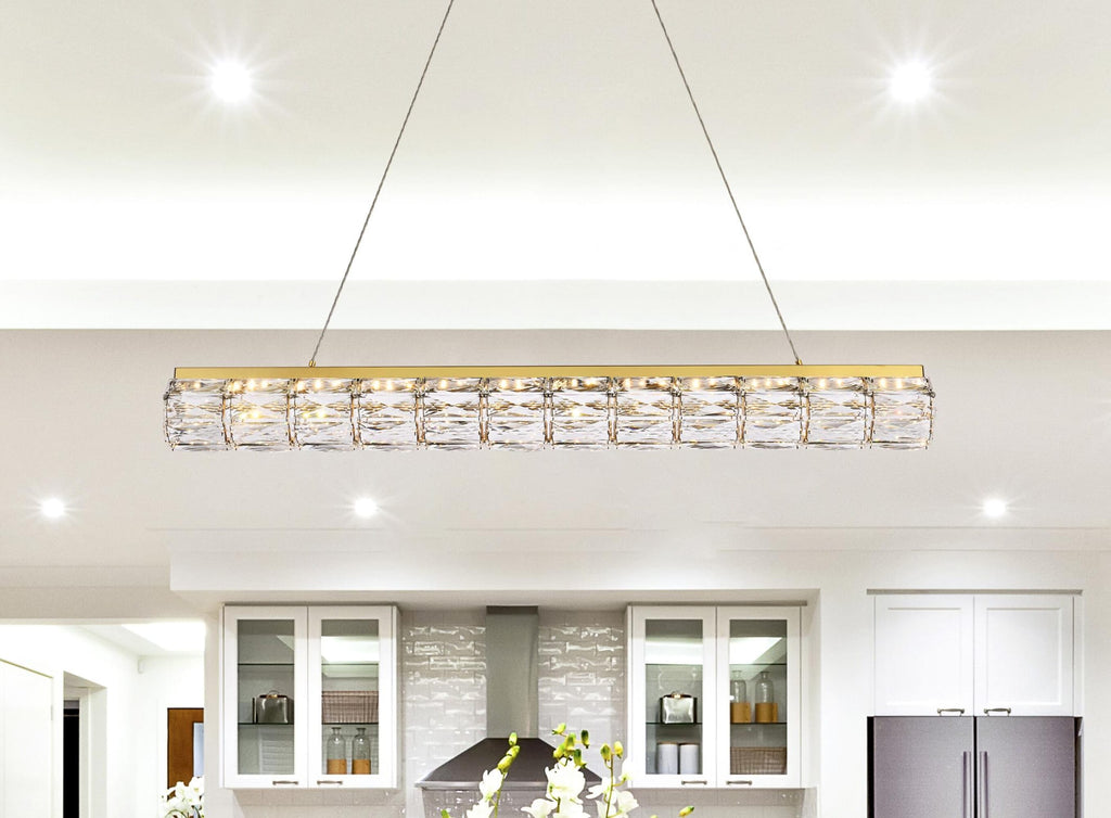 Dimensions Chain/Rod Length: 78" Length: 36" Width: 4" Height: 4" Maximum Height: 80" Wire Length: 78" Specifications Product Type: Pendants Hanging Device: Steel Wire Dimmable: Yes Socket Type: Integrated LED Number of Lights: 1 Crystal/Glass Color: Clear Wire Included: Yes ETL: Yes Harware Material: Iron and stainless steel Product Shape: Rectangle Assembly Required: No Distressed Finish: No Hardware Finish: gold Bulb Included: Yes Dry/Wet/Damp: Dry Weight: 12.1 Product Warranty: 1 year limited Shipment type: small parcel