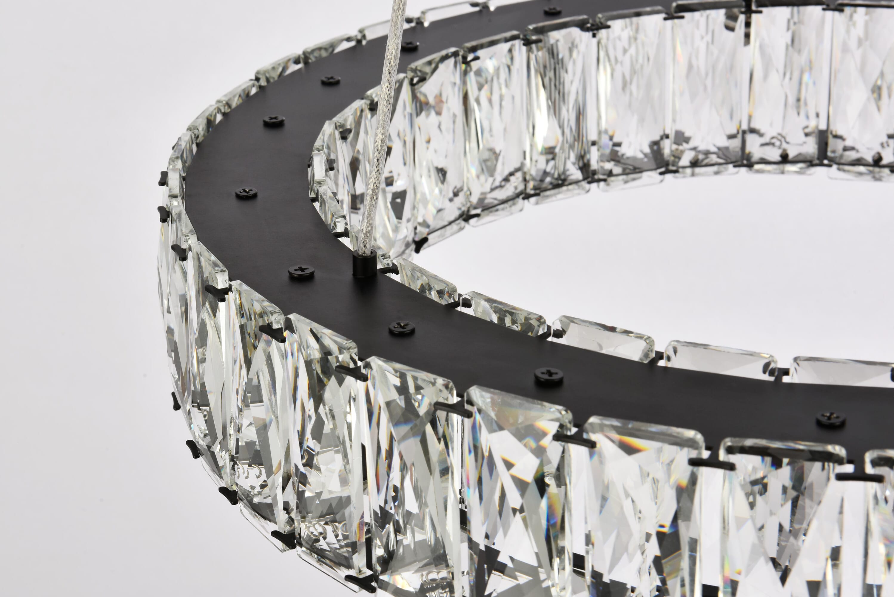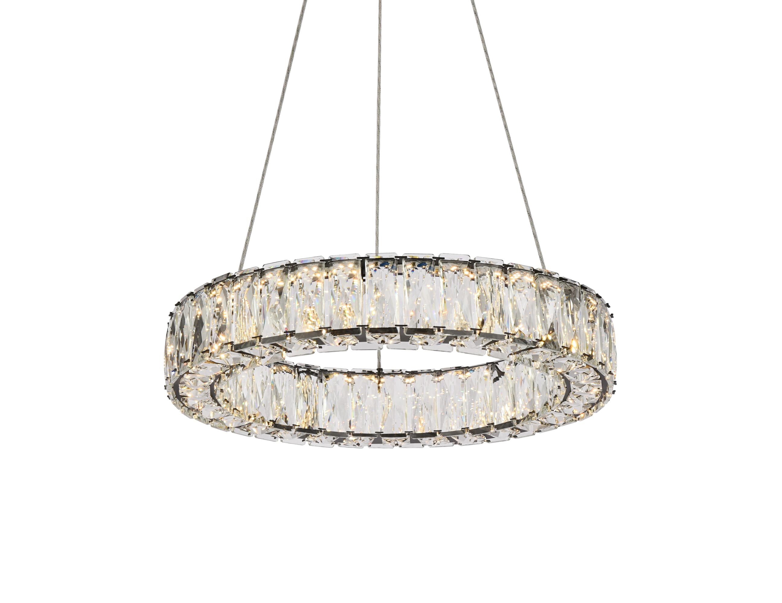 Dimensions Chain/Rod Length: 132" Length: 17" Width: 17" Height: 3" 134 132 Specifications Product Type: Pendants Hanging Device: Steel Wire Dimmable: Yes Socket Type: Integrated LED Number of Lights: 1 Crystal/Glass Color: Clear Wire Included: Yes ETL: Yes Harware Material: Iron and stainless steel Product Shape: Round Assembly Required: No Distressed Finish: No Hardware Finish: black Bulb Included: Yes Dry/Wet/Damp: Dry Weight: 11.2 Product Warranty: 1 year limited Shipment type: small parcel