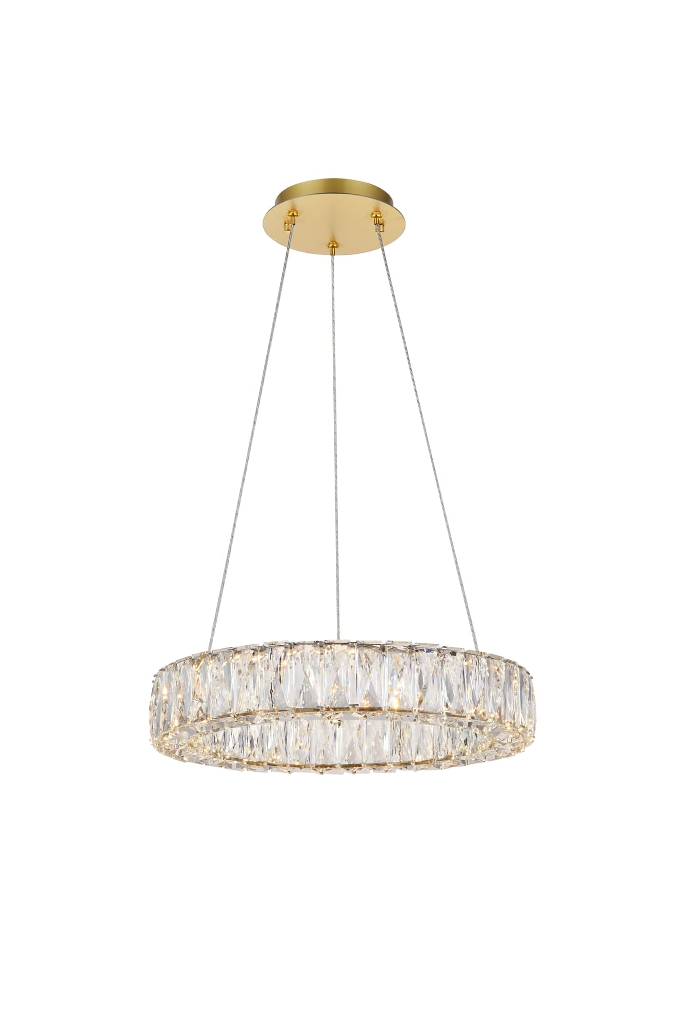 Dimensions Chain/Rod Length: 132" Length: 17.7" Width: 17.7" Height: 3" 134 134 Specifications Product Type: Pendants Hanging Device: Steel Wire Voltage: 110V - 125V Dimmable: Yes Only Up To 90% Socket Type: Integrated LED Chip Number of Lights: Integrated LED chip Wattage/Bulb: 0.225 Max/Nominal Watt: 22.5 Crystal/Glass Color: Clear Wire Included: Yes Bulb Shape: Rectangle Harware Material: Stainless Steel Fixture Material: Stainless Steel and Crystal Product Shape: Pendants Assembly Required: No Hardware Finish: gold Bulb Included: Yes UL & ULC Standard: UL,ULC Weight: 11.2 Product Warranty: 1 year limited Shipment type: Small Parcel