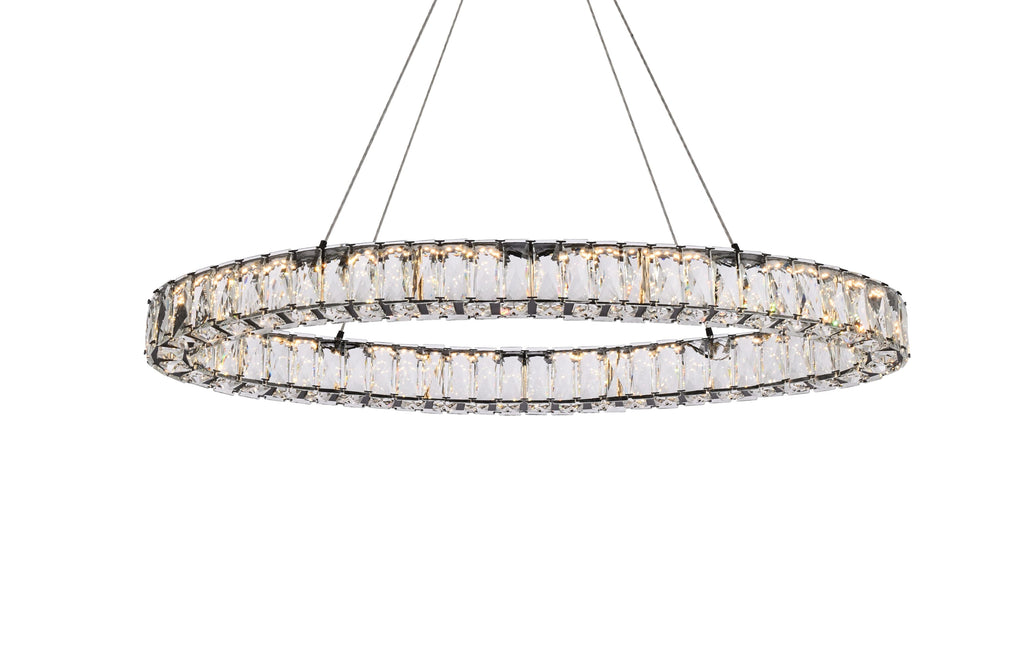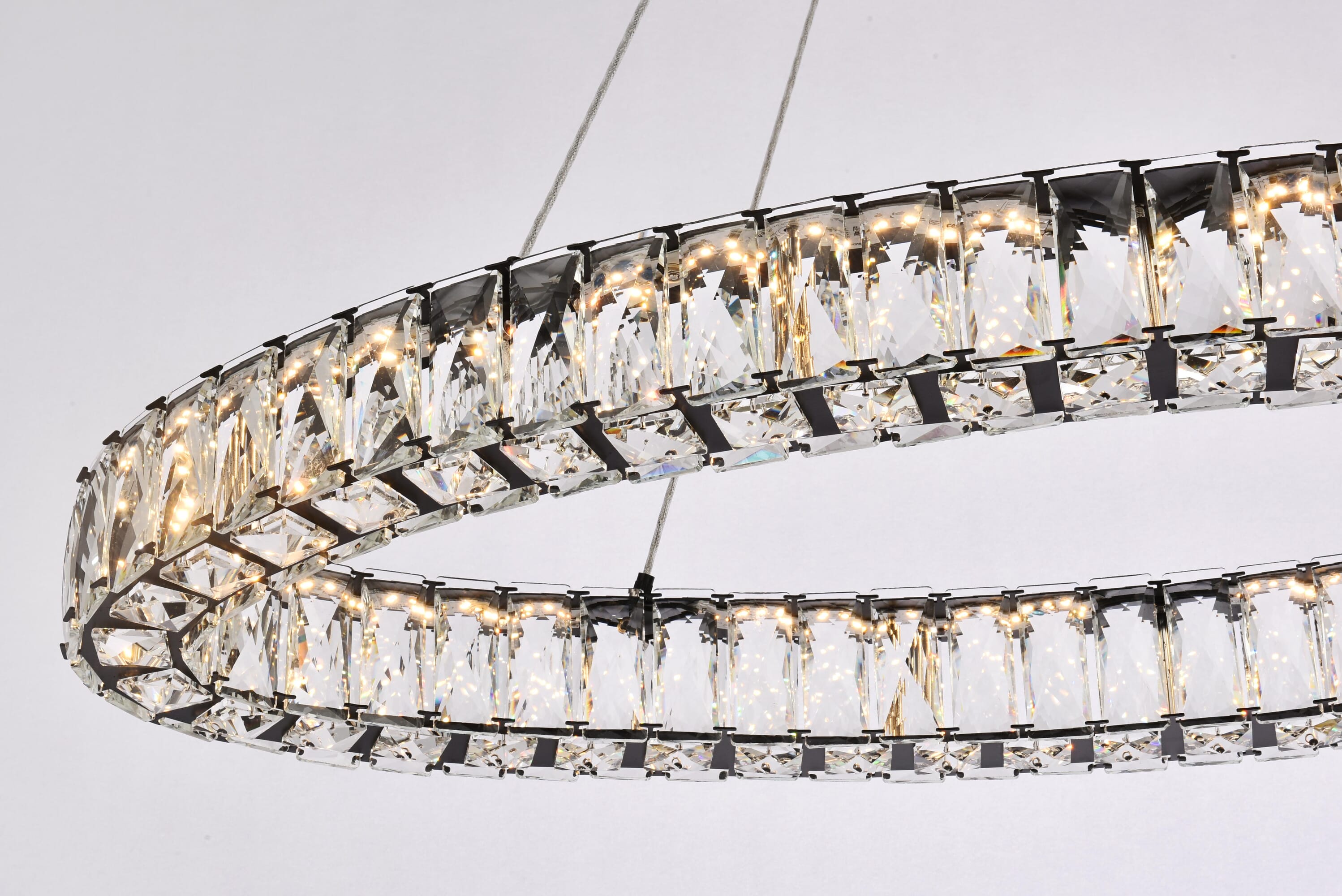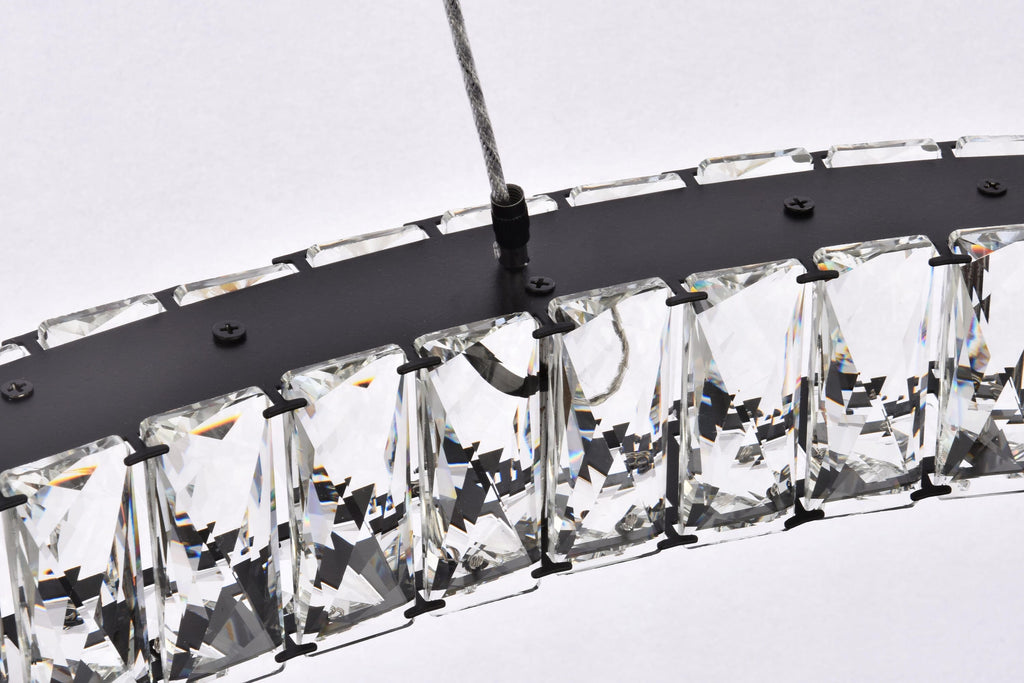 Dimensions Chain/Rod Length: 132" Length: 36" Width: 16" Height: 3" 134 132 Specifications Product Type: Pendants Hanging Device: Steel Wire Dimmable: Yes Socket Type: Integrated LED Number of Lights: 1 Crystal/Glass Color: Clear Wire Included: Yes ETL: Yes Harware Material: Iron and stainless steel Product Shape: Oval Assembly Required: No Distressed Finish: No Hardware Finish: black Bulb Included: Yes Dry/Wet/Damp: Dry Weight: 16.5 Product Warranty: 1 year limited Shipment type: small parcel