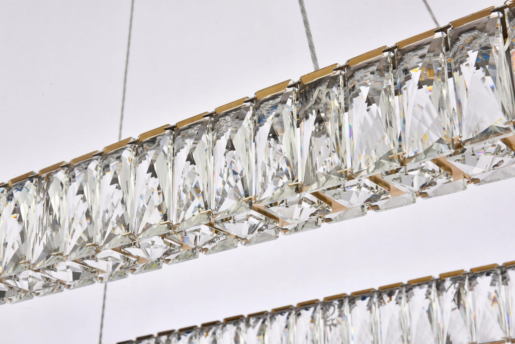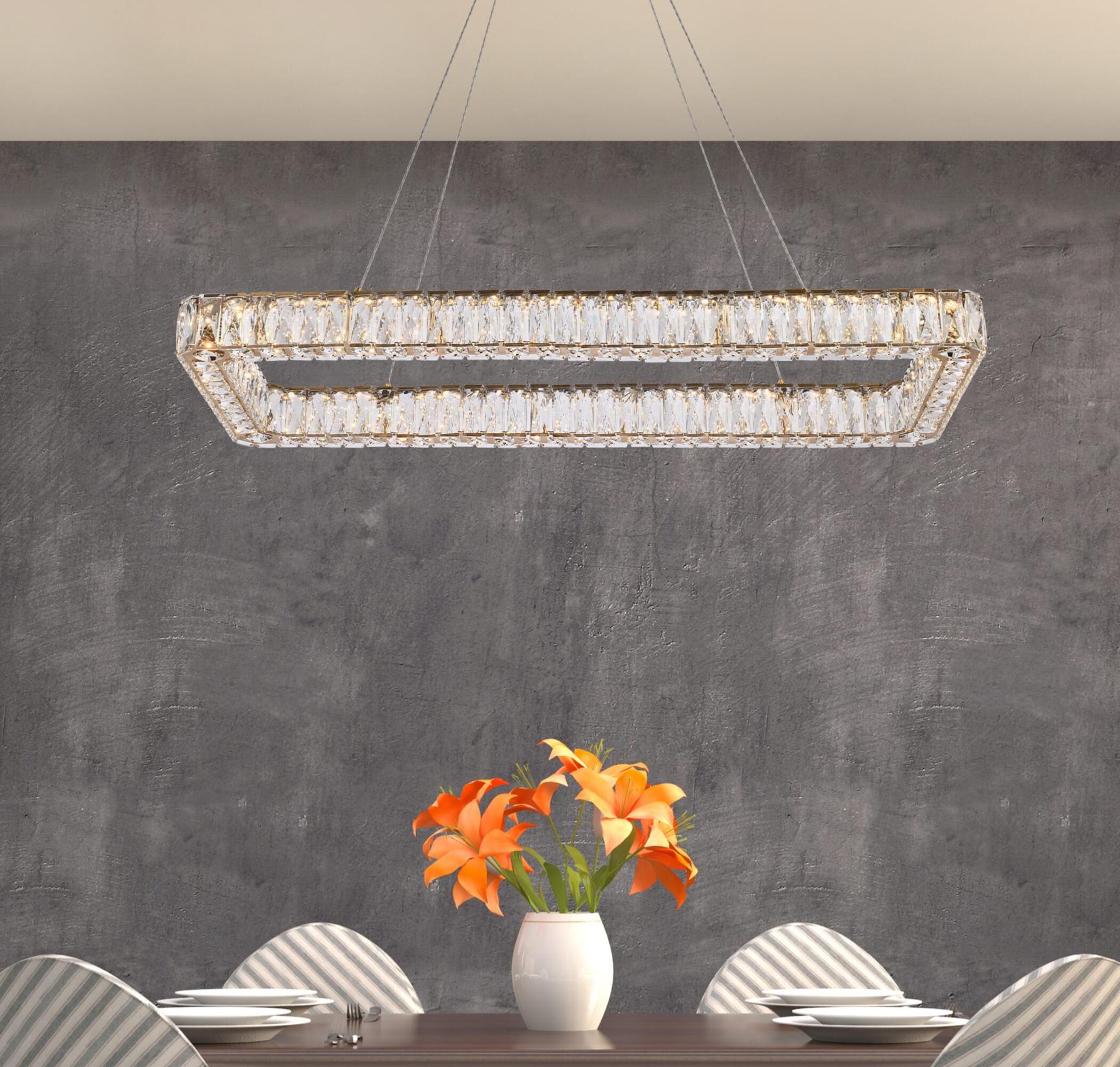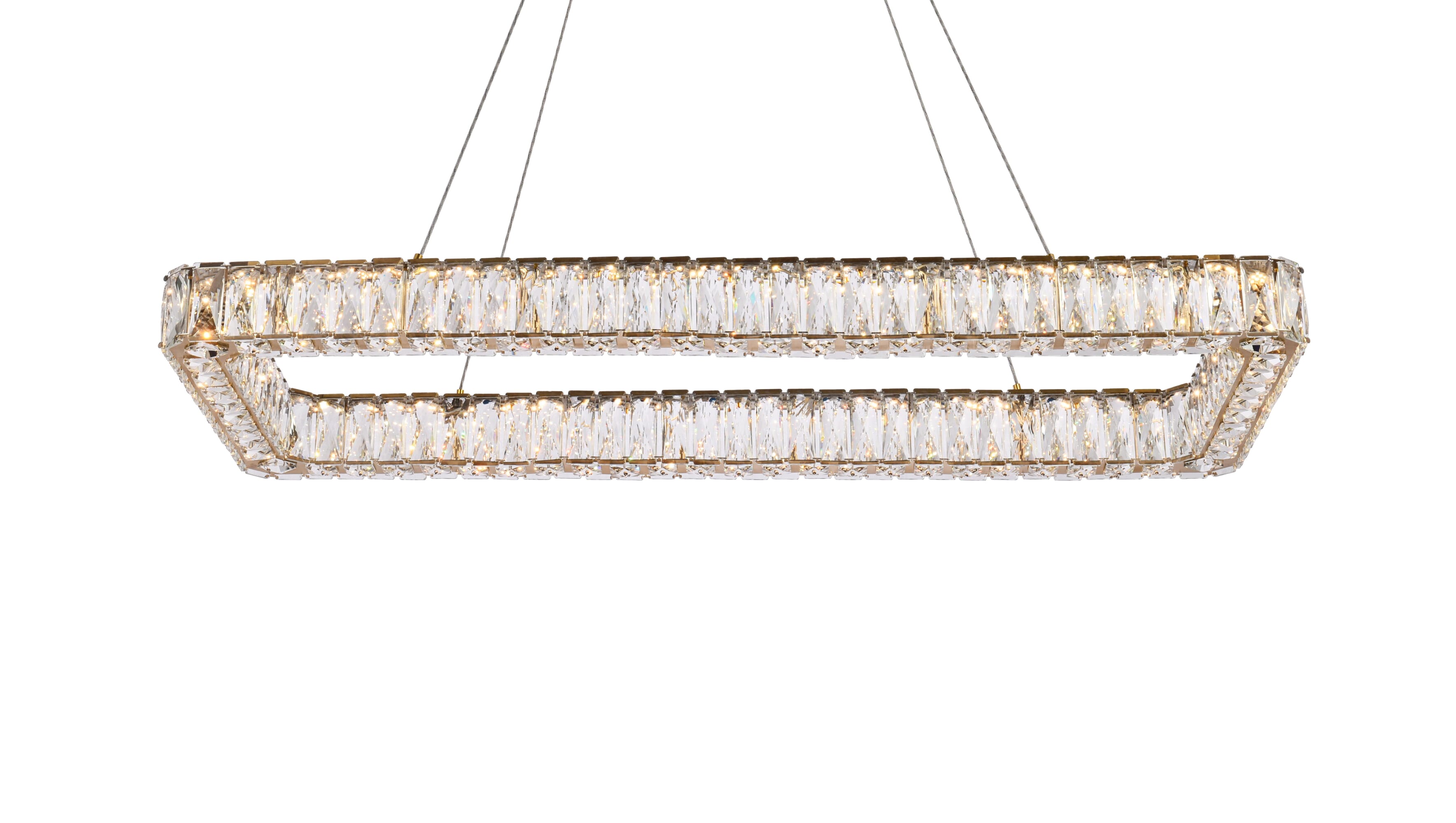Dimensions Chain/Rod Length: 78" Length: 42" Width: 18" Height: 3" Maximum Height: 80" Wire Length: 78" Specifications Product Type: Pendants Hanging Device: Steel Wire Dimmable: Yes Socket Type: Integrated LED Number of Lights: 1 Crystal/Glass Color: Clear Wire Included: Yes ETL: Yes Harware Material: Iron and stainless steel Product Shape: Rectangle Assembly Required: No Distressed Finish: No Hardware Finish: gold Bulb Included: Yes Dry/Wet/Damp: Dry Weight: 27 Product Warranty: 1 year limited Shipment type: small parcel