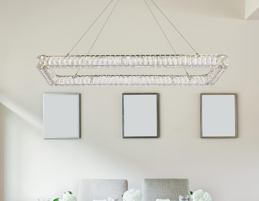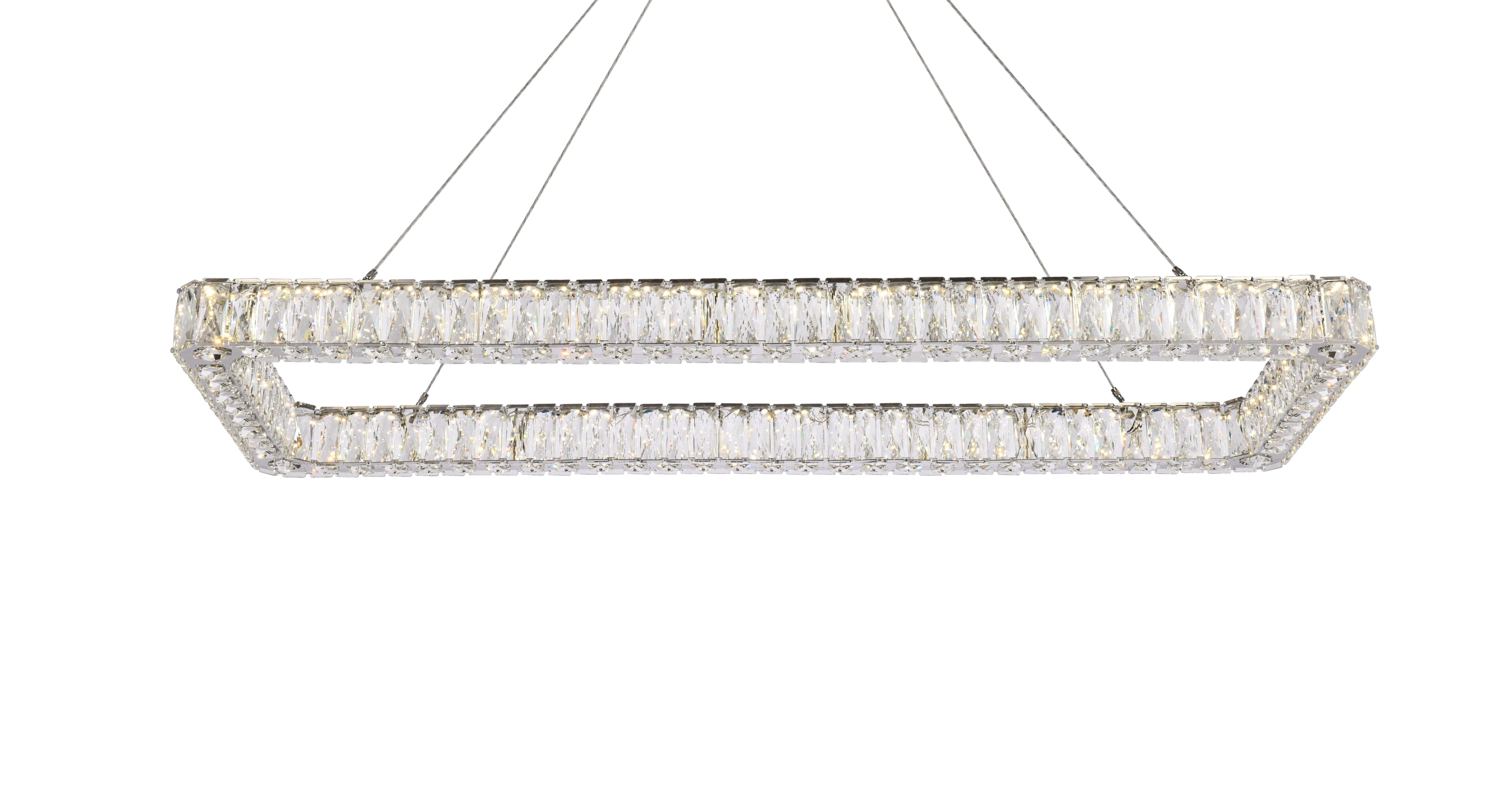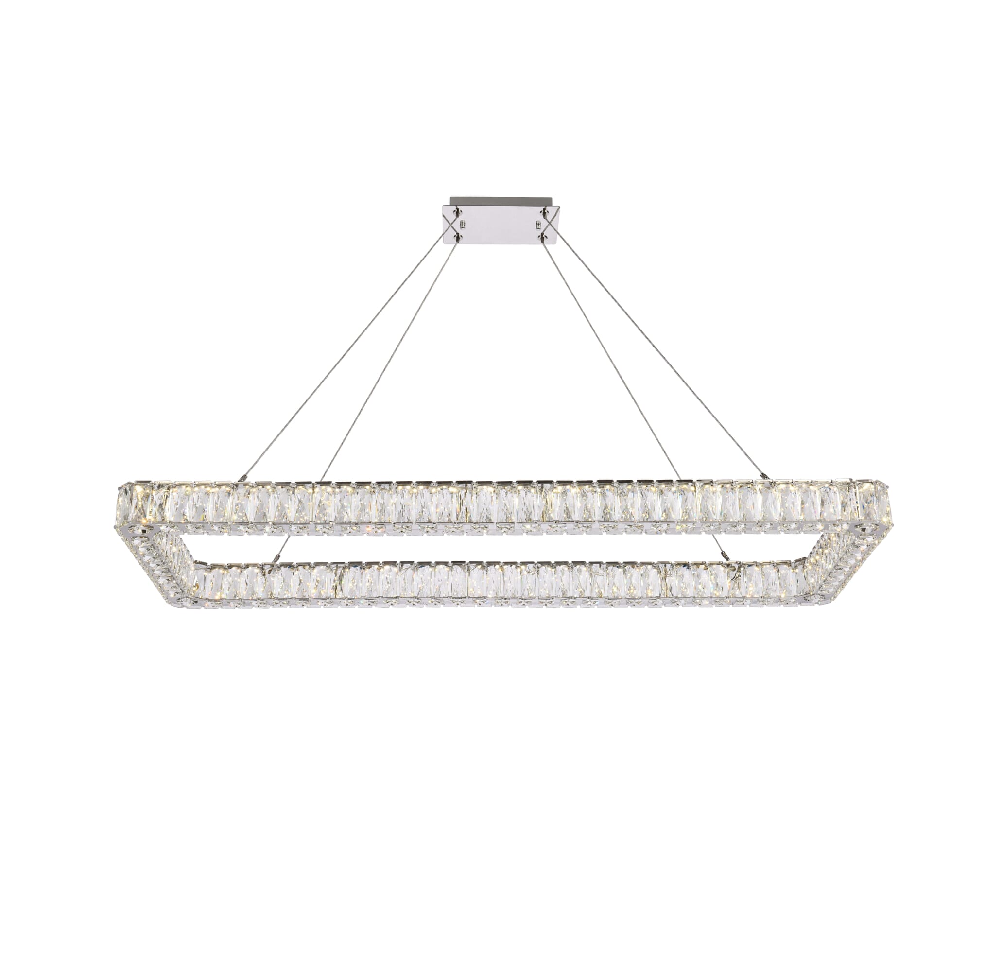 Dimensions Chain/Rod Length: 78" Length: 50" Width: 19" Height: 3" Maximum Height: 80" Wire Length: 78" Specifications Product Type: Pendants Hanging Device: Steel Wire Dimmable: Yes Socket Type: Integrated LED Number of Lights: 1 Crystal/Glass Color: Clear Wire Included: Yes ETL: Yes Harware Material: Iron and stainless steel Product Shape: Rectangle Assembly Required: No Distressed Finish: No Hardware Finish: chrome Bulb Included: Yes Dry/Wet/Damp: Dry Weight: 30.8 Product Warranty: 1 year limited Shipment type: small parcel