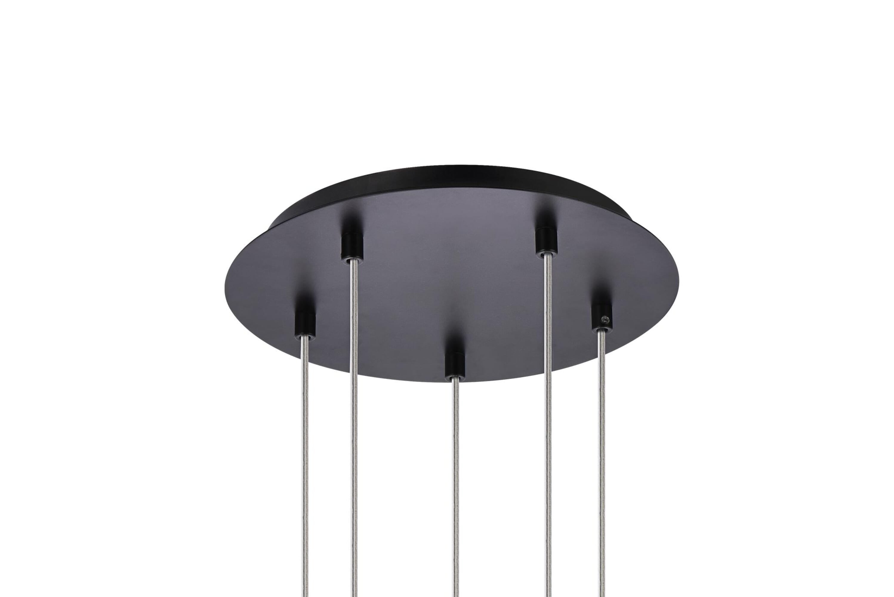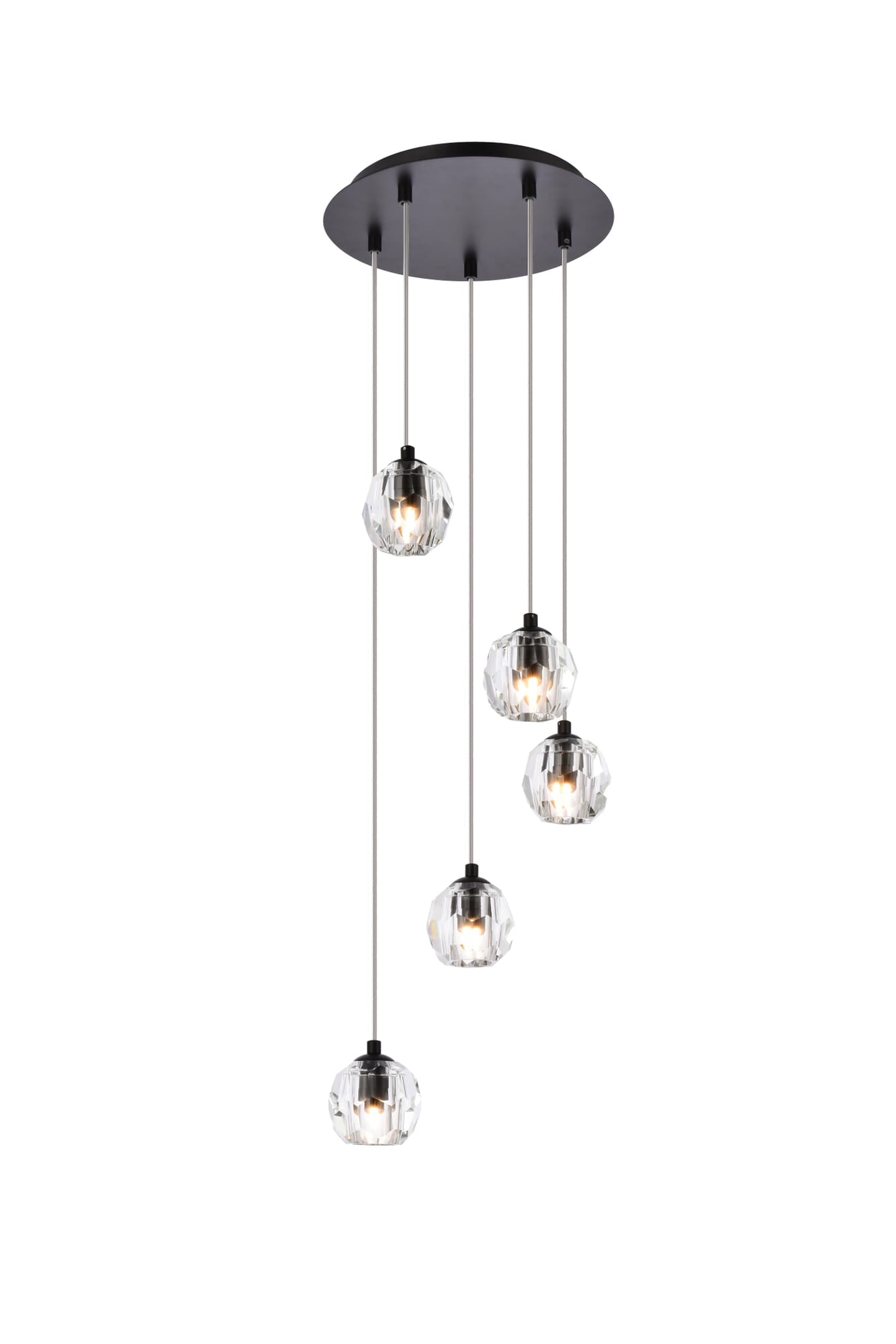 Dimensions Chain/Rod Length: 132" Length: 11.8" Width: 11.8" Height: 3.7" 137 132 Specifications Product Type: Pendants Hanging Device: Steel Wire Voltage: 110V - 120V Socket Type: G9 Number of Lights: 5 Wattage/Bulb: 40W Max/Nominal Watt: 200W Crystal/Glass Color: clear Wire Included: Yes Bulb Shape: T4 Harware Material: Iron and stainless steel Fixture Material: Stainless Steel and Crystal Product Shape: Pendants Assembly Required: NO Distressed Finish: No Hardware Finish: Black Dry/Wet/Damp: Dry Weight: 11.5 Product Warranty: 1 year limited Shipment type: Small Parcel
