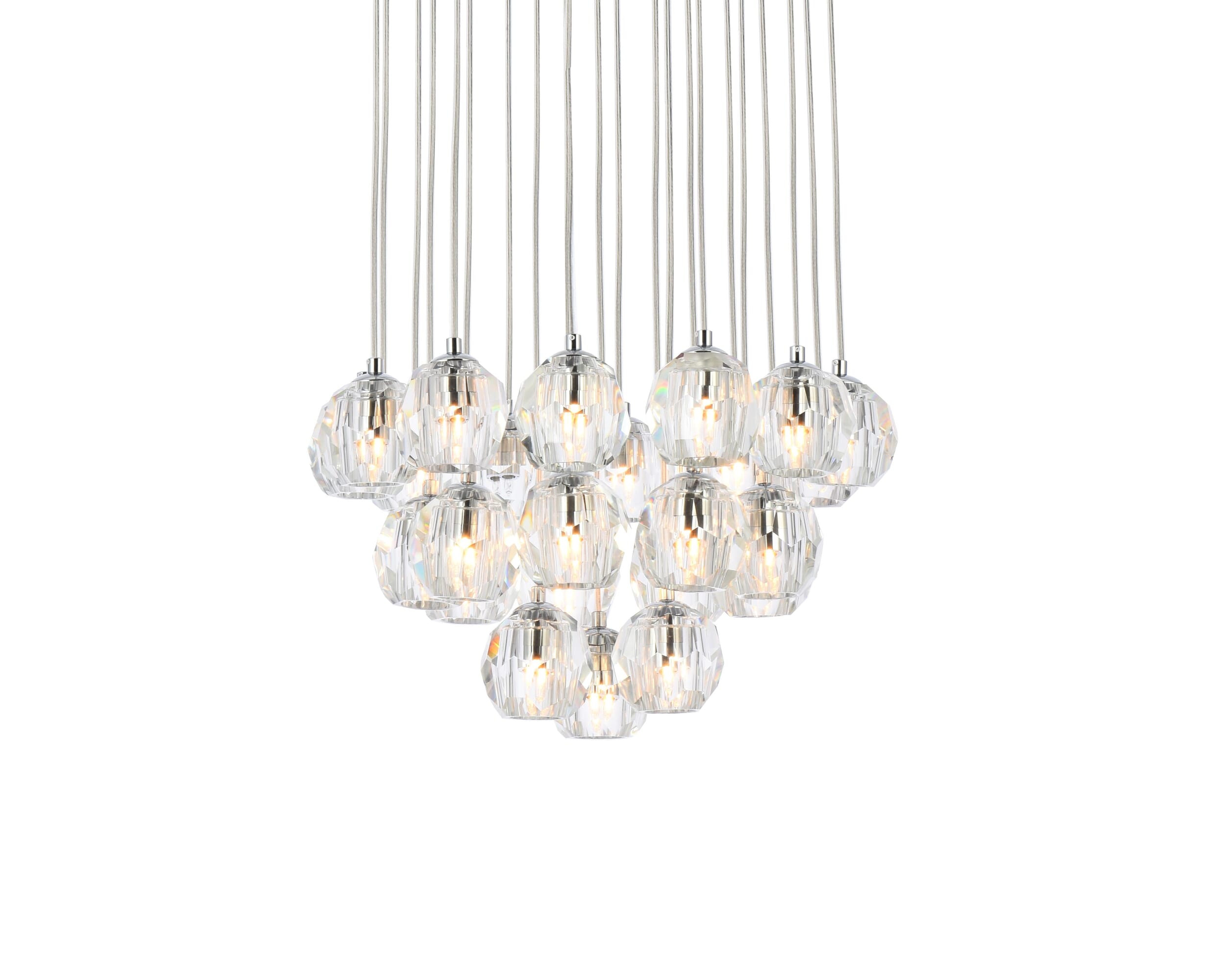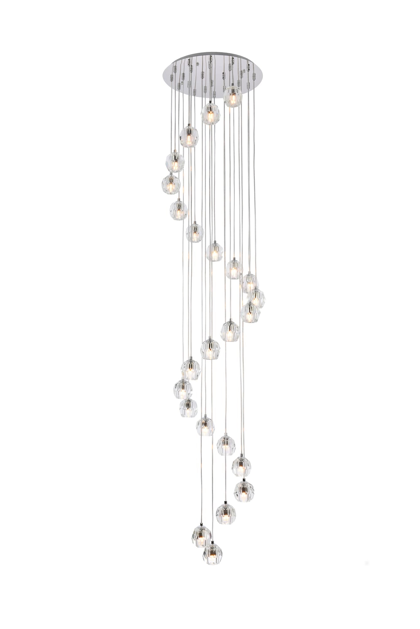 Dimensions Chain/Rod Length: 141" Length: 18.5" Width: 18.5" Height: 3.7" Maximum Height: 146" Wire Length: 141" Specifications Product Type: Pendants Hanging Device: Steel Wire Voltage: 110V - 120V Socket Type: G9 Number of Lights: 24 Wattage/Bulb: 10W Max/Nominal Watt: 240W Crystal/Glass Color: clear Wire Included: Yes Bulb Shape: T4 Harware Material: Iron and stainless steel Fixture Material: Stainless Steel and Crystal Product Shape: Pendants Assembly Required: Yes Distressed Finish: No Hardware Finish: Chrome Dry/Wet/Damp: Dry Weight: 52.8 Product Warranty: 1 year limited Shipment type: Small Parcel