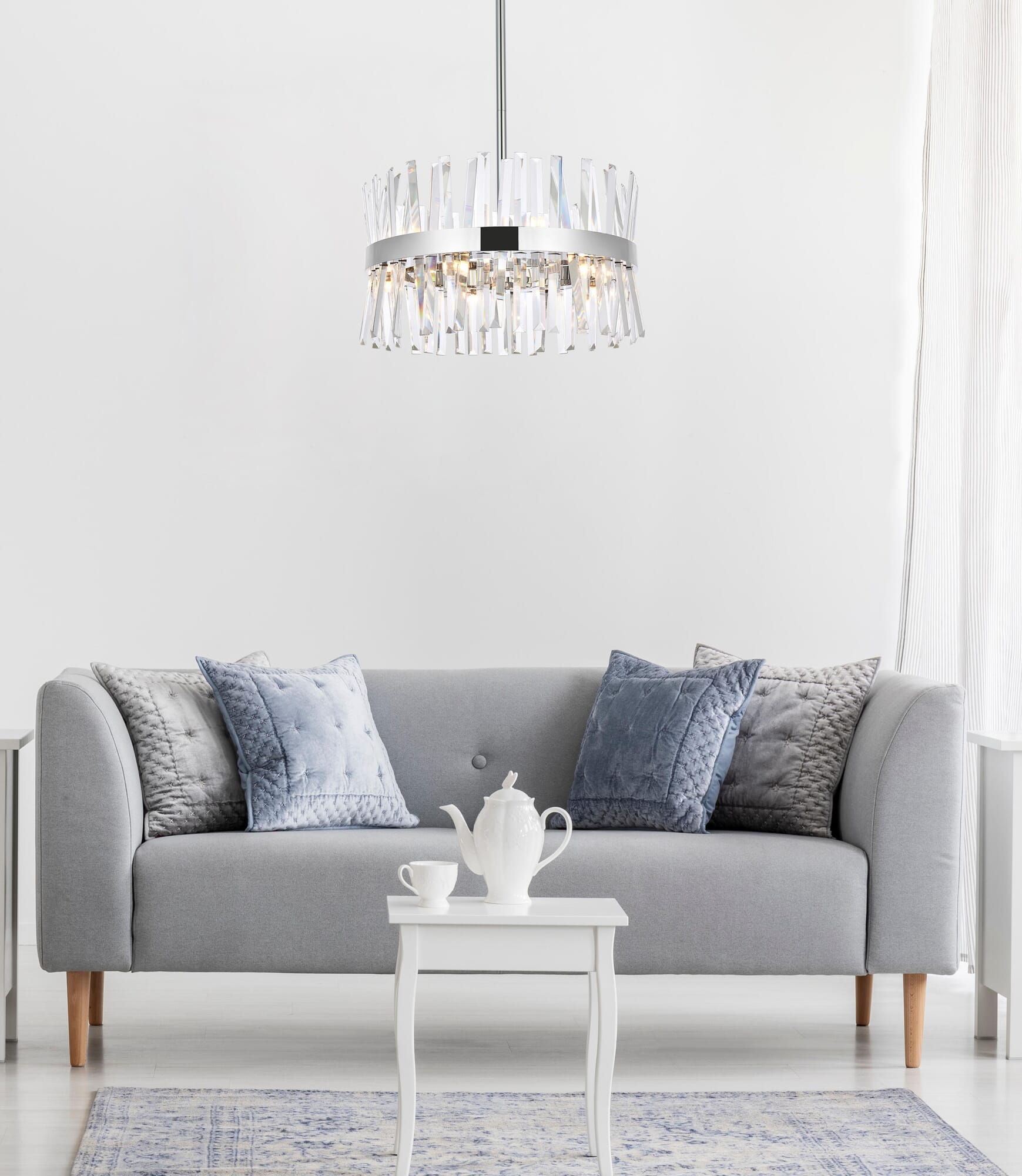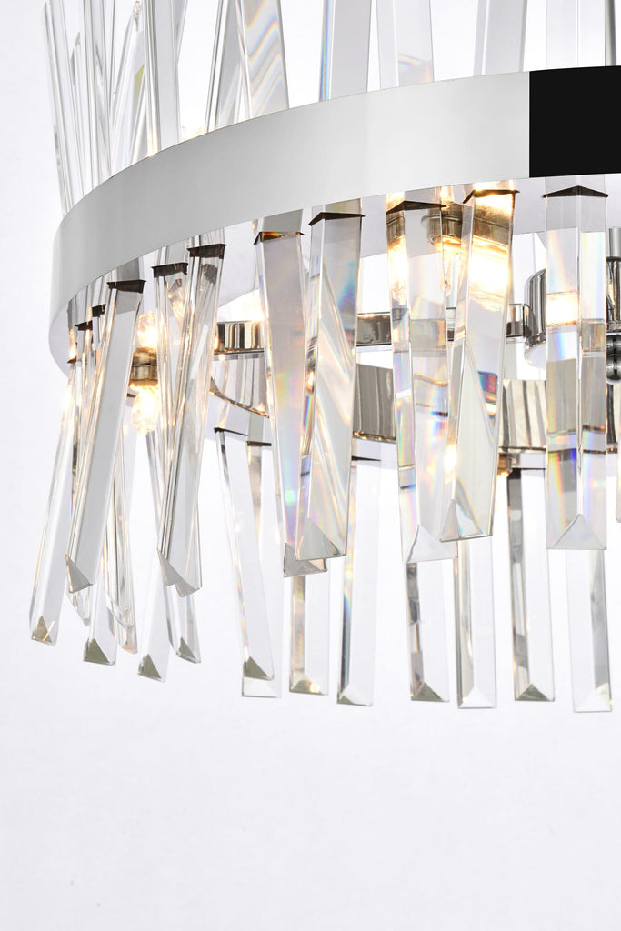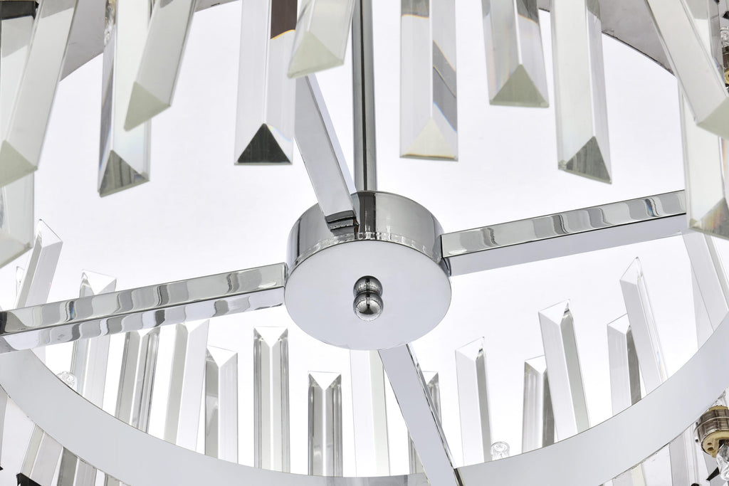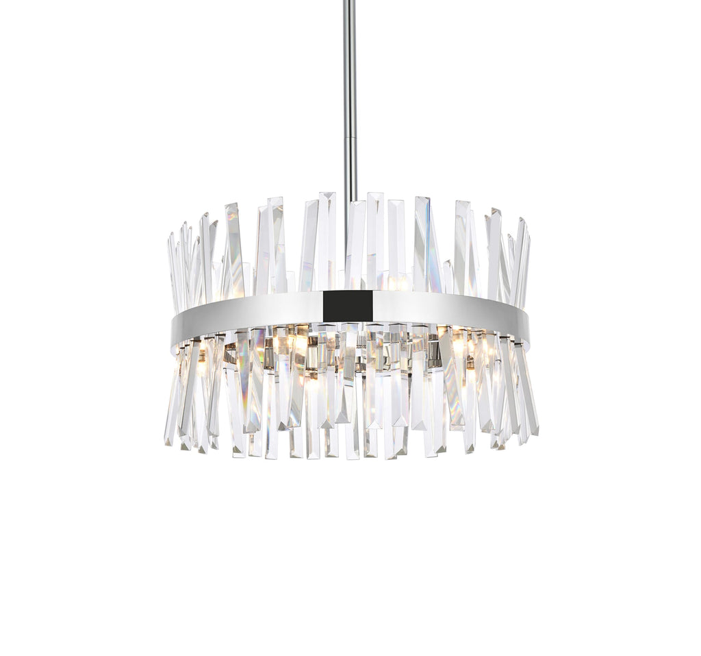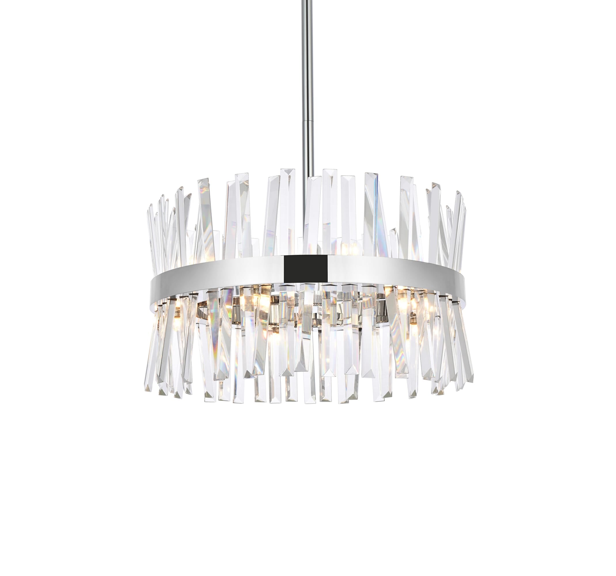 Dimensions Chain/Rod Length: 46" Length: 20" Width: 20" Height: 12" Maximum Height: 57.5" Wire Length: 75" Specifications Product Type: Pendants Hanging Device: Rod Voltage: 110V - 125V Dimmable: Yes Socket Type: G9 Number of Lights: 10 Wattage/Bulb: 20W Max/Nominal Watt: 200W Crystal/Glass Color: Clear Wire Included: Yes ETL: Yes Harware Material: Iron Fixture Material: Iron and Crystal Product Shape: Round Assembly Required: Yes Distressed Finish: No Hardware Finish: Chrome Bulb Included: No Dry/Wet/Damp: Dry Weight: 19.9 Product Warranty: 1 year limited Shipment type: small parcel