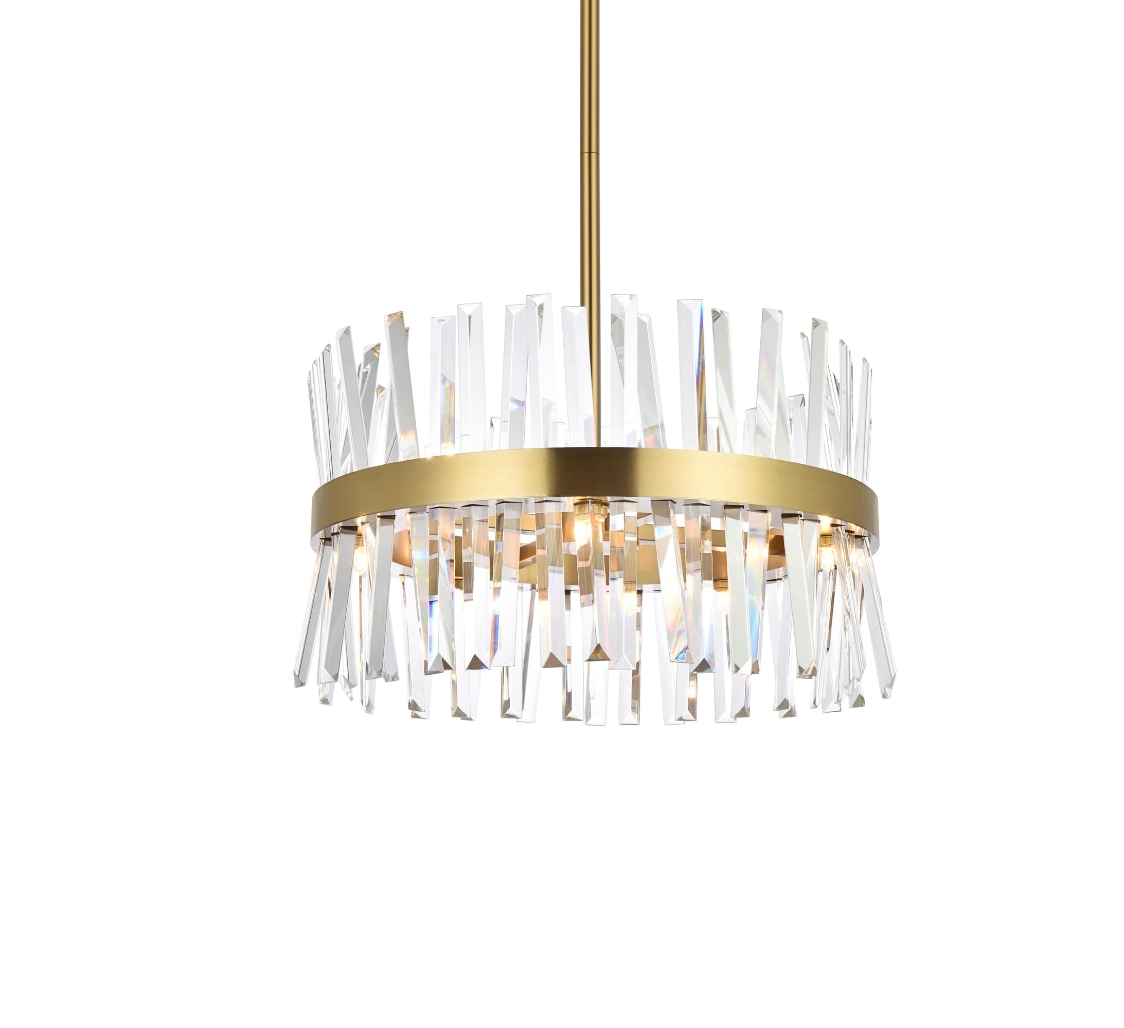 Dimensions Chain/Rod Length: 46" Length: 20" Width: 20" Height: 12" Maximum Height: 57.5" Wire Length: 75" Specifications Product Type: Pendants Hanging Device: Rod Voltage: 110V - 125V Dimmable: Yes Socket Type: G9 Number of Lights: 10 Wattage/Bulb: 20W Max/Nominal Watt: 200W Crystal/Glass Color: Clear Wire Included: Yes ETL: Yes Harware Material: Iron Fixture Material: Iron and Crystal Product Shape: Round Assembly Required: Yes Distressed Finish: No Hardware Finish: Satin Gold Bulb Included: No Dry/Wet/Damp: Dry Weight: 19.9 Product Warranty: 1 year limited Shipment type: small parcel