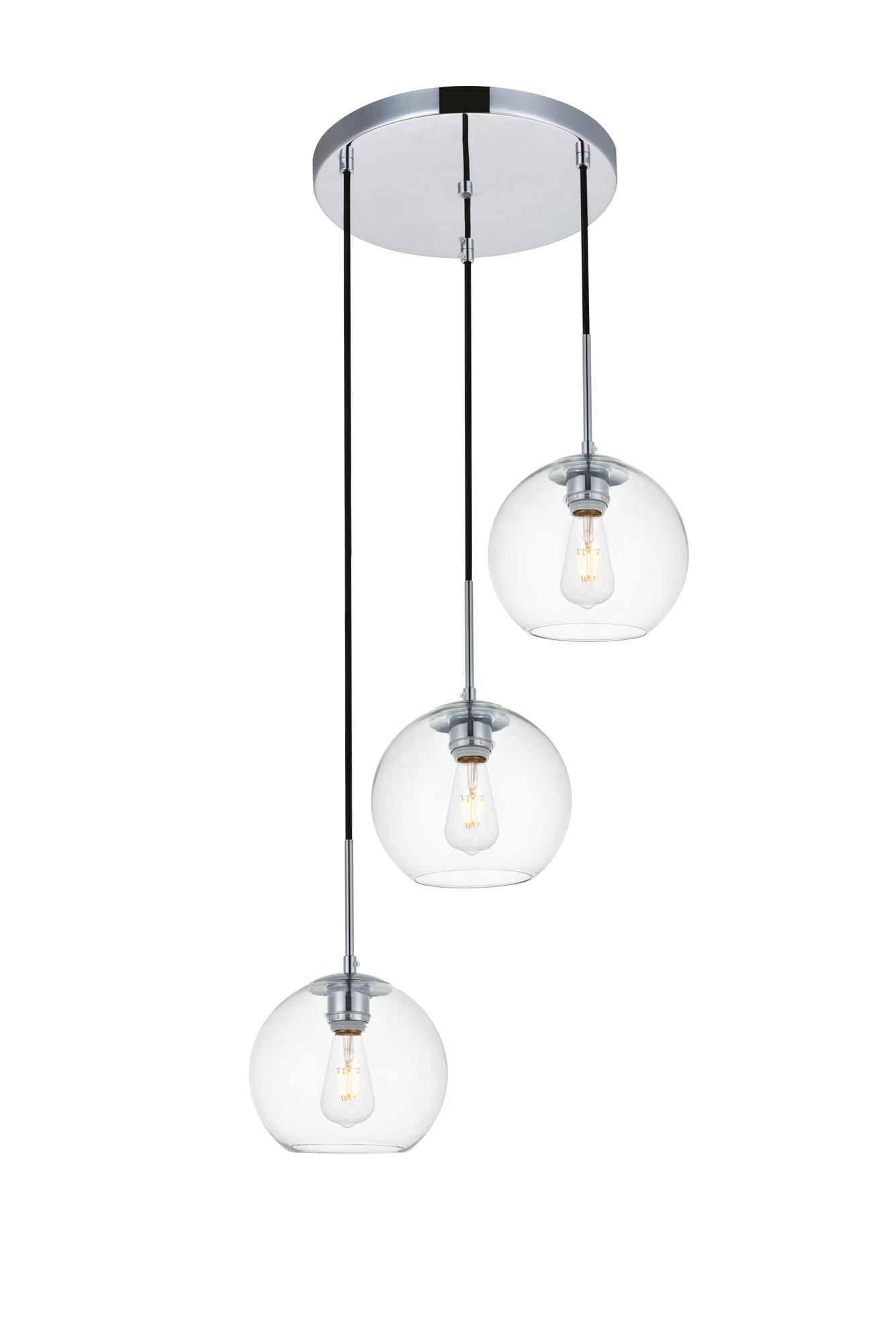 Dimensions Chain/Rod Length: 79" Length: 18.1" Width: 18.1" Height: 8" Maximum Height: 87" Wire Length: 79" Specifications Product Type: Pendants Hanging Device: Cord Voltage: 110V - 125V Dimmable: Yes Socket Type: E26 Number of Lights: 3 Wattage/Bulb: 40 Max/Nominal Watt: 120 Wire Included: Yes ETL: Yes Harware Material: Iron Fixture Material: Iron and Glass Product Shape: Pendants Assembly Required: No Hardware Finish: Chrome Dry/Wet/Damp: Dry Rated Weight: 5.8 Product Warranty: 1 year limited Shipment type: Small Parcel