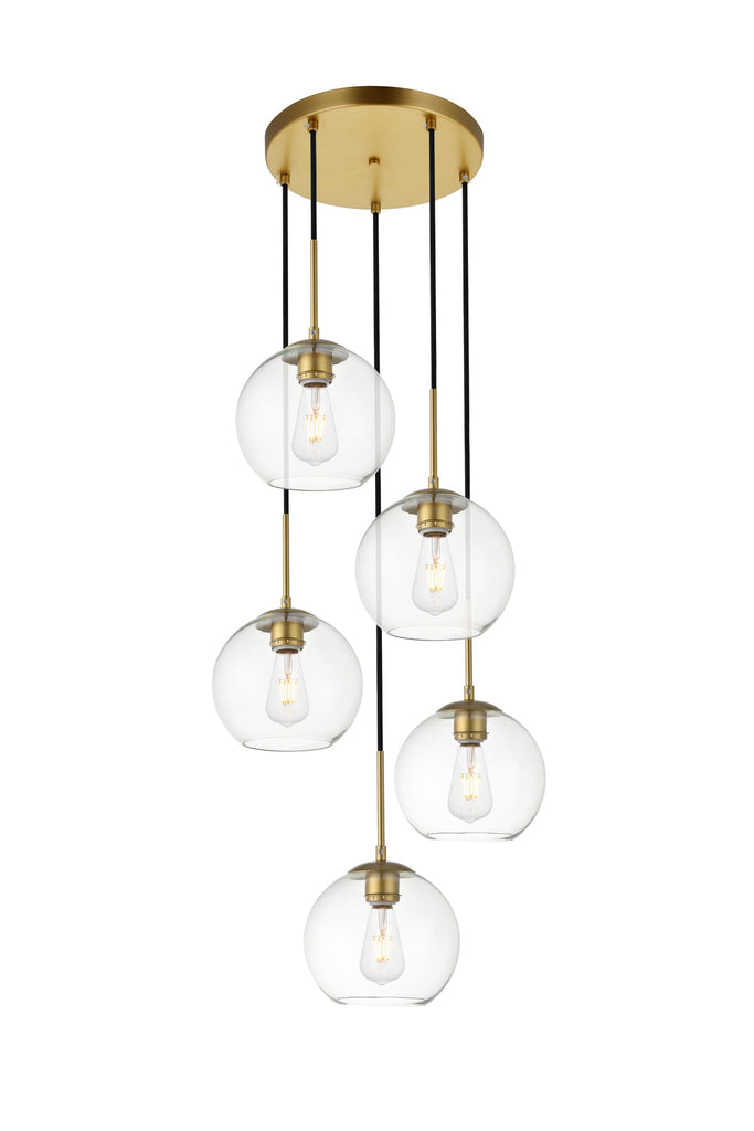 Dimensions Chain/Rod Length: 79" Length: 18.1" Width: 18.1" Height: 8" Maximum Height: 87" Wire Length: 79" Specifications Product Type: Pendants Hanging Device: Cord Voltage: 110V - 125V Dimmable: Yes Socket Type: E26 Number of Lights: 5 Wattage/Bulb: 40 Max/Nominal Watt: 200 Wire Included: Yes ETL: Yes Harware Material: Iron Fixture Material: Iron and Glass Product Shape: Pendants Assembly Required: No Hardware Finish: Brass Dry/Wet/Damp: Dry Rated Weight: 8.6 Product Warranty: 1 year limited Shipment type: Small Parcel