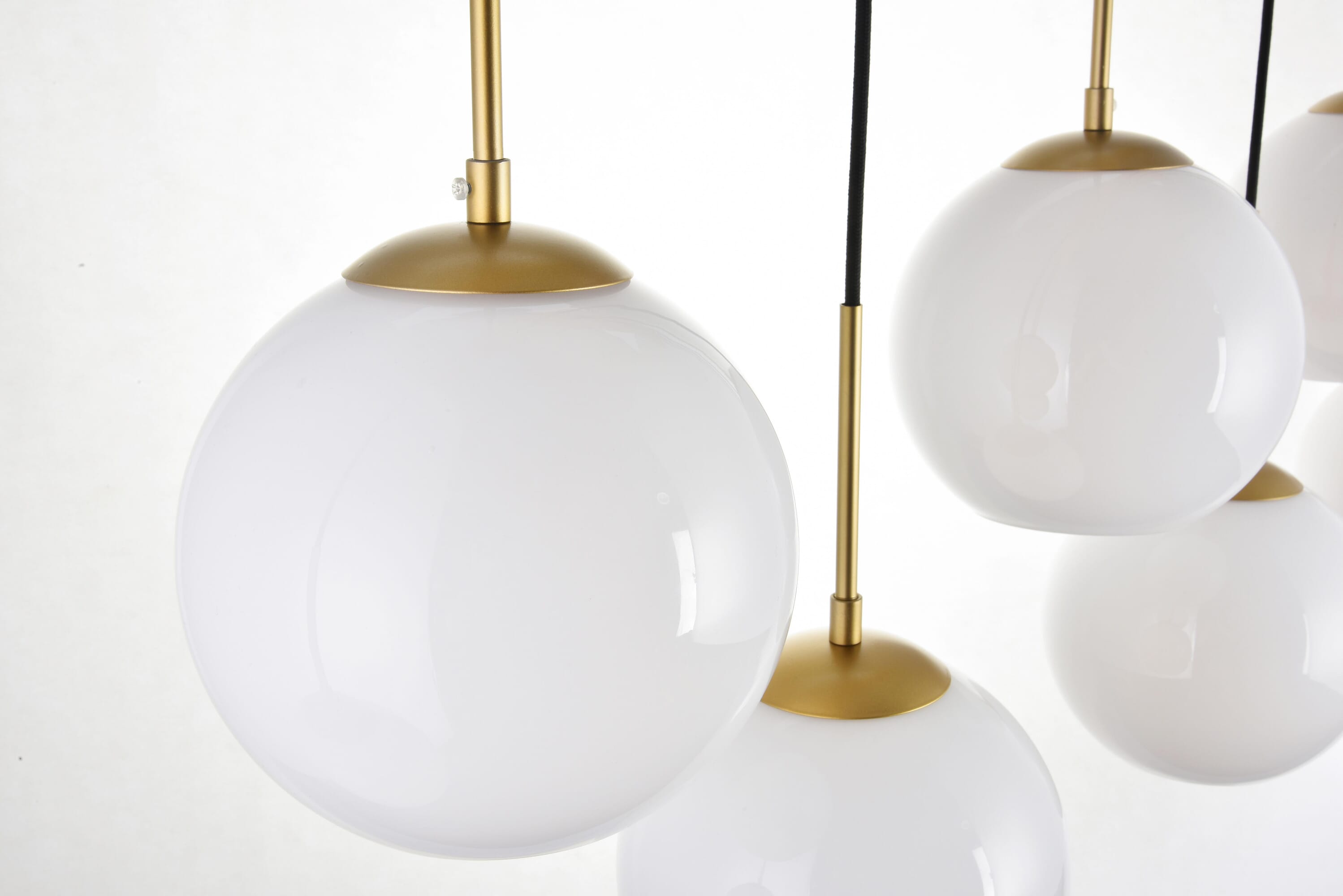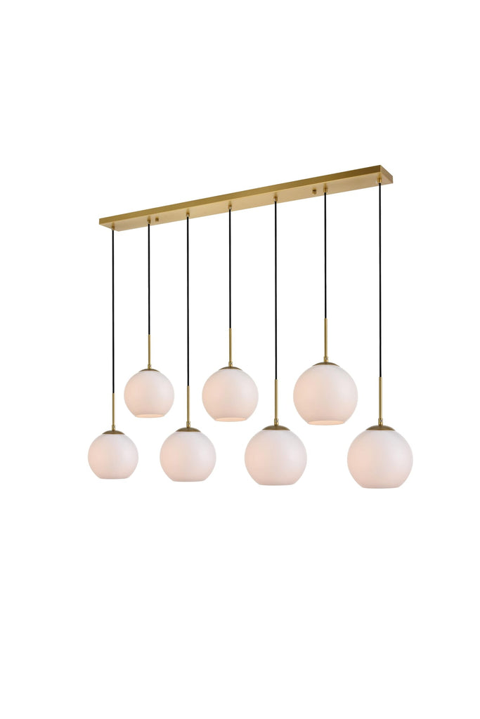 Dimensions Chain/Rod Length: 79" Length: 53.9" Width: 7.9" Height: 8" Maximum Height: 87" Wire Length: 79" Specifications Product Type: Pendants Hanging Device: Cord Voltage: 110V - 125V Dimmable: Yes Socket Type: E26 Number of Lights: 7 Wattage/Bulb: 40 Max/Nominal Watt: 280 Wire Included: Yes ETL: Yes Harware Material: Iron Fixture Material: Iron and Glass Product Shape: Pendants Assembly Required: No Hardware Finish: Brass Weight: 16.5 Product Warranty: 1 year limited Shipment type: Small Parcel