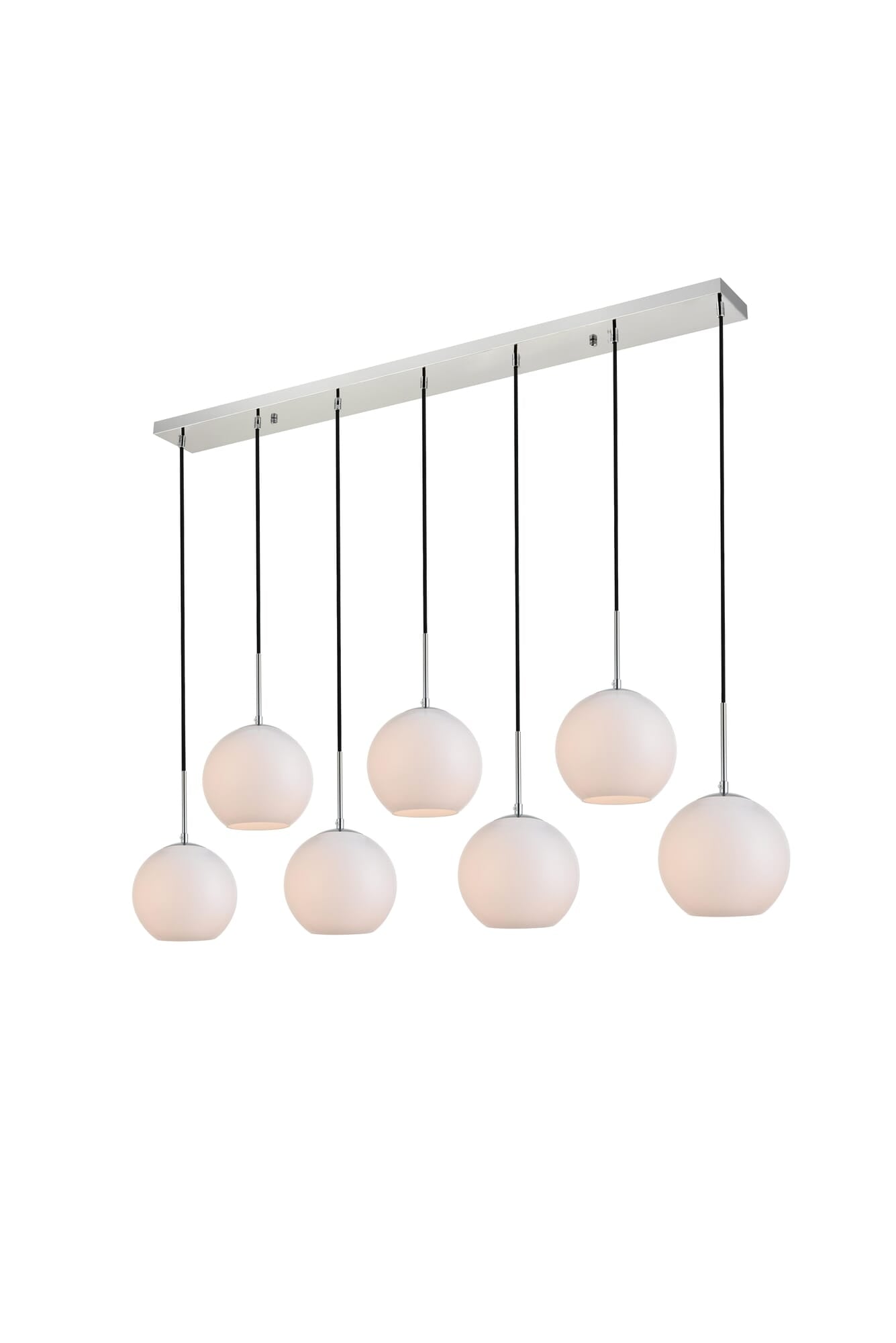 Dimensions Chain/Rod Length: 79" Length: 53.9" Width: 7.9" Height: 8" Maximum Height: 87" Wire Length: 79" Specifications Product Type: Pendants Hanging Device: Cord Voltage: 110V - 125V Dimmable: Yes Socket Type: E26 Number of Lights: 7 Wattage/Bulb: 40 Max/Nominal Watt: 280 Wire Included: Yes ETL: Yes Harware Material: Iron Fixture Material: Iron and Glass Product Shape: Pendants Assembly Required: No Hardware Finish: Chrome Weight: 16.5 Product Warranty: 1 year limited Shipment type: Small Parcel