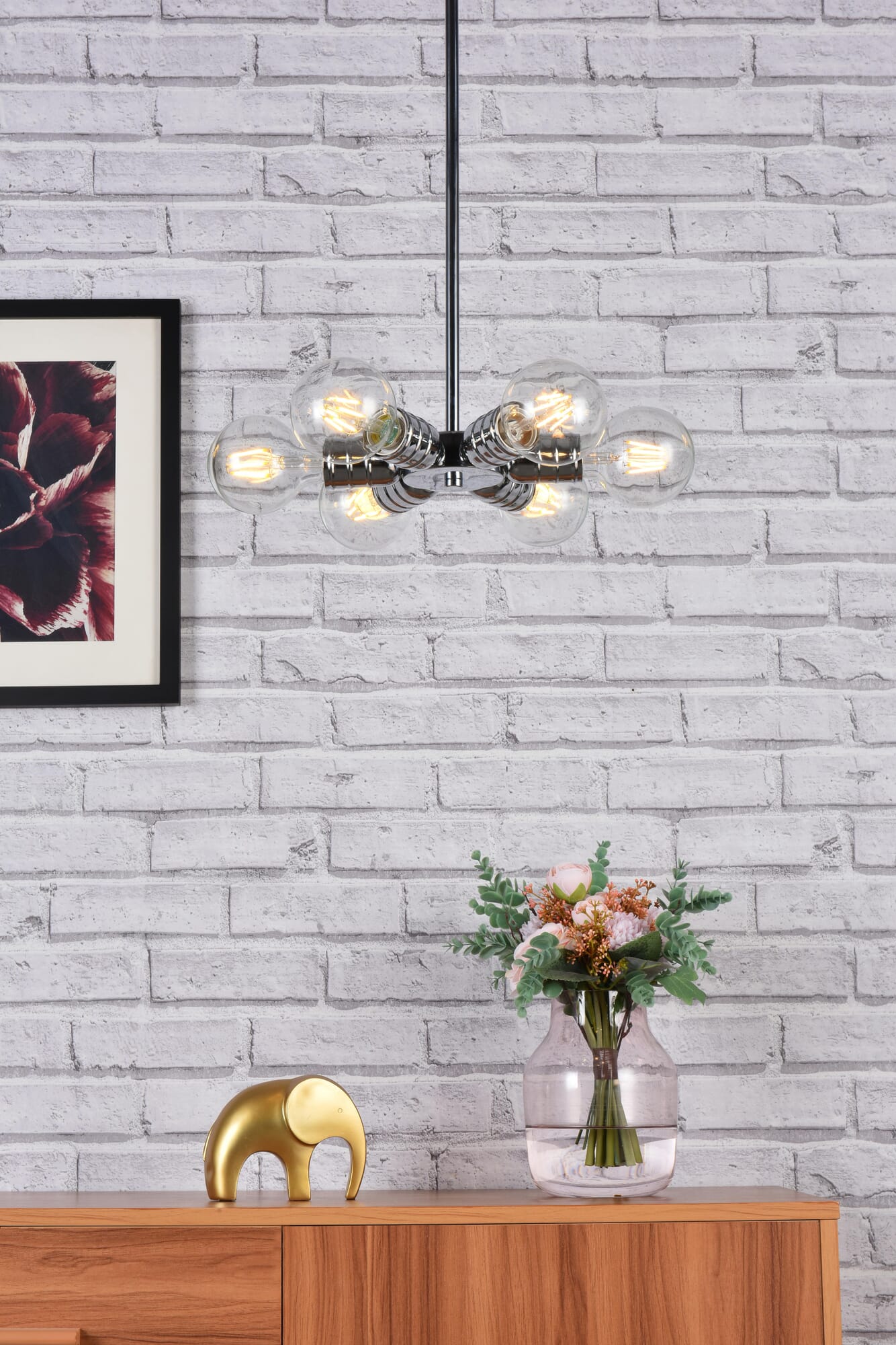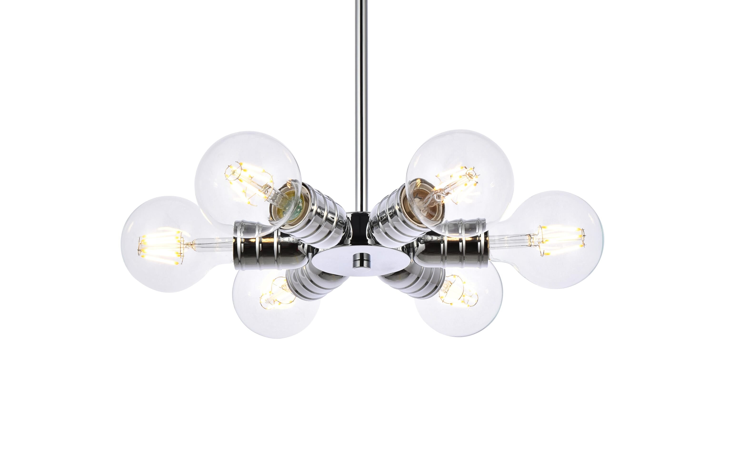 Dimensions Chain/Rod Length: 46" Length: 8.3" Width: 8.3" Height: 1.7" Maximum Height: 48.7" Wire Length: 59" Specifications Product Type: Pendants Hanging Device: Rod Voltage: 110V - 125V Dimmable: Yes Socket Type: E26 Number of Lights: 6 Wattage/Bulb: 40W Max/Nominal Watt: 240W Wire Included: Yes ETL: YES Harware Material: Iron Fixture Material: Iron Product Shape: Geometric Assembly Required: No Distressed Finish: NO Hardware Finish: chrome Bulb Included: Not Included Dry/Wet/Damp: Damp Weight: 2.2 Product Warranty: 1 year limited Shipment type: Small parcel