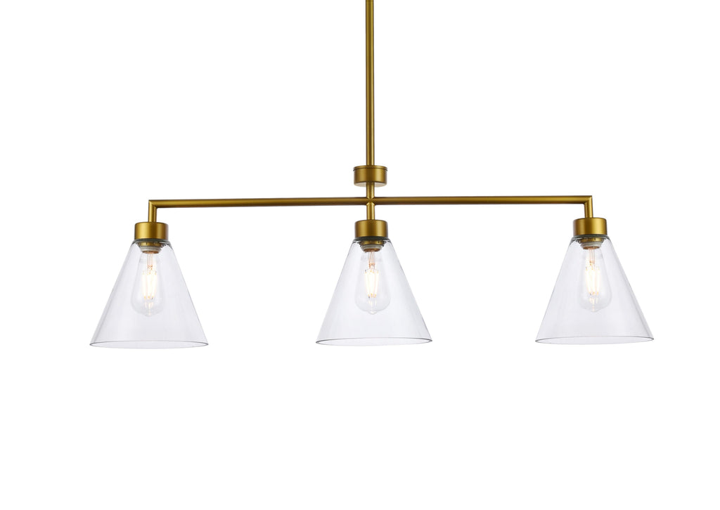 Dimensions Chain/Rod Length: 46" Length: 38" Width: 7.9" Height: 11.9" Maximum Height: 58.9" Wire Length: 59" Specifications Product Type: Pendants Hanging Device: Rod Voltage: 110V - 125V Dimmable: Yes Socket Type: E26 Number of Lights: 3 Wattage/Bulb: 40W Max/Nominal Watt: 120W Wire Included: Yes ETL: YES Harware Material: Iron Fixture Material: Iron and Glass Product Shape: Cone Assembly Required: No Distressed Finish: NO Hardware Finish: brass Bulb Included: Not Included Dry/Wet/Damp: Damp Weight: 7.9 Product Warranty: 1 year limited Shipment type: Small parcel