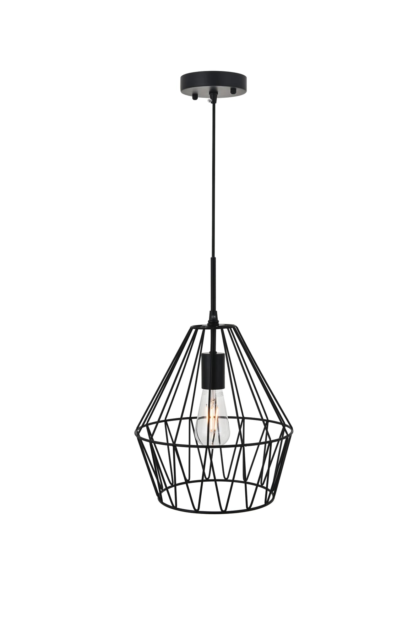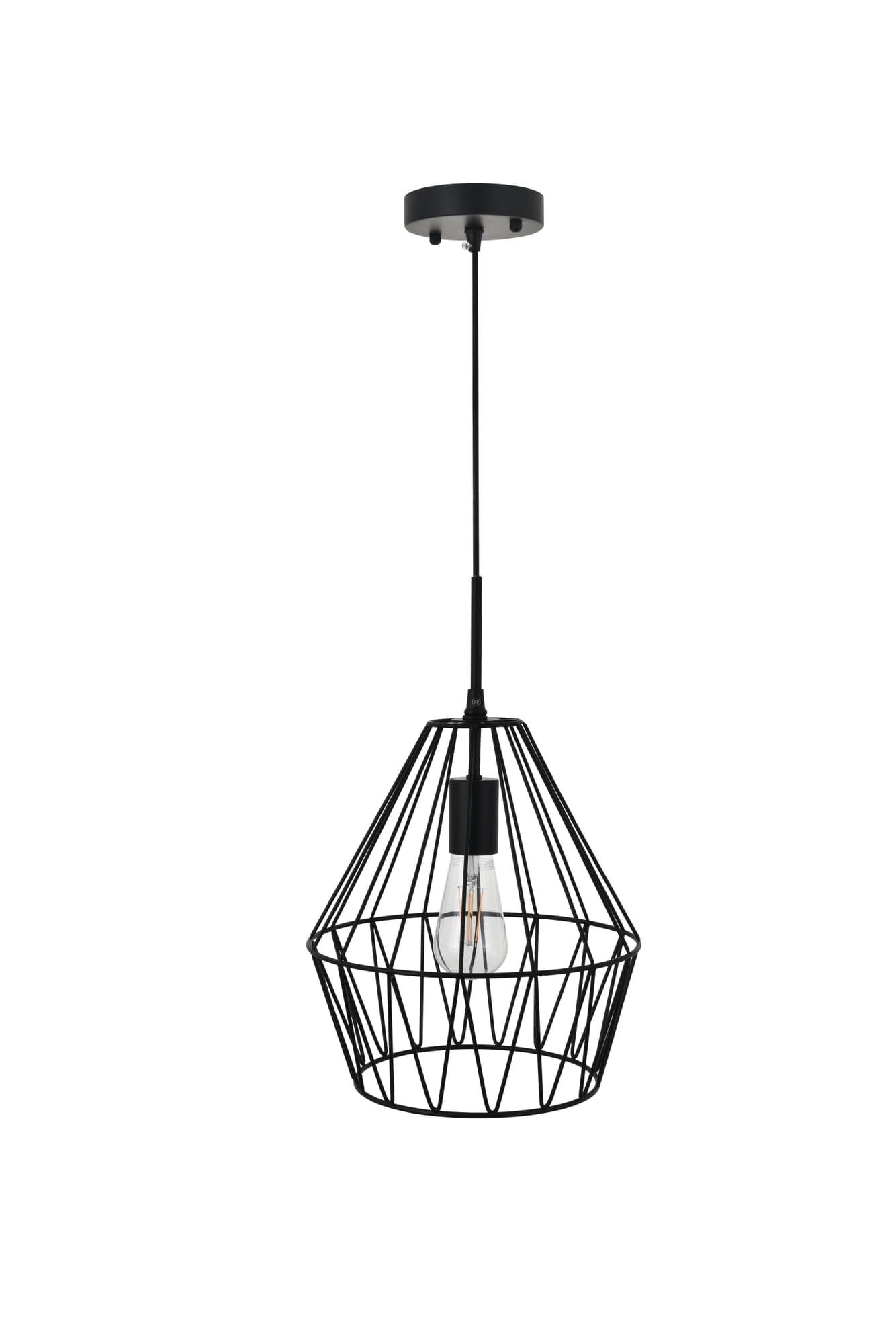 Dimensions Chain/Rod Length: 59" Length: 11.2" Width: 11.2" Height: 13.2" Maximum Height: 78" Wire Length: 59" Specifications Product Type: Pendants Hanging Device: Cord Voltage: 110V - 125V Dimmable: Yes Socket Type: E26 Number of Lights: 1 Wattage/Bulb: 40W Max/Nominal Watt: 40w Wire Included: Yes ETL: ETL Harware Material: metal Fixture Material: Metal Product Shape: Pendants Assembly Required: yes Distressed Finish: no Hardware Finish: Black UL & ULC Standard: No Dry/Wet/Damp: Dry Weight: 2.2 Product Warranty: 1 year limited Shipment type: Small Parcel