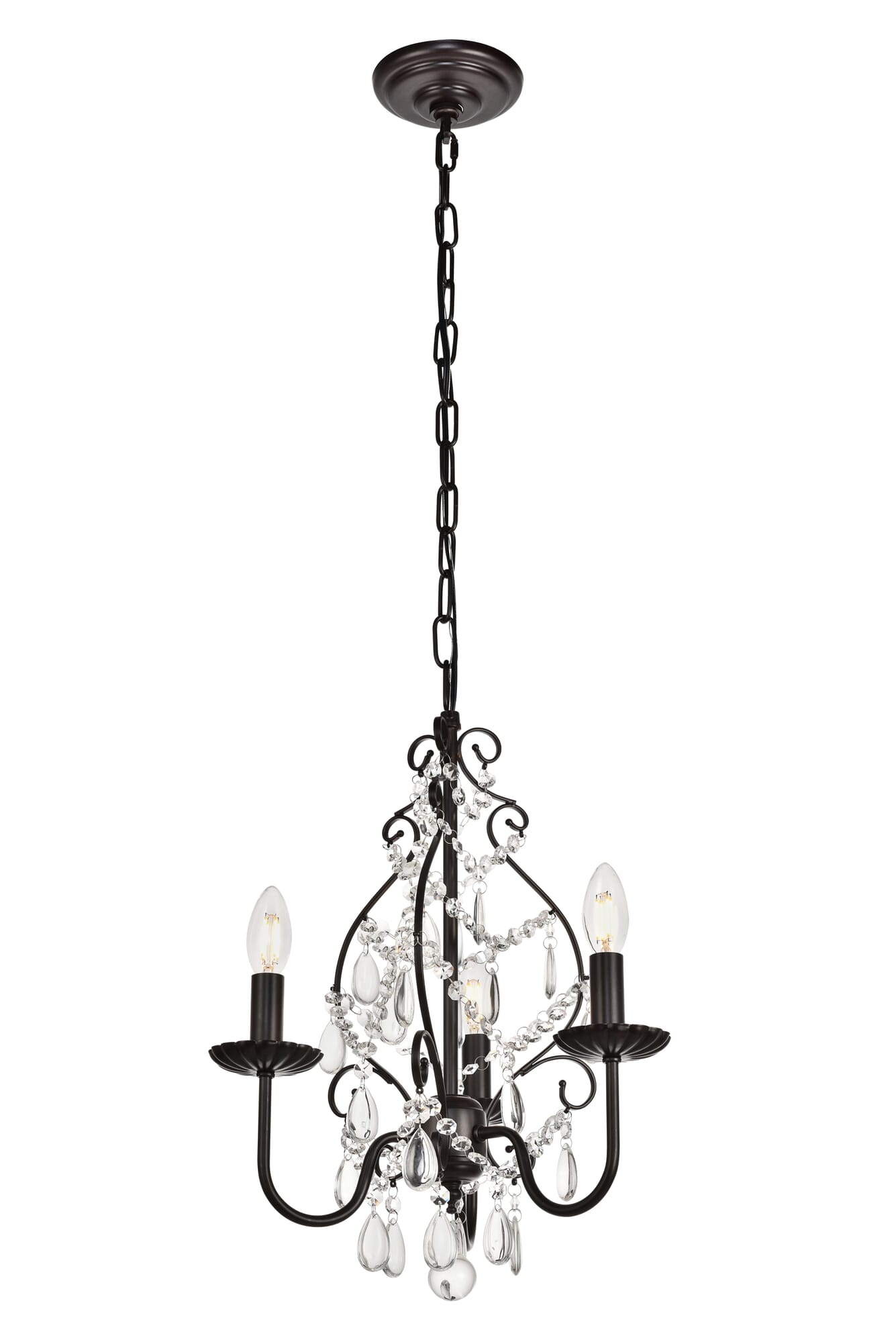 Dimensions Chain/Rod Length: 59" Length: 15" Width: 15" Height: 20" Maximum Height: 81" Wire Length: 79" Specifications Product Type: Pendants Hanging Device: Chain Voltage: 110V - 125V Dimmable: Yes Socket Type: E12 Number of Lights: 3 Wattage/Bulb: 40 Max/Nominal Watt: 120W Crystal/Glass Color: CLEAR Wire Included: Yes Bulb Shape: B10 Harware Material: Iron Fixture Material: Iron and Crystal Product Shape: Pendants Assembly Required: Yes Hardware Finish: Oil rubbed bronze Bulb Included: No UL & ULC Standard: UL,ULC Dry/Wet/Damp: Dry Rated Weight: 4.8 Product Warranty: 1 year limited Shipment type: Small Parcel