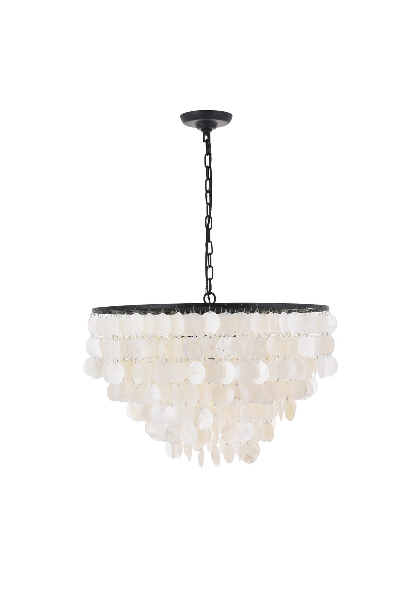 Dimensions Chain/Rod Length: 59" Length: 25.6" Width: 25.6" Height: 17.5" Maximum Height: 77.8" Wire Length: 79" Specifications Product Type: Pendants Hanging Device: Chain Voltage: 120V Dimmable: Yes Socket Type: E12 Number of Lights: 6 Wattage/Bulb: 40W Max/Nominal Watt: 240W Wire Included: Yes Bulb Shape: B10 ETL: no Harware Material: Iron Fixture Material: Iron and Shell Product Shape: Pendants Assembly Required: YES Hardware Finish: Black UL & ULC Standard: UL Dry/Wet/Damp: Dry Weight: 11.1 Product Warranty: 1 year limited Shipment type: Small Parcel