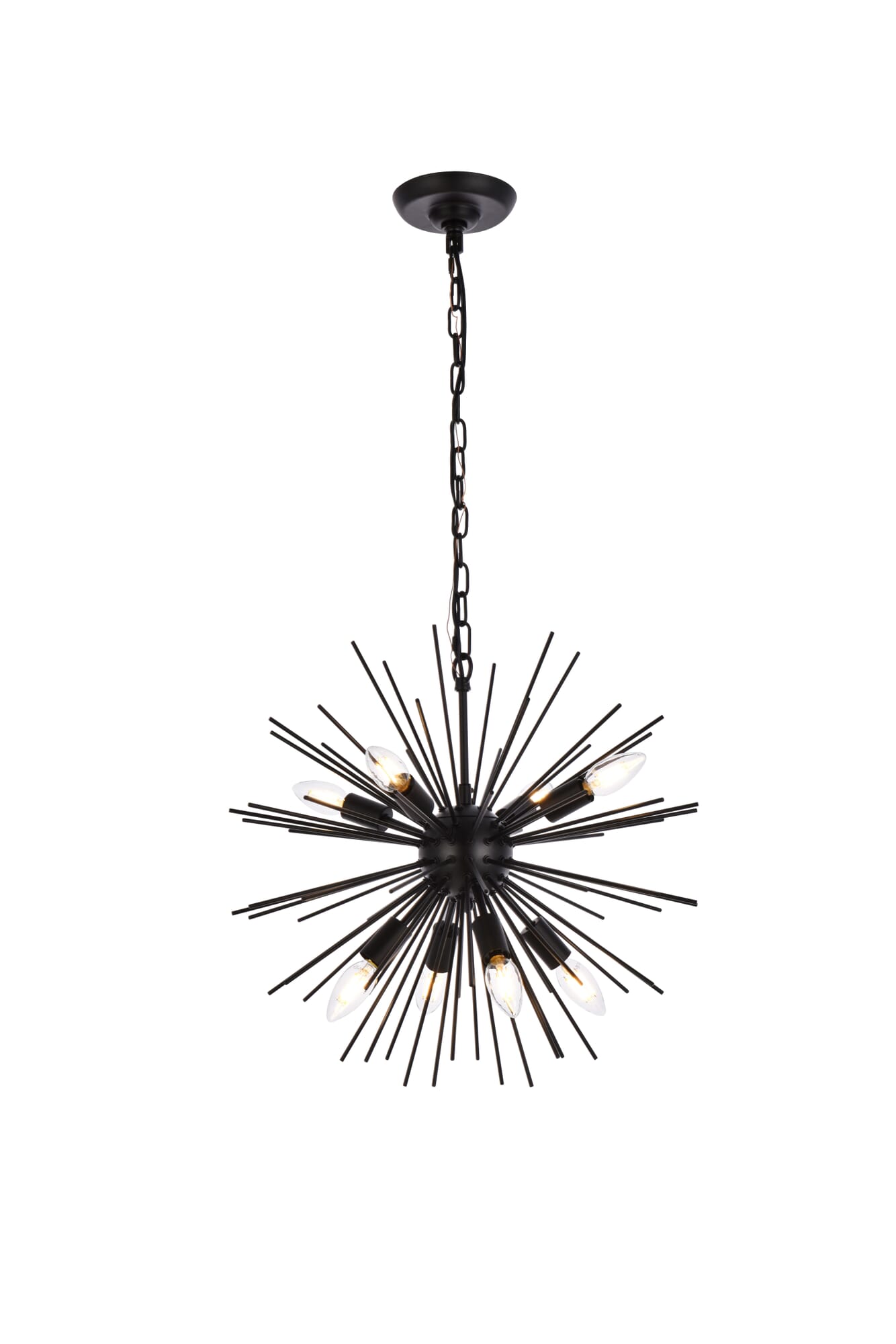 Dimensions Chain/Rod Length: 59" Length: 20" Width: 20" Height: 18.1" Maximum Height: 78.3" Wire Length: 79" Specifications Product Type: Pendants Hanging Device: Chain Voltage: 120V Dimmable: Yes Socket Type: E12 Number of Lights: 8 Wattage/Bulb: 40W Max/Nominal Watt: 320W Wire Included: Yes ETL: YES Harware Material: iron Fixture Material: Iron Product Shape: Round Assembly Required: YES Hardware Finish: Black Bulb Included: No Dry/Wet/Damp: Damp Weight: 7.1 Product Warranty: 1 year limited Shipment type: Small Parcel