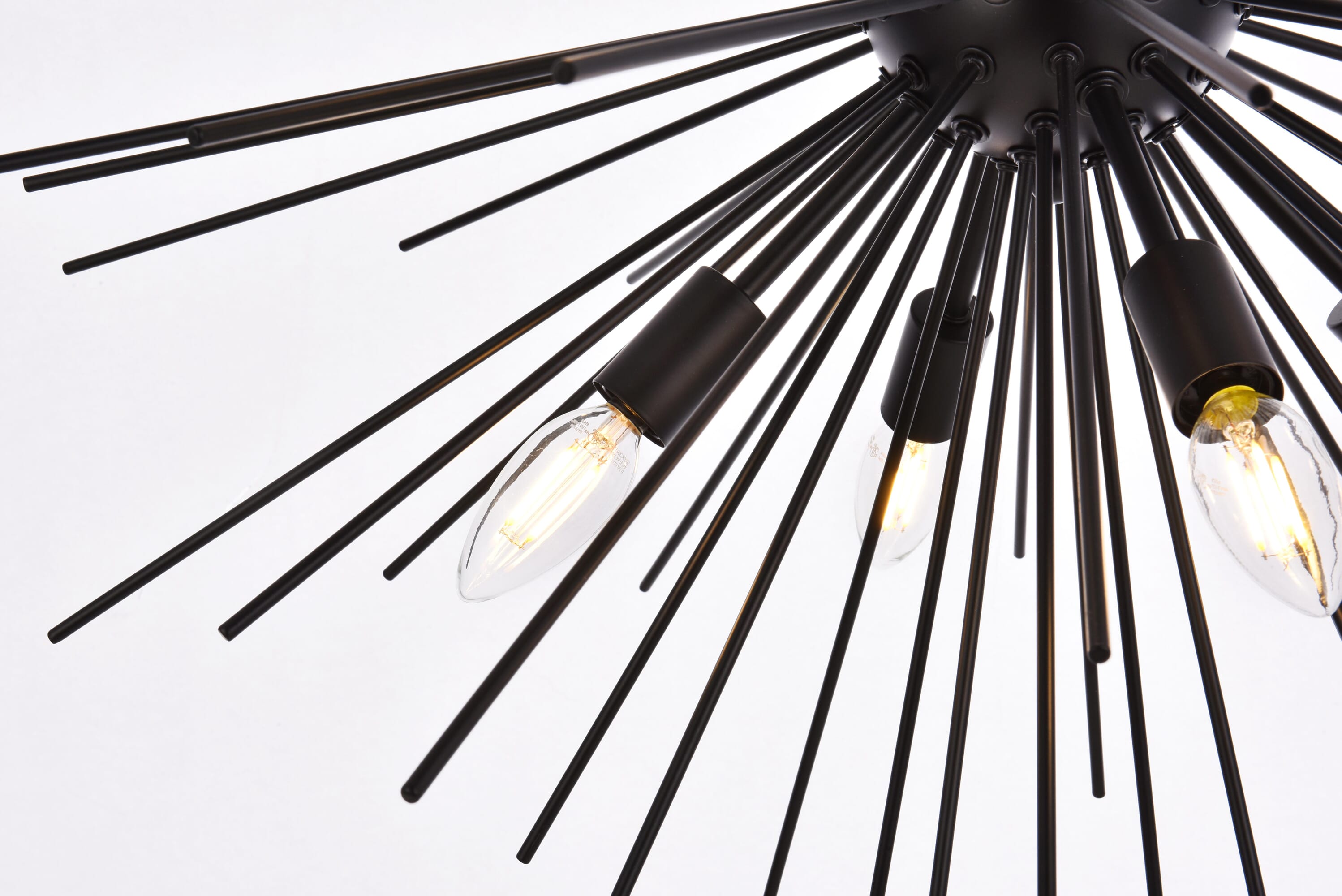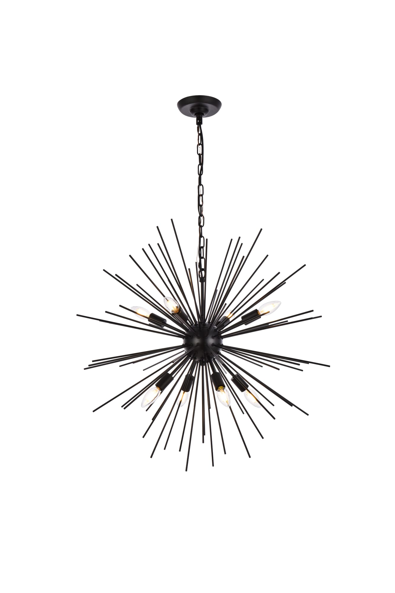 Dimensions Chain/Rod Length: 59" Length: 30" Width: 30" Height: 29" Maximum Height: 89.3" Wire Length: 79" Specifications Product Type: Pendants Hanging Device: Chain Voltage: 120V Dimmable: Yes Socket Type: E12 Number of Lights: 8 Wattage/Bulb: 40W Max/Nominal Watt: 320W Wire Included: Yes ETL: YES Harware Material: iron Fixture Material: Iron Product Shape: Round Assembly Required: YES Hardware Finish: Black Bulb Included: No Dry/Wet/Damp: Damp Weight: 11.9 Product Warranty: 1 year limited Shipment type: Small Parcel