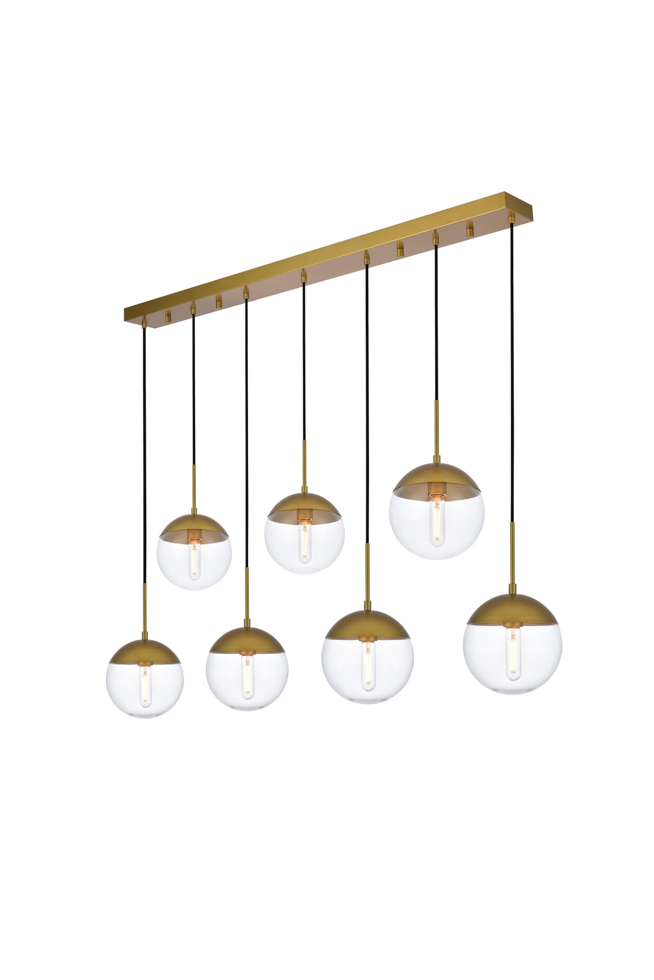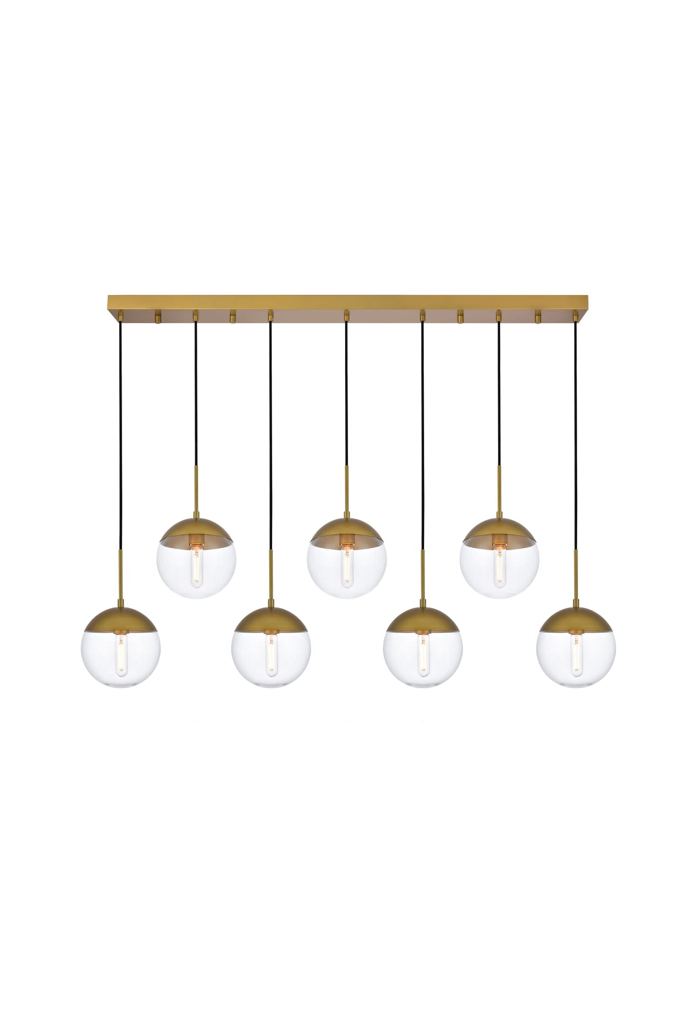 Dimensions Length: 54" Width: 8" Height: 9" Maximum Height: 82" Wire Length: 78.5" Specifications Product Type: Pendants Hanging Device: Black Fabric Cord Voltage: 110V - 125V Dimmable: Yes Socket Type: E26 Number of Lights: 7 Wattage/Bulb: 40 Max/Nominal Watt: 280 Wire Included: Yes Harware Material: Metal Fixture Material: Metal and Glass Product Shape: Pendants Assembly Required: No Hardware Finish: Brass UL & ULC Standard: UL,ULC Weight: 24 Product Warranty: 1 year limited Shipment type: Small Parcel