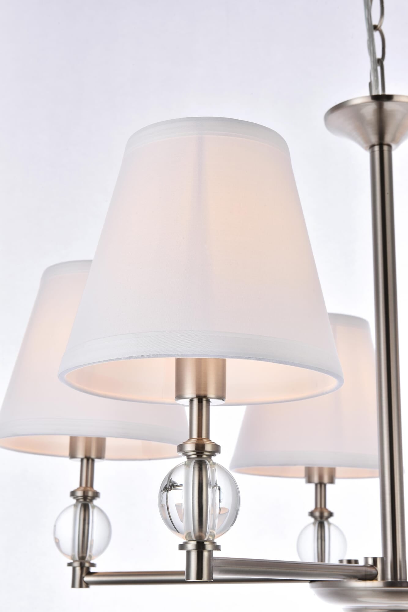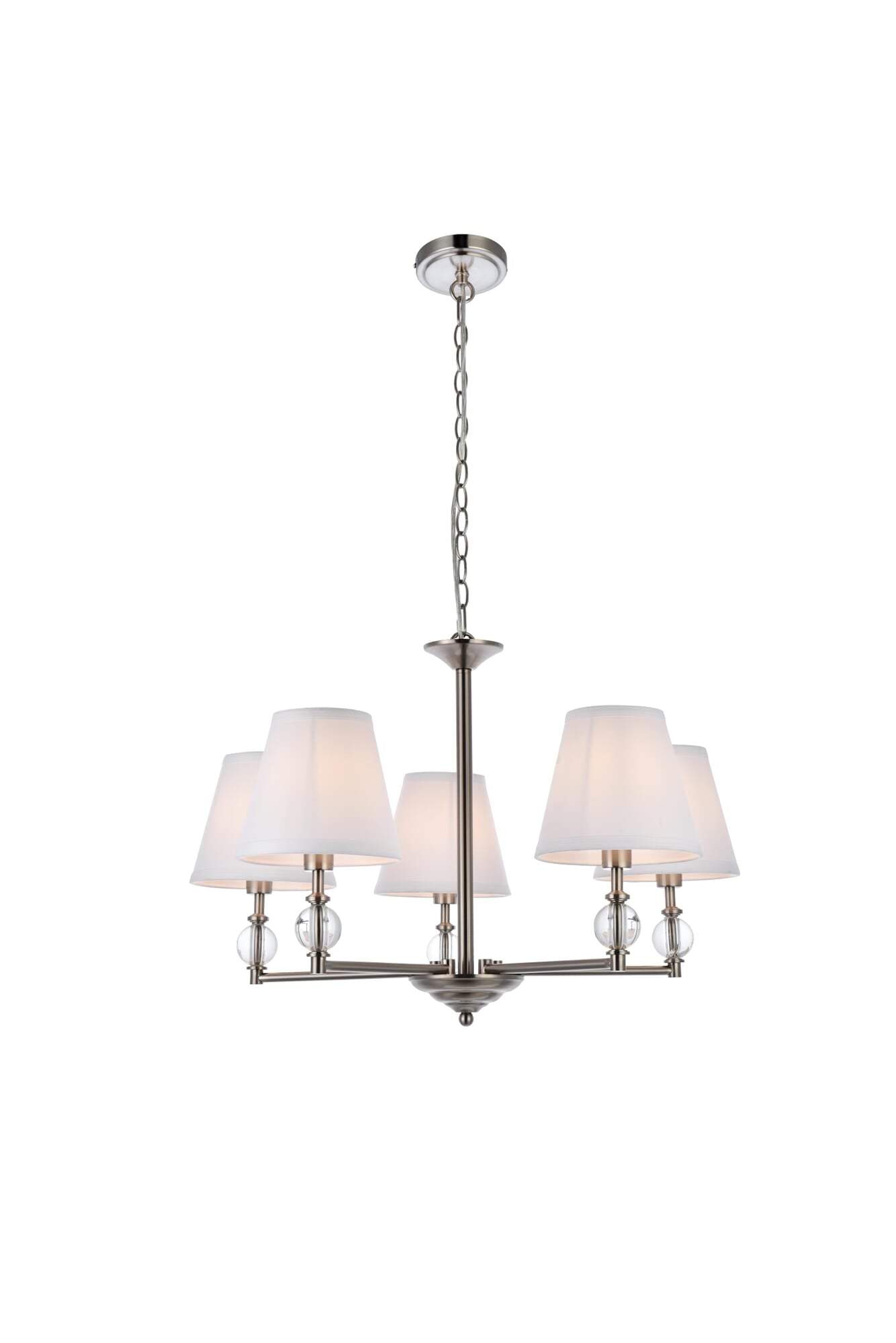 Dimensions Chain/Rod Length: 59" Length: 27.5" Width: 27.5" Height: 19.1" Maximum Height: 84.1" Wire Length: 78.7" Specifications Product Type: Pendants Hanging Device: Chain Voltage: 110V Dimmable: Yes Socket Type: E12 Number of Lights: 5 Wattage/Bulb: 40W Max/Nominal Watt: 200W Crystal/Glass Color: Clear Wire Included: Yes ETL: yes Harware Material: Iron Fixture Material: Metal, Crystal, and Fabric Shade Product Shape: Pendants Assembly Required: No Distressed Finish: No Hardware Finish: satin nickel Bulb Included: No Dry/Wet/Damp: Damp Weight: 7.7 Product Warranty: 1 year limited Shipment type: Small Parcel