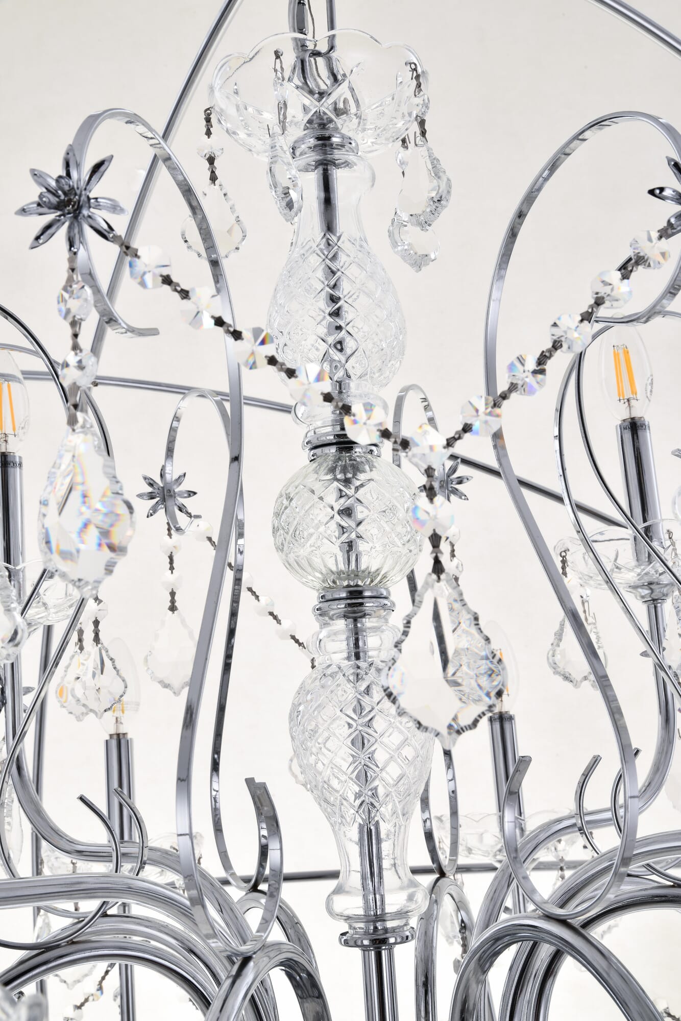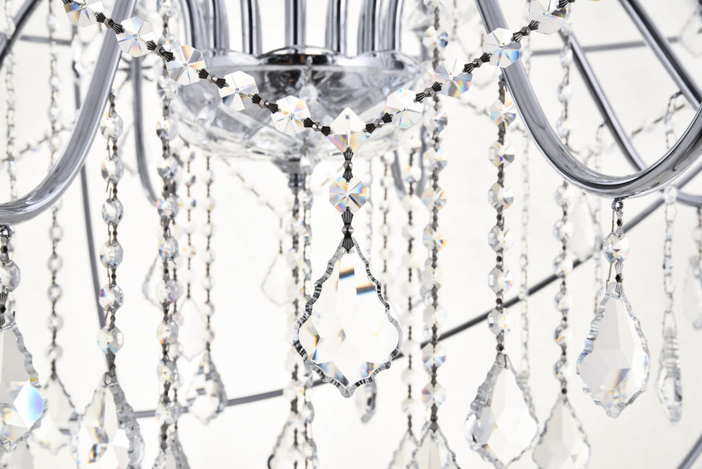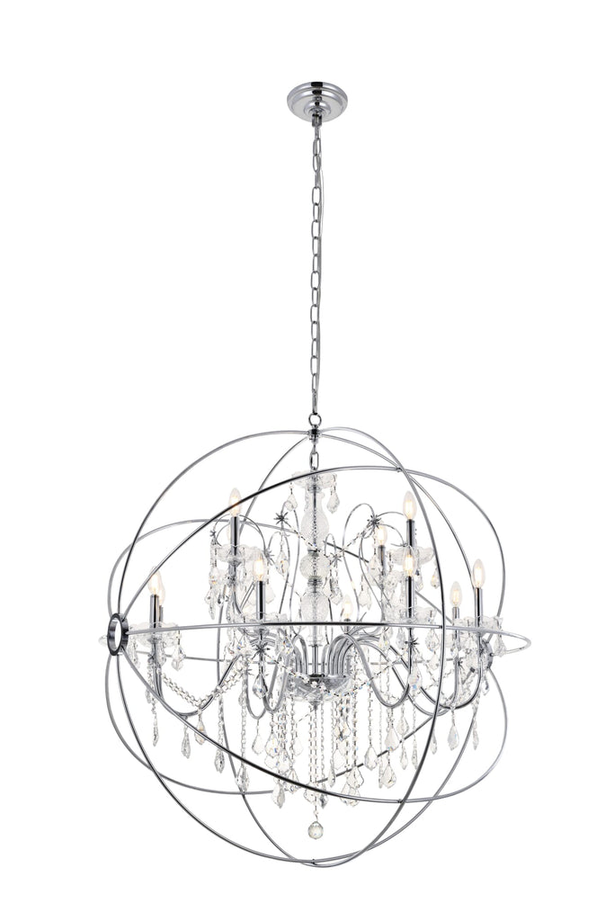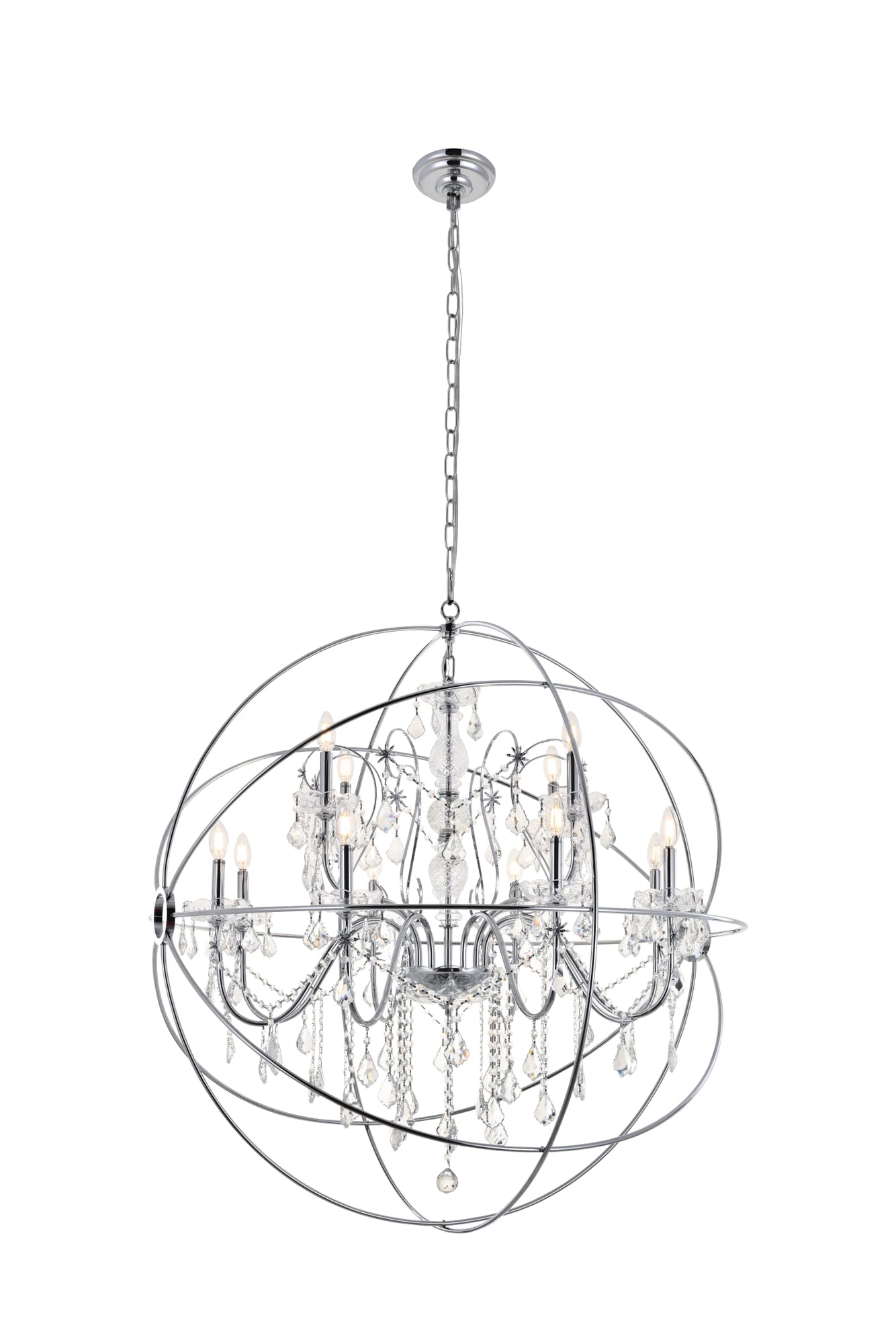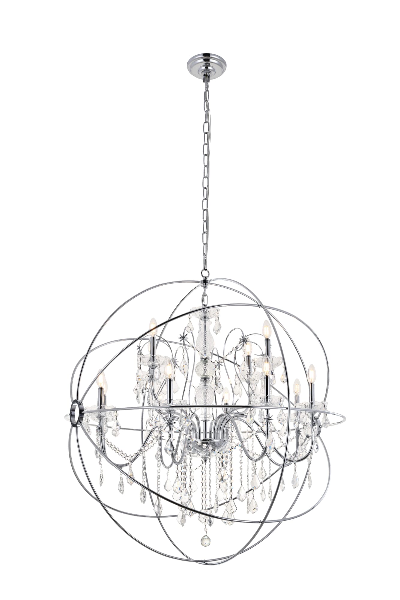 Dimensions Chain/Rod Length: 79" Length: 43.5" Width: 43.5" Height: 46" Maximum Height: 106.2" Wire Length: 79" Specifications Product Type: Pendants Hanging Device: Chain Dimmable: Yes Socket Type: E12 Number of Lights: 12 Wattage/Bulb: 40W Max/Nominal Watt: 480W Crystal/Glass Color: CLEAR Wire Included: Yes Bulb Shape: B10 Harware Material: IRON Fixture Material: Metal and Crystal Product Shape: Round Assembly Required: YES Distressed Finish: no Hardware Finish: Chrome Bulb Included: No UL & ULC Standard: Yes Dry/Wet/Damp: Dry Weight: 36.7 Product Warranty: 1 year limited Shipment type: Oversized Ground