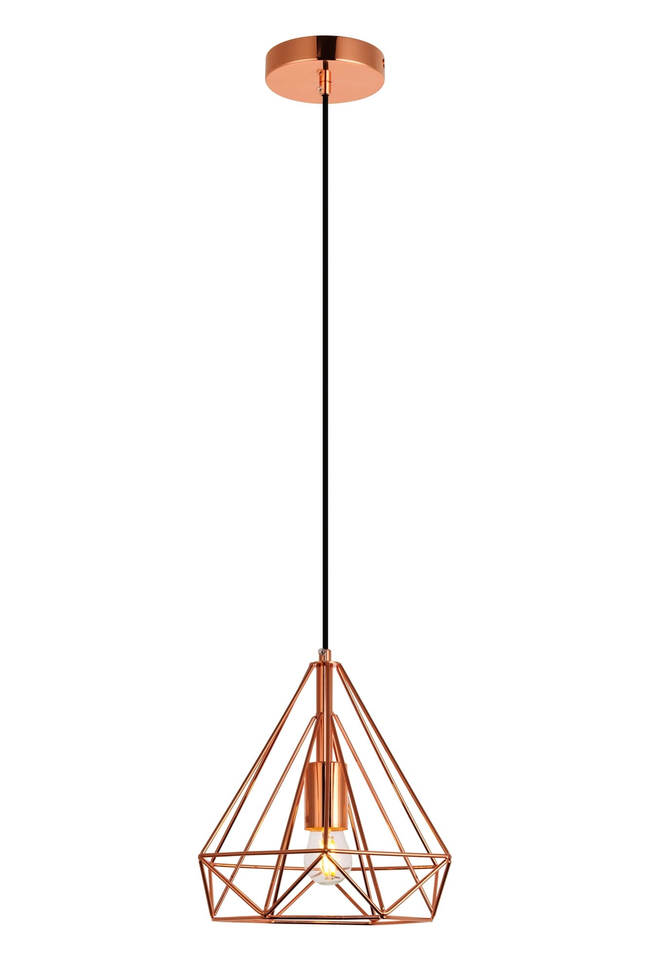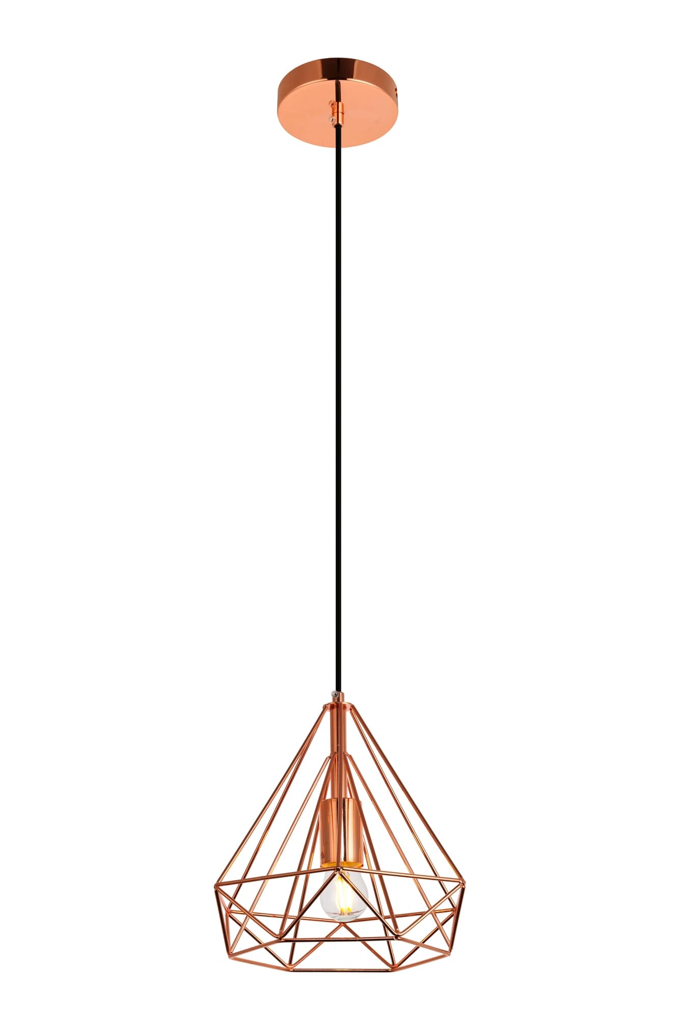 Dimensions Chain/Rod Length: 60" Length: 9.8" Width: 9.8" Height: 9.8" Maximum Height: 70" Wire Length: 60" Specifications Product Type: Pendants Hanging Device: Cord Voltage: 110V - 125V Dimmable: Yes Socket Type: E26 Number of Lights: 1 Wattage/Bulb: 40 Max/Nominal Watt: 40 Wire Included: Yes Bulb Shape: Medium; Bulb Not Provided Harware Material: Iron Fixture Material: Iron Product Shape: Pendants Assembly Required: No Hardware Finish: Copper Bulb Included: No UL & ULC Standard: UL,ULC Dry/Wet/Damp: Dry Rated Weight: 1.7 Product Warranty: 1 year limited Shipment type: Small Parcel