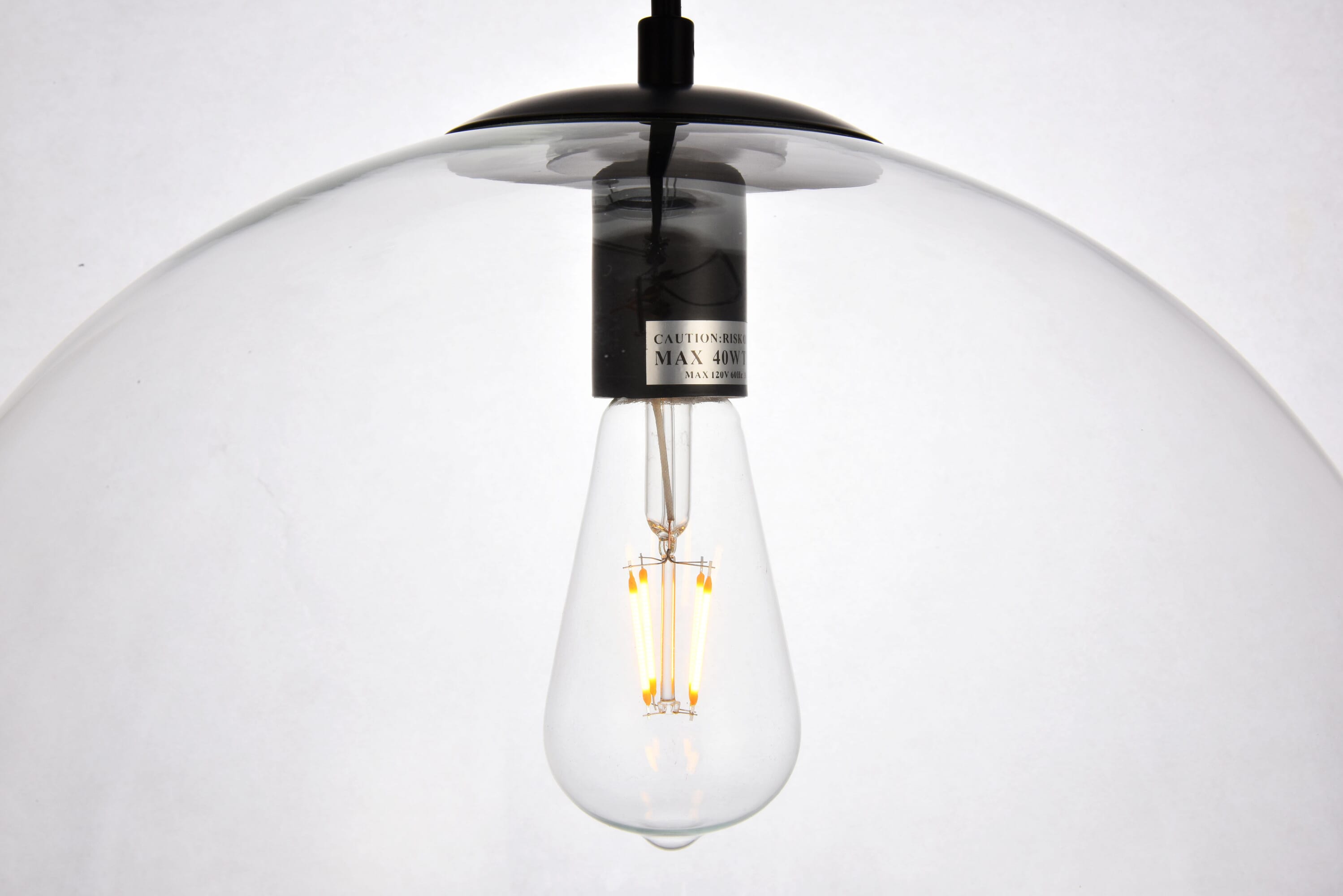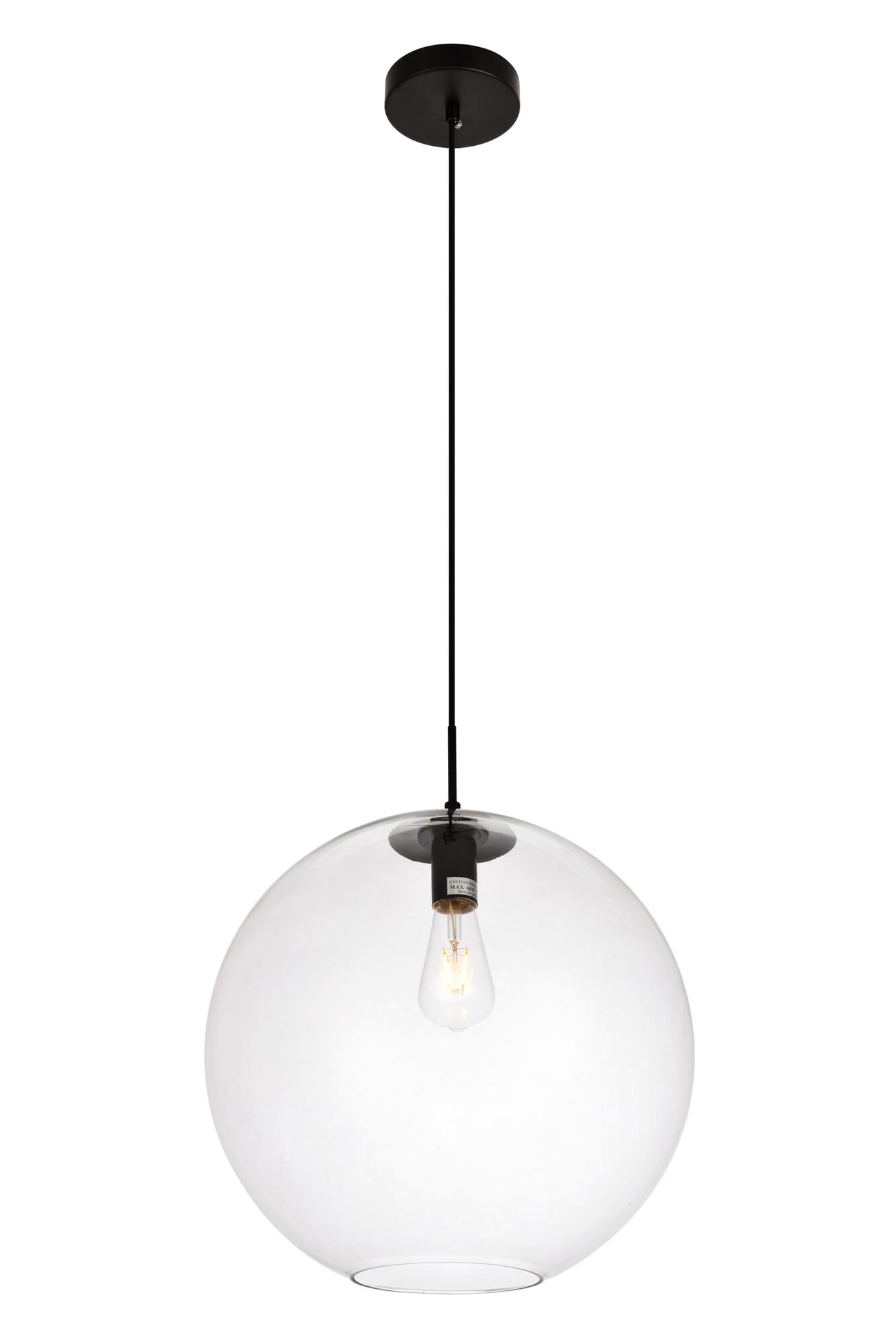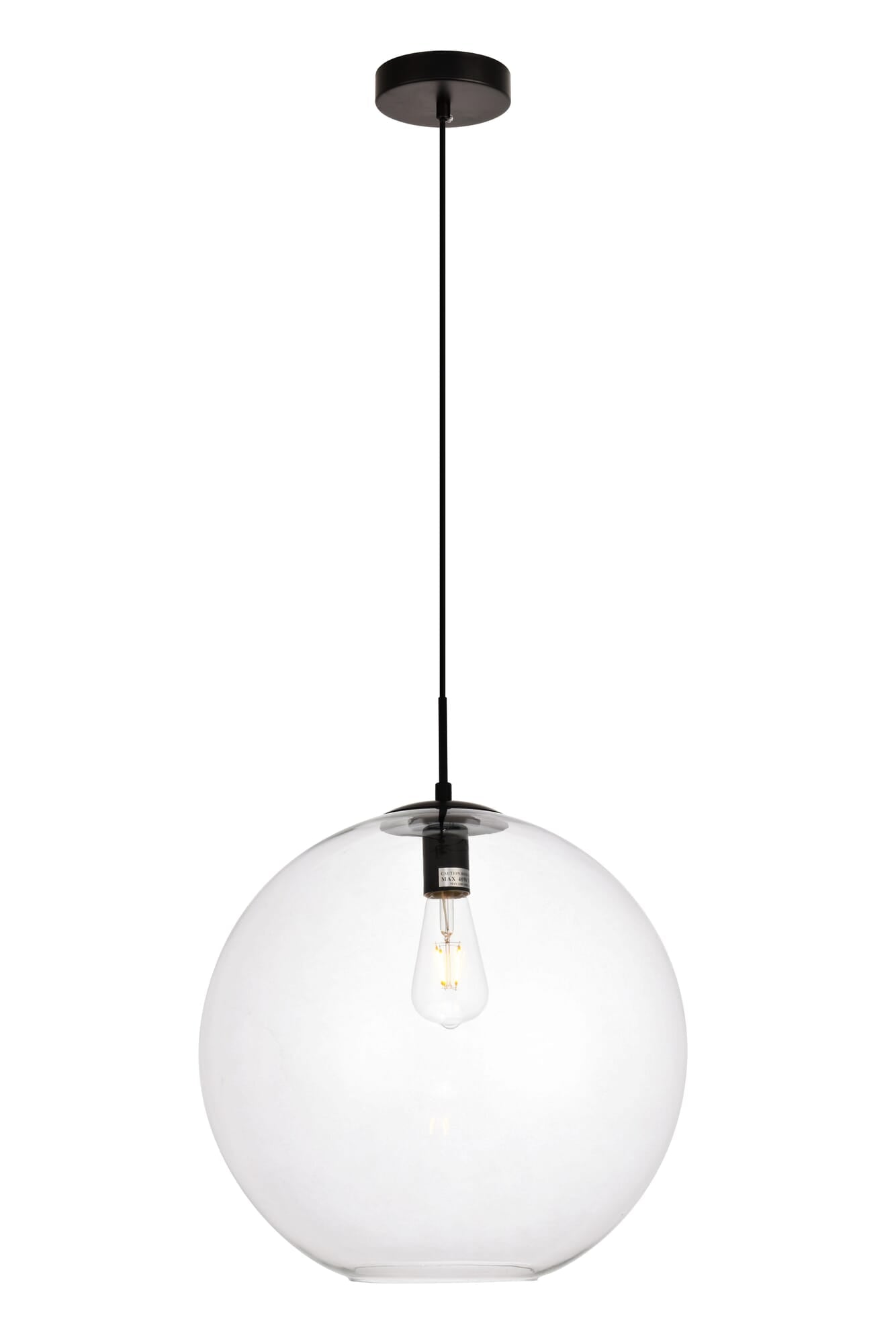 Dimensions Chain/Rod Length: 60" Length: 15.7" Width: 15.7" Height: 16.5" Maximum Height: 76" Wire Length: 60" Specifications Product Type: Pendants Hanging Device: Cord Voltage: 110V - 125V Dimmable: Yes Socket Type: E26 Number of Lights: 1 Wattage/Bulb: 40 Max/Nominal Watt: 40 Wire Included: Yes Bulb Shape: Medium; Bulb Not Provided Harware Material: Iron Fixture Material: Iron and Glass Product Shape: Pendants Assembly Required: No Hardware Finish: Black Bulb Included: No UL & ULC Standard: UL,ULC Dry/Wet/Damp: Dry Rated Weight: 4.6 Product Warranty: 1 year limited Shipment type: Small Parcel