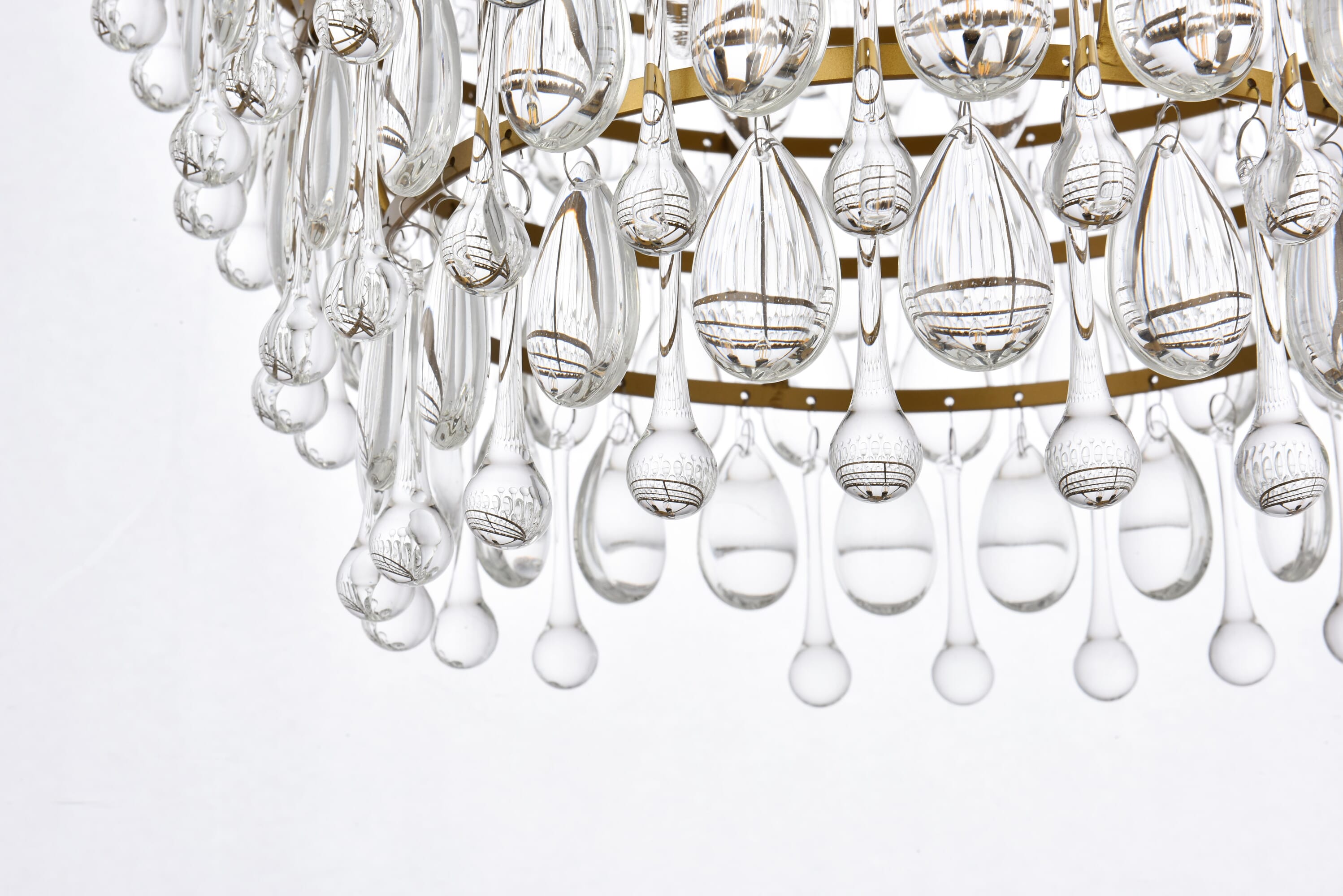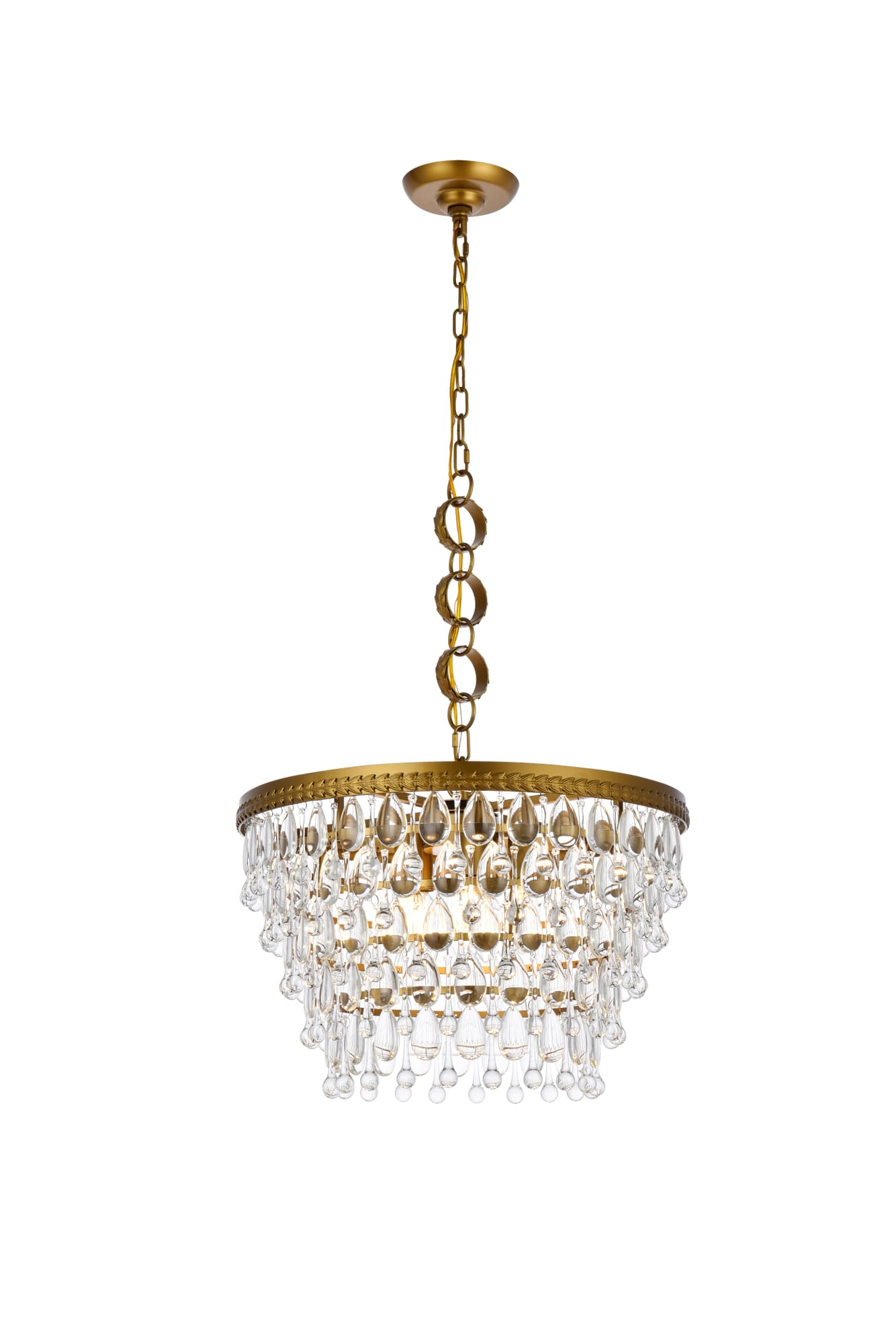 Dimensions Chain/Rod Length: 59" Length: 19" Width: 19" Height: 12" Maximum Height: 74" Wire Length: 142" Specifications Product Type: Pendants Hanging Device: Chain Voltage: 120V Dimmable: Yes Socket Type: E12 Number of Lights: 5 Wattage/Bulb: 40W Max/Nominal Watt: 200w Wire Included: Yes ETL: YES Harware Material: Iron Fixture Material: Iron and Glass Product Shape: Tiered Assembly Required: YES Hardware Finish: Brass Bulb Included: No Dry/Wet/Damp: Damp Weight: 20.5 Product Warranty: 1 year limited Shipment type: Small Parcel