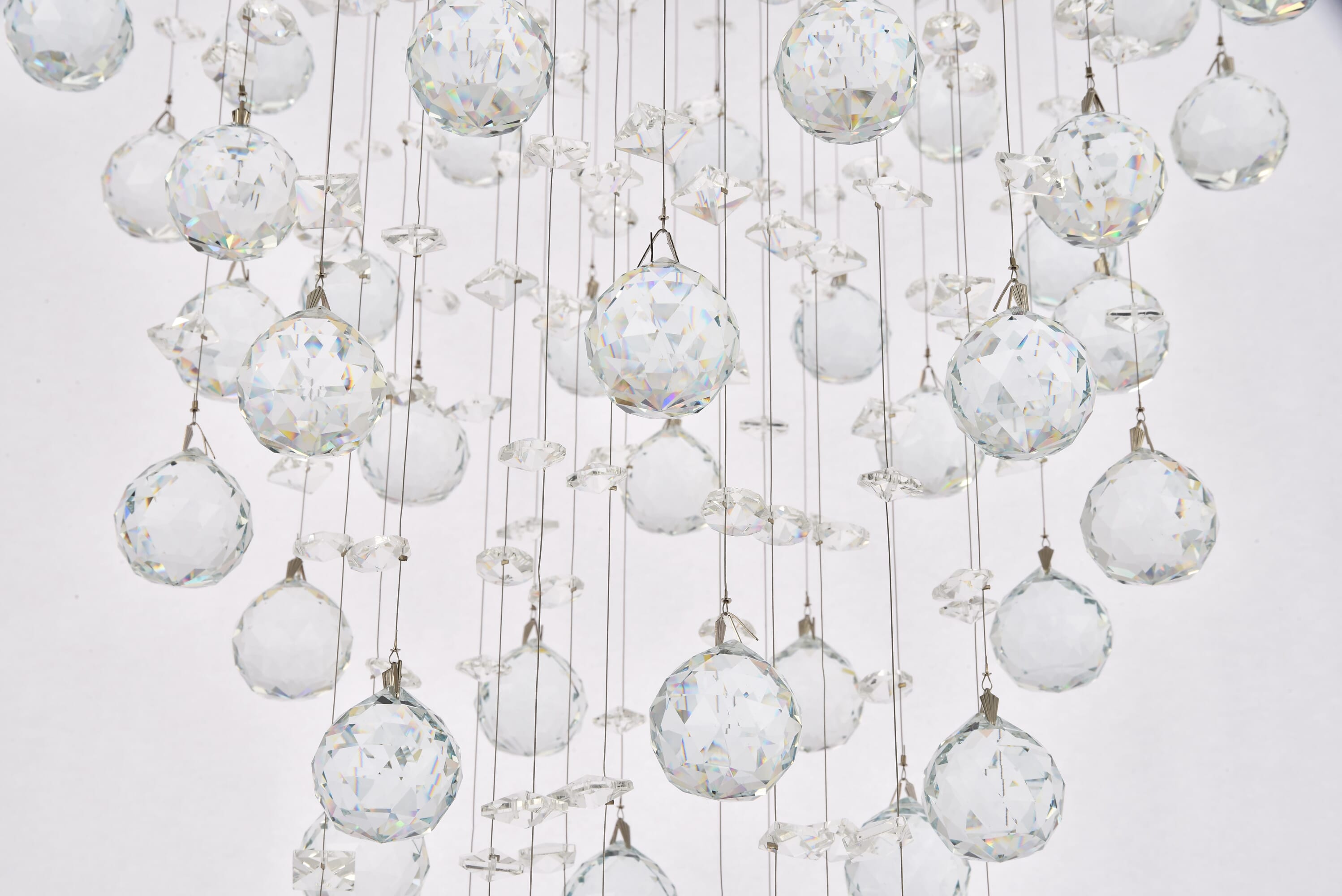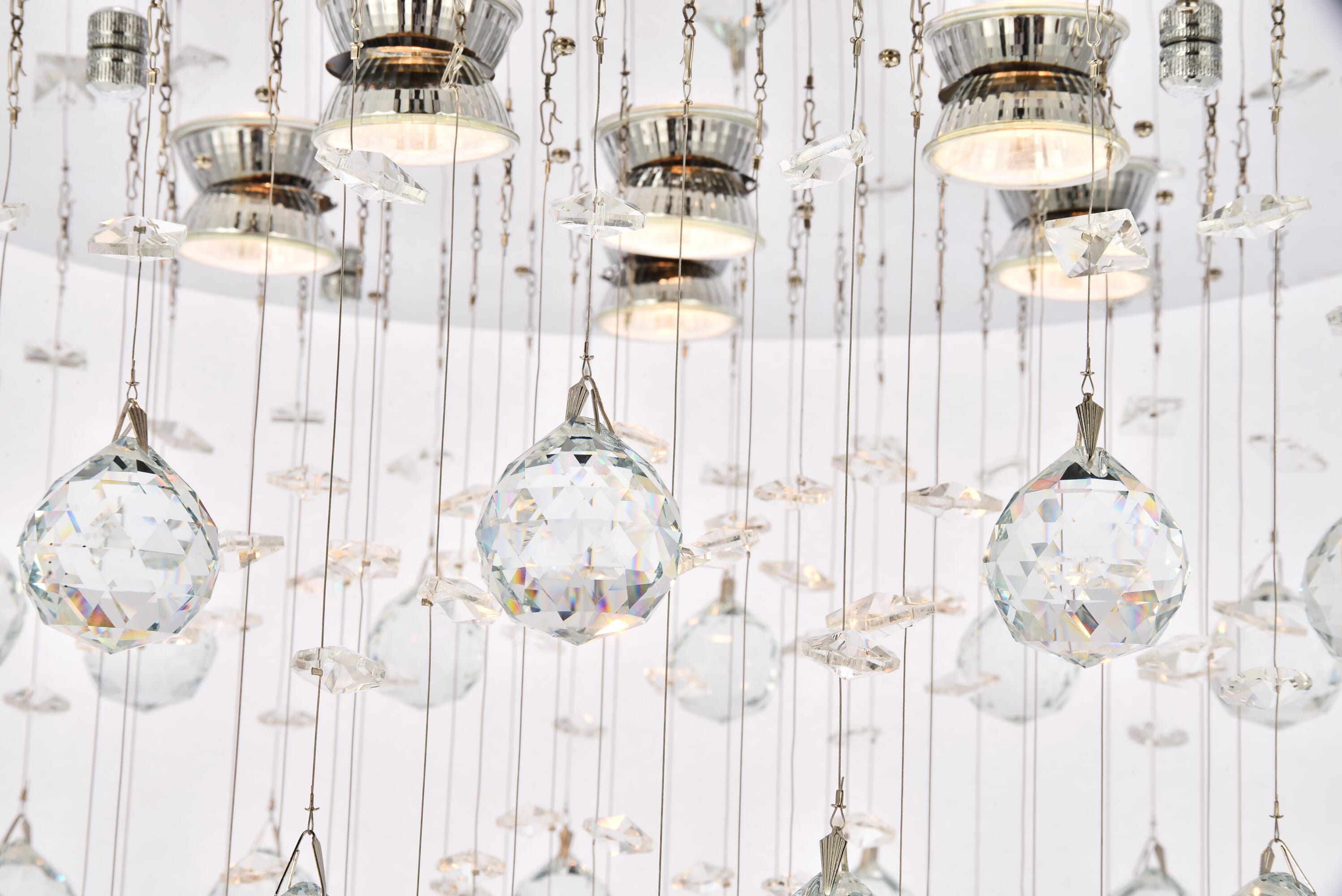Dimensions Chain/Rod Length: 98" Length: 18" Width: 18" Height: 32" Maximum Height: 130" Wire Length: 118" Specifications Product Type: Pendants Hanging Device: Cord Voltage: 110V - 125V Dimmable: Yes Socket Type: GU10 Number of Lights: 6 Wattage/Bulb: 50 Max/Nominal Watt: 300 Crystal/Glass Color: clear Wire Included: Yes Bulb Shape: MR16 Harware Material: Steel Fixture Material: Steel Product Shape: Pendants Assembly Required: NO Hardware Finish: Chrome Bulb Included: No UL & ULC Standard: UL,ULC Weight: 32 Product Warranty: 1 year limited Shipment type: Small Parcel