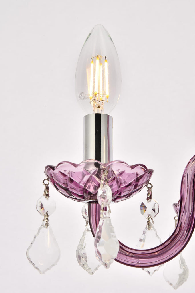 Dimensions Chain/Rod Length: 60" Length: 15" Width: 15" Height: 12" Maximum Height: 72" Wire Length: 82.5" Specifications Product Type: Pendants Hanging Device: Chain Voltage: 110V - 125V Dimmable: Yes Socket Type: E12 Number of Lights: 4 Wattage/Bulb: 40 Max/Nominal Watt: 160 Crystal/Glass Color: clear Wire Included: Yes Bulb Shape: B10 Harware Material: Steel Fixture Material: Steel and Glass Product Shape: Pendants Assembly Required: YES Hardware Finish: Purple Bulb Included: No UL & ULC Standard: UL,ULC Weight: 14 Product Warranty: 1 year limited Shipment type: Small Parcel