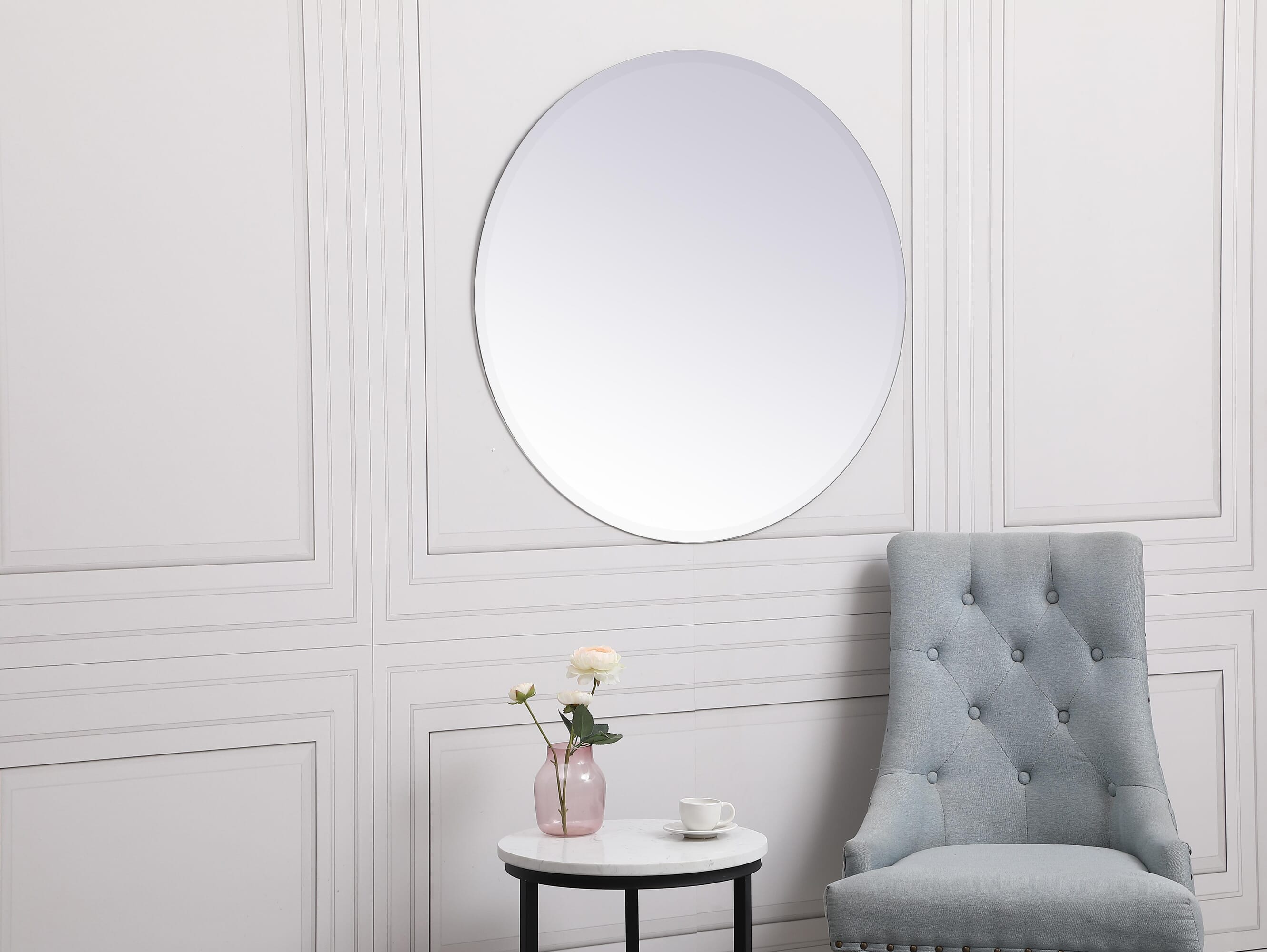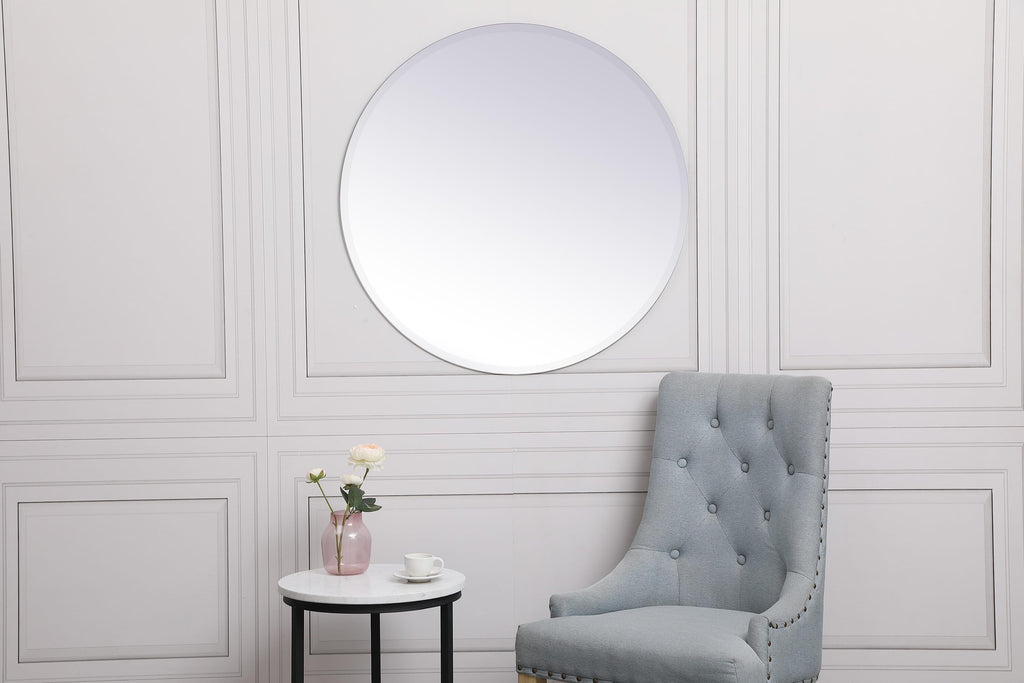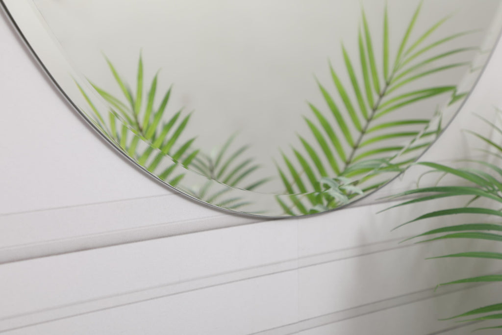 Dimensions Length: 32" Width: 0.25" Height: 32" Depth: 0.25" Specifications Product Type: Vanity Mirrors Wire Included: No Assembly Required: no Mirror Frame Shape: Round Mirror Hanging Orientation: Horizontal or Vertical Mirror Mounting: Brackets Frameless: YES Weight: 14.08 Product Warranty: 1 year limited Shipment type: Small Parcel
