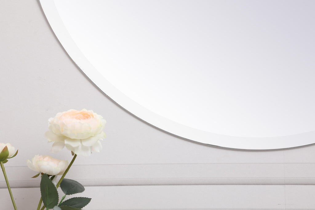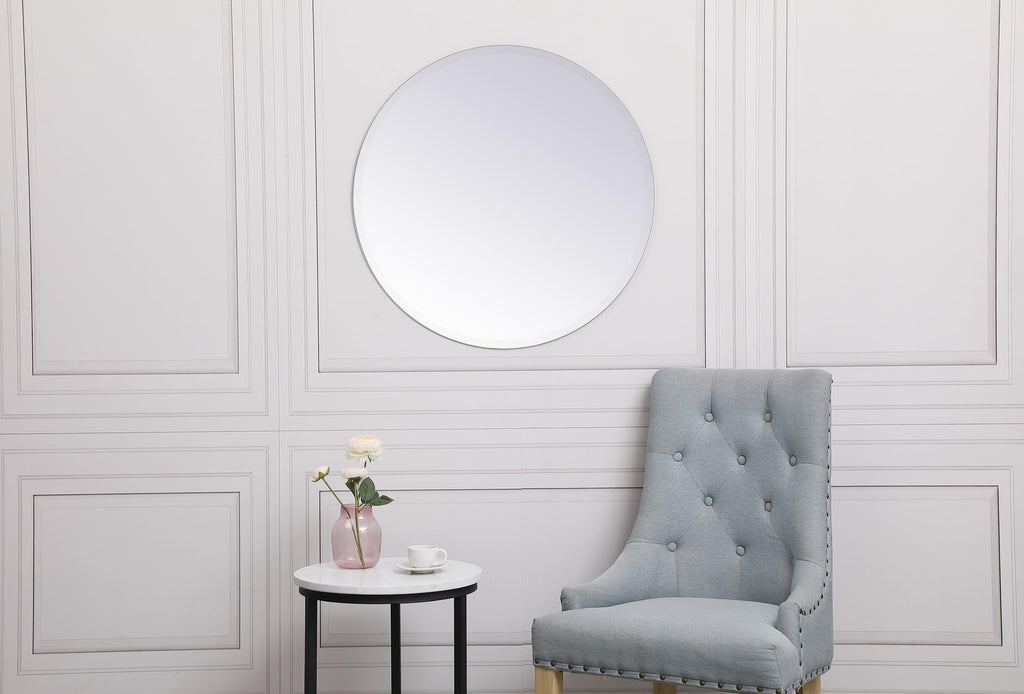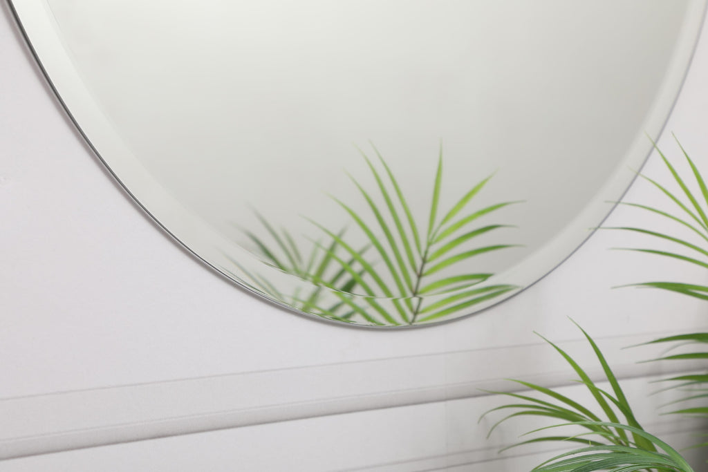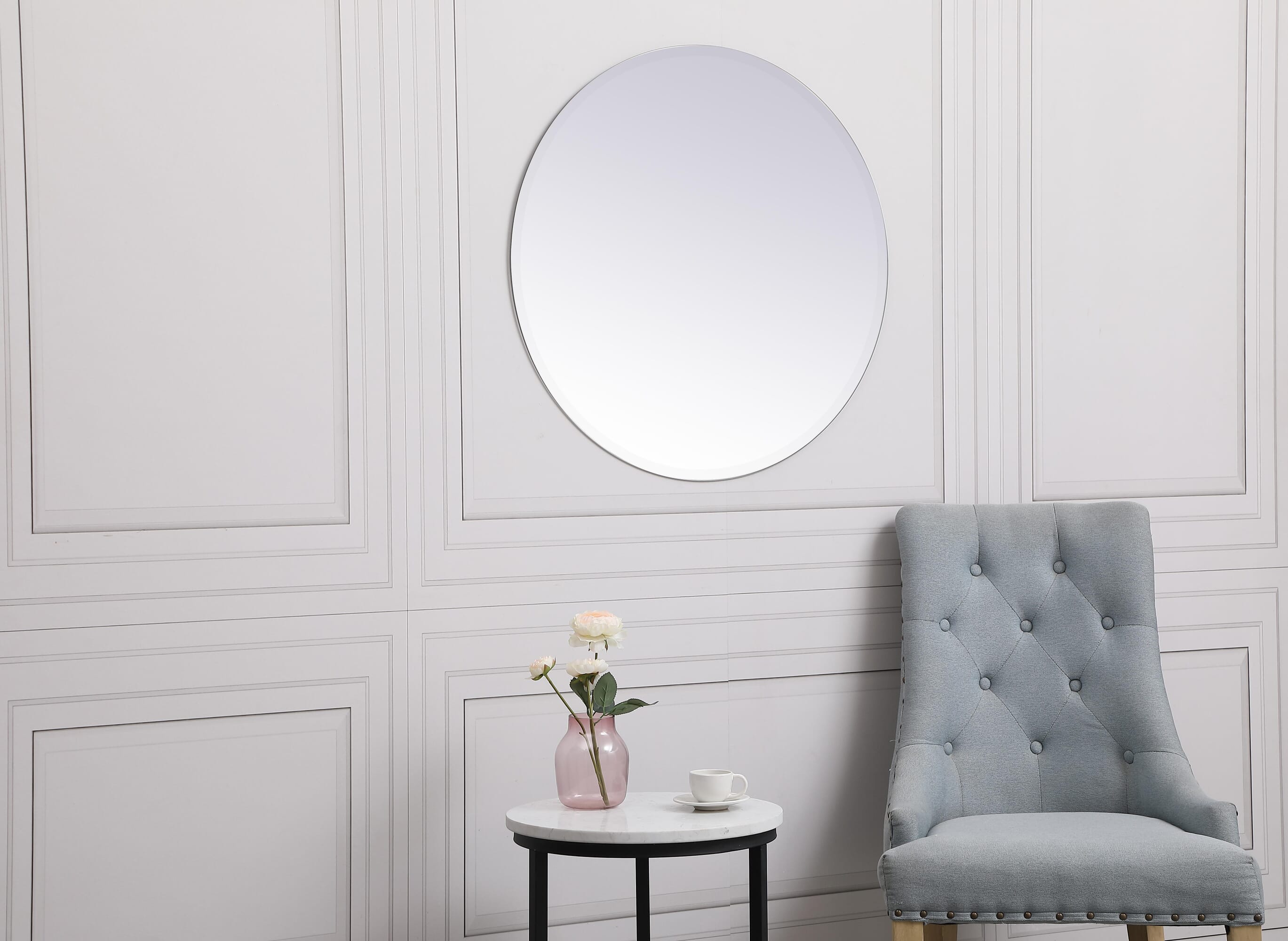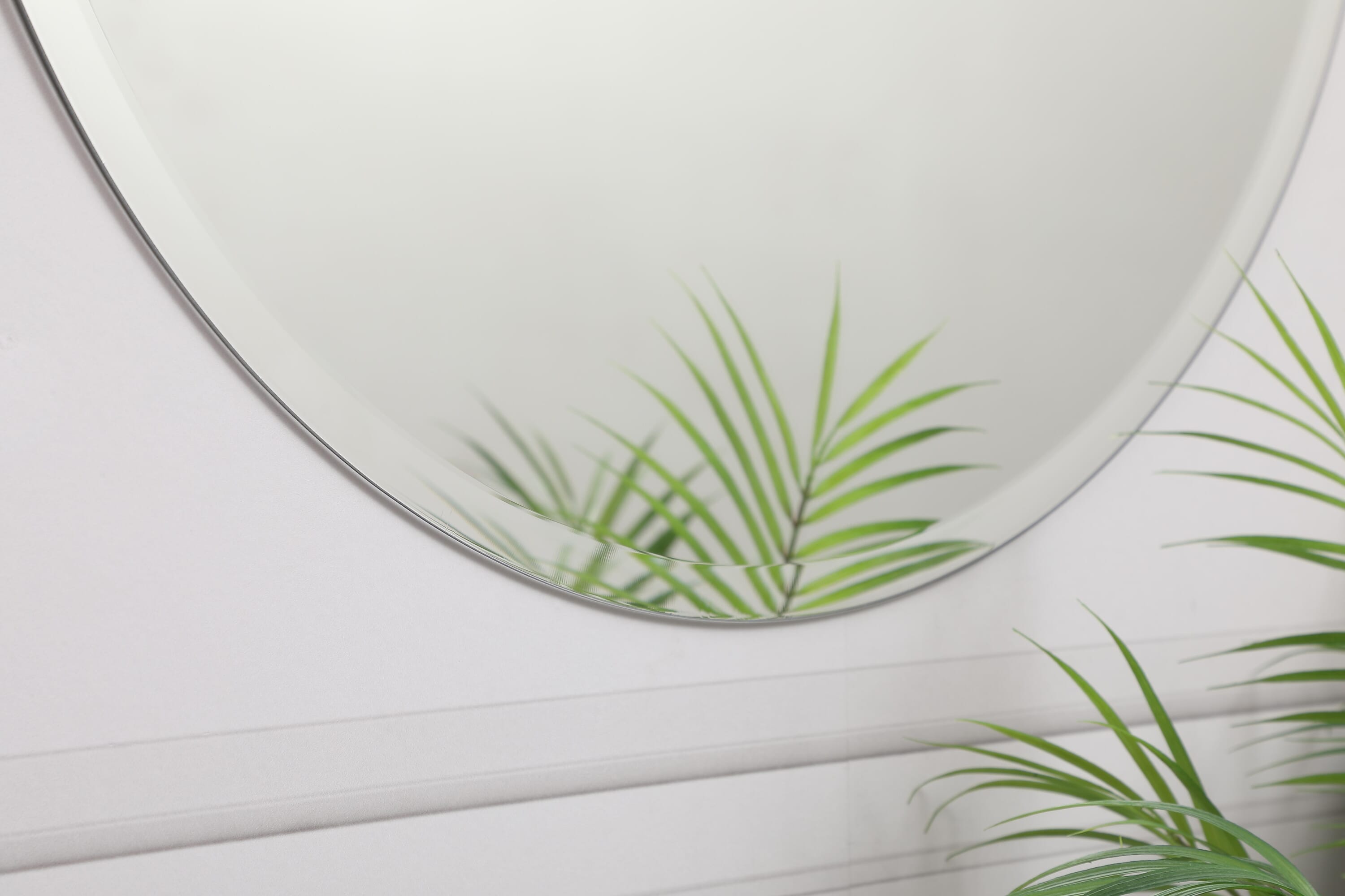 Dimensions Length: 28" Width: 0.25" Height: 28" Depth: 0.25" Specifications Product Type: Vanity Mirrors Wire Included: No Harware Material: metal Fixture Material: Mirror Product Shape: Round Assembly Required: No Distressed Finish: No Mirror Frame Shape: Round Mirror Hanging Orientation: Vertical and Horizontal Mirror Mounting: Metal Inset hanger Mirror Type: clear mirror Frameless: yes Weight: 9.5 Product Warranty: 1 year limited Shipment type: Small Parcel