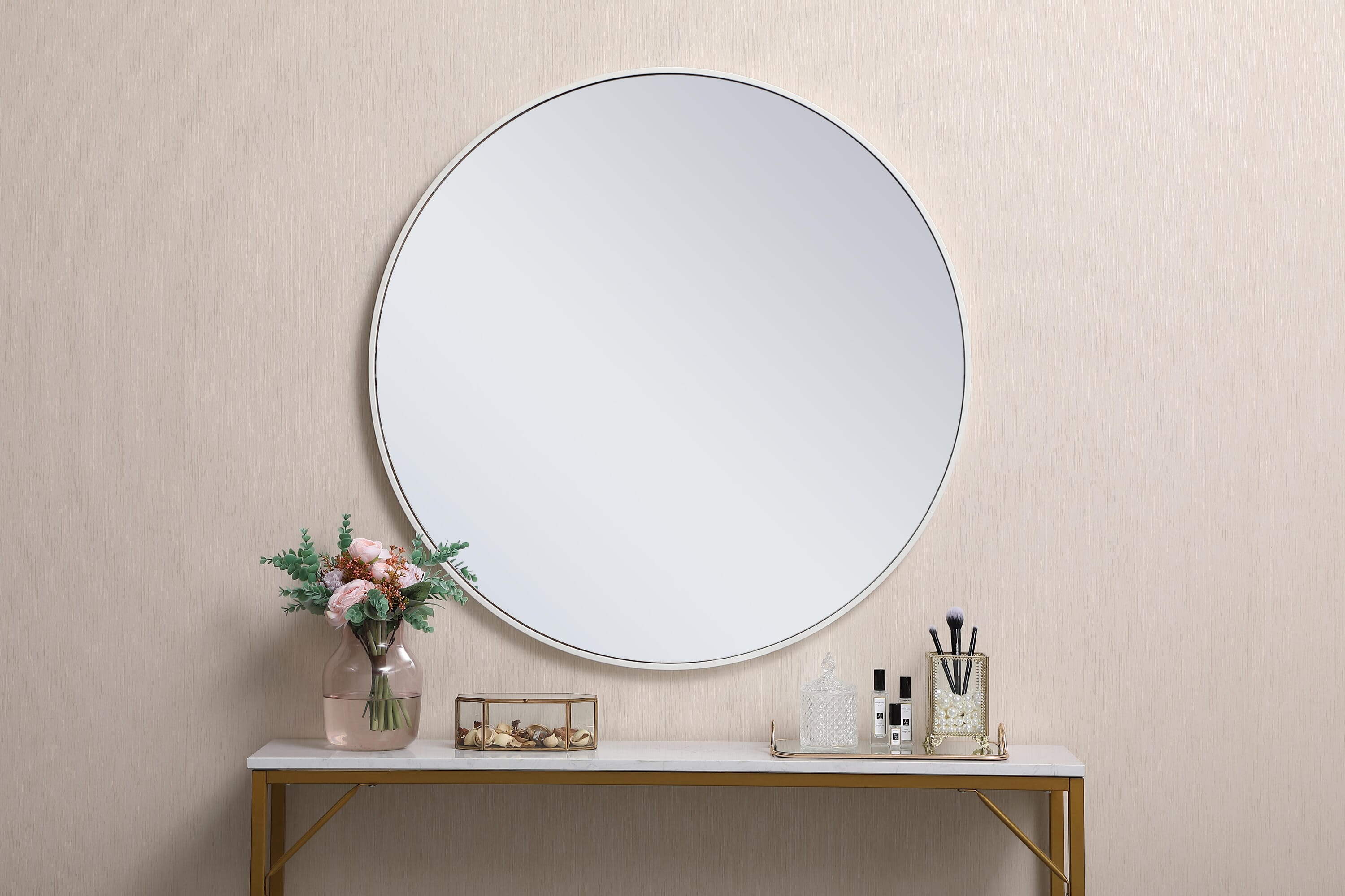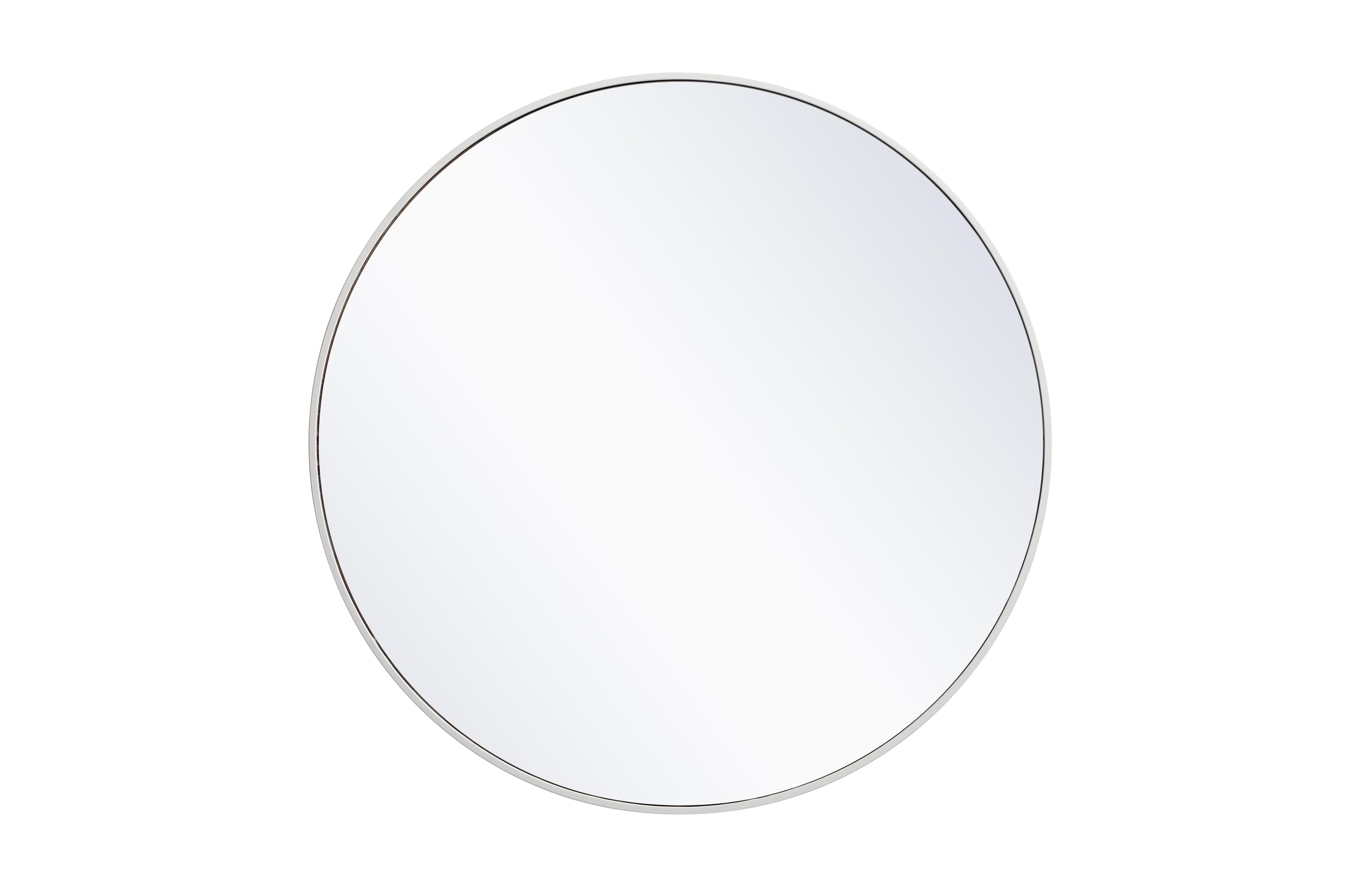 Dimensions Length: 36" Width: 1" Height: 36" Depth: 1" Specifications Product Type: Vanity Mirrors Wire Included: No Harware Material: metal Fixture Material: Metal and MDF Product Shape: Round Assembly Required: No Distressed Finish: No Mirror Frame Shape: Round Mirror Hanging Orientation: Vertical and Horizontal Mirror Mounting: Metal Inset hanger Mirror Type: clear mirror Frameless: No Weight: 22.3 Product Warranty: 1 year limited Shipment type: Small Parcel