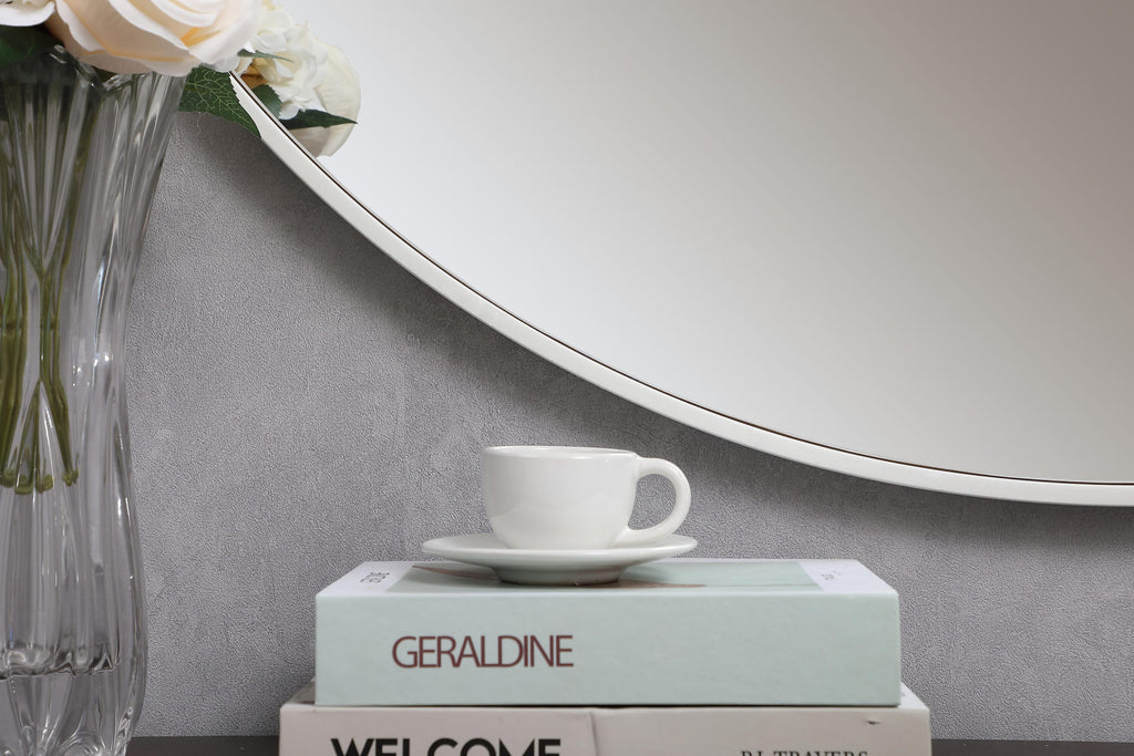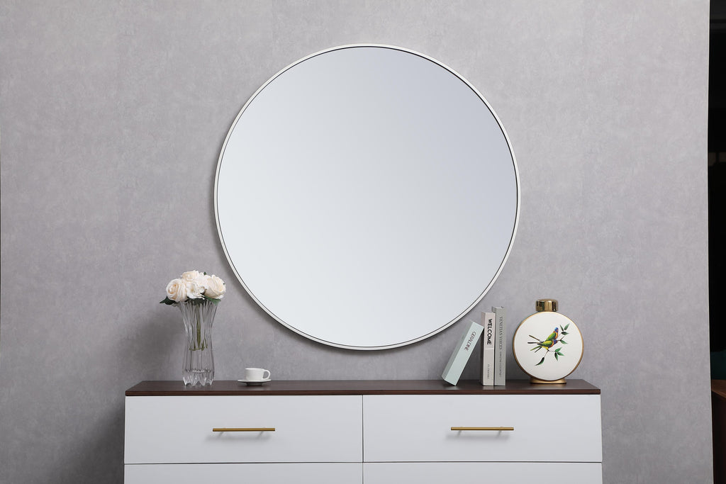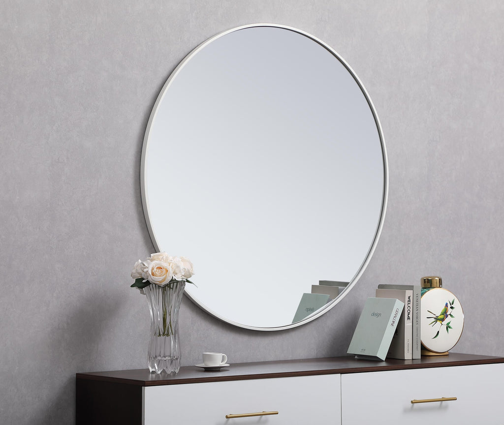 Dimensions Length: 42" Width: 1" Height: 42" Depth: 1" Specifications Product Type: Vanity Mirrors Wire Included: No Harware Material: metal Fixture Material: Metal and MDF Product Shape: Round Assembly Required: No Distressed Finish: No Mirror Frame Shape: Round Mirror Hanging Orientation: Vertical and Horizontal Mirror Mounting: Metal Inset hanger Mirror Type: clear mirror Frameless: No Weight: 30.1 Product Warranty: 1 year limited Shipment type: Oversized Ground