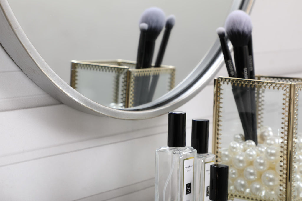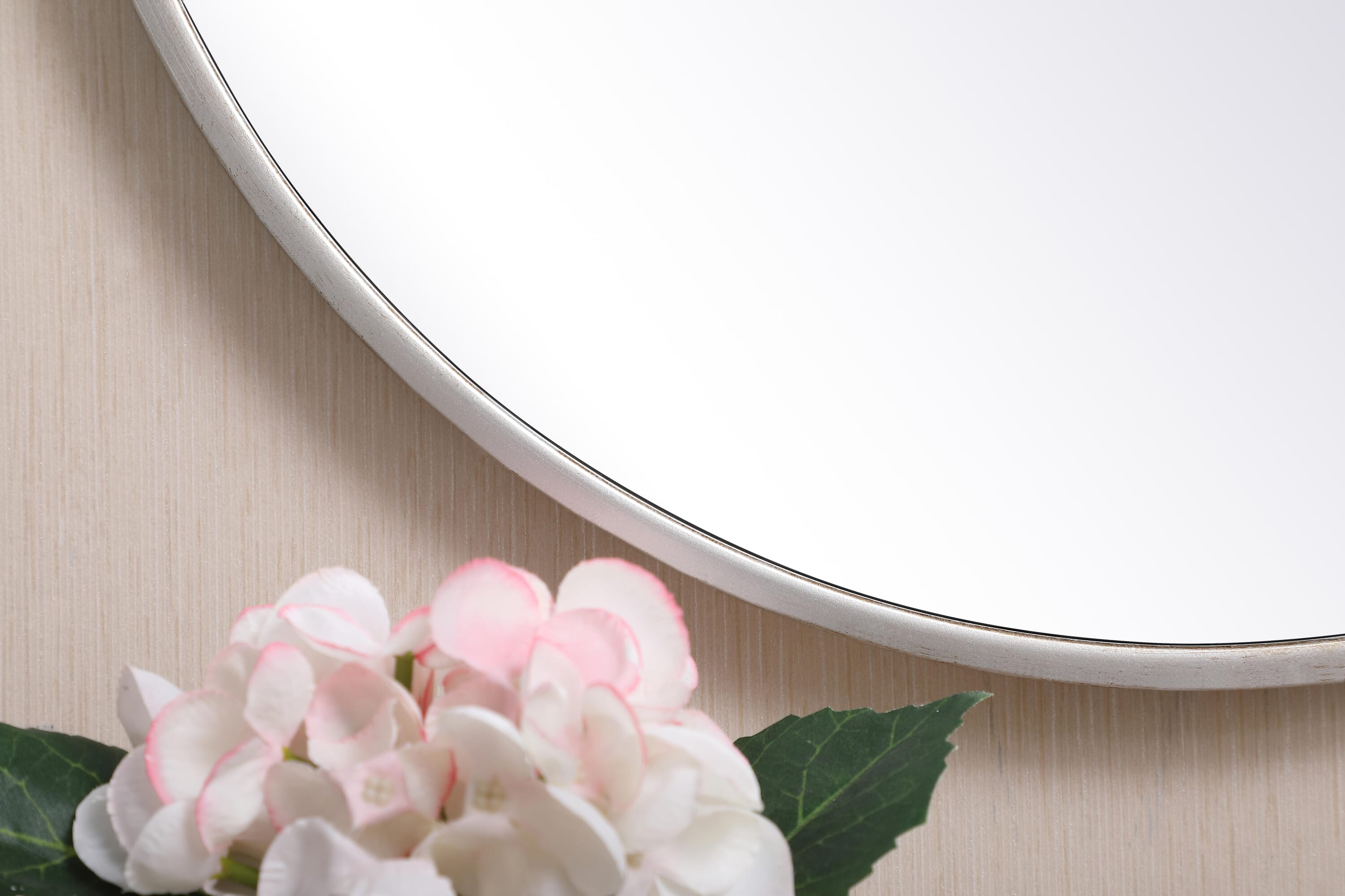 Dimensions Length: 18" Width: 1" Height: 18" Depth: 1" Specifications Product Type: Vanity Mirrors Wire Included: No Harware Material: metal Fixture Material: Metal and MDF Product Shape: Round Assembly Required: No Distressed Finish: No Mirror Frame Shape: Round Mirror Hanging Orientation: Vertical and Horizontal Mirror Mounting: Metal Inset hanger Mirror Type: clear mirror Frameless: No Weight: 6.3 Product Warranty: 1 year limited Shipment type: Small Parcel