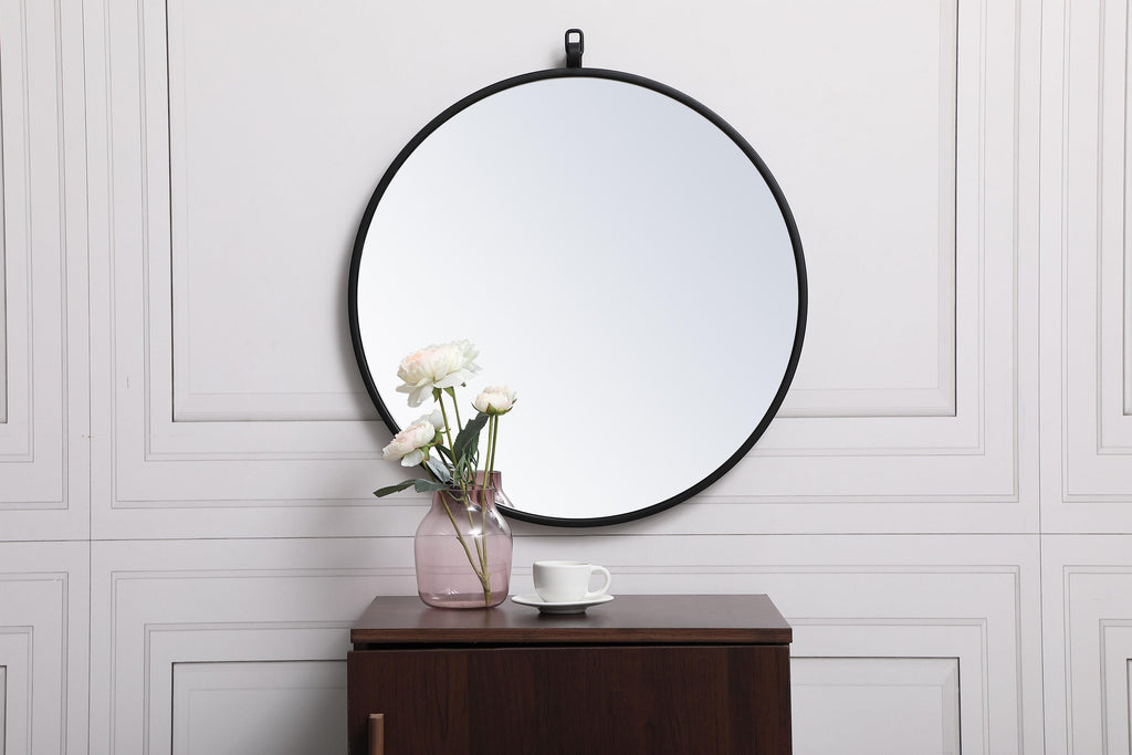 Dimensions Length: 21" Width: 1" Height: 21" Depth: 1" Specifications Product Type: Vanity Mirrors Wire Included: No Harware Material: metal Fixture Material: Metal and MDF Product Shape: Round Assembly Required: No Distressed Finish: No Mirror Frame Shape: Round Mirror Hanging Orientation: Vertical and Horizontal Mirror Mounting: Metal Inset hanger Mirror Type: clear mirror Frameless: No Weight: 8 Product Warranty: 1 year limited Shipment type: Small Parcel