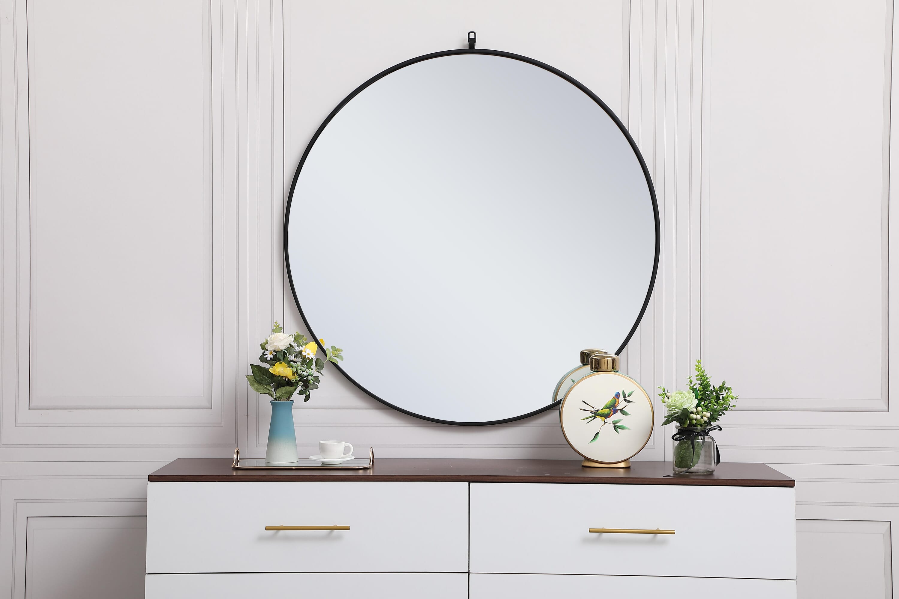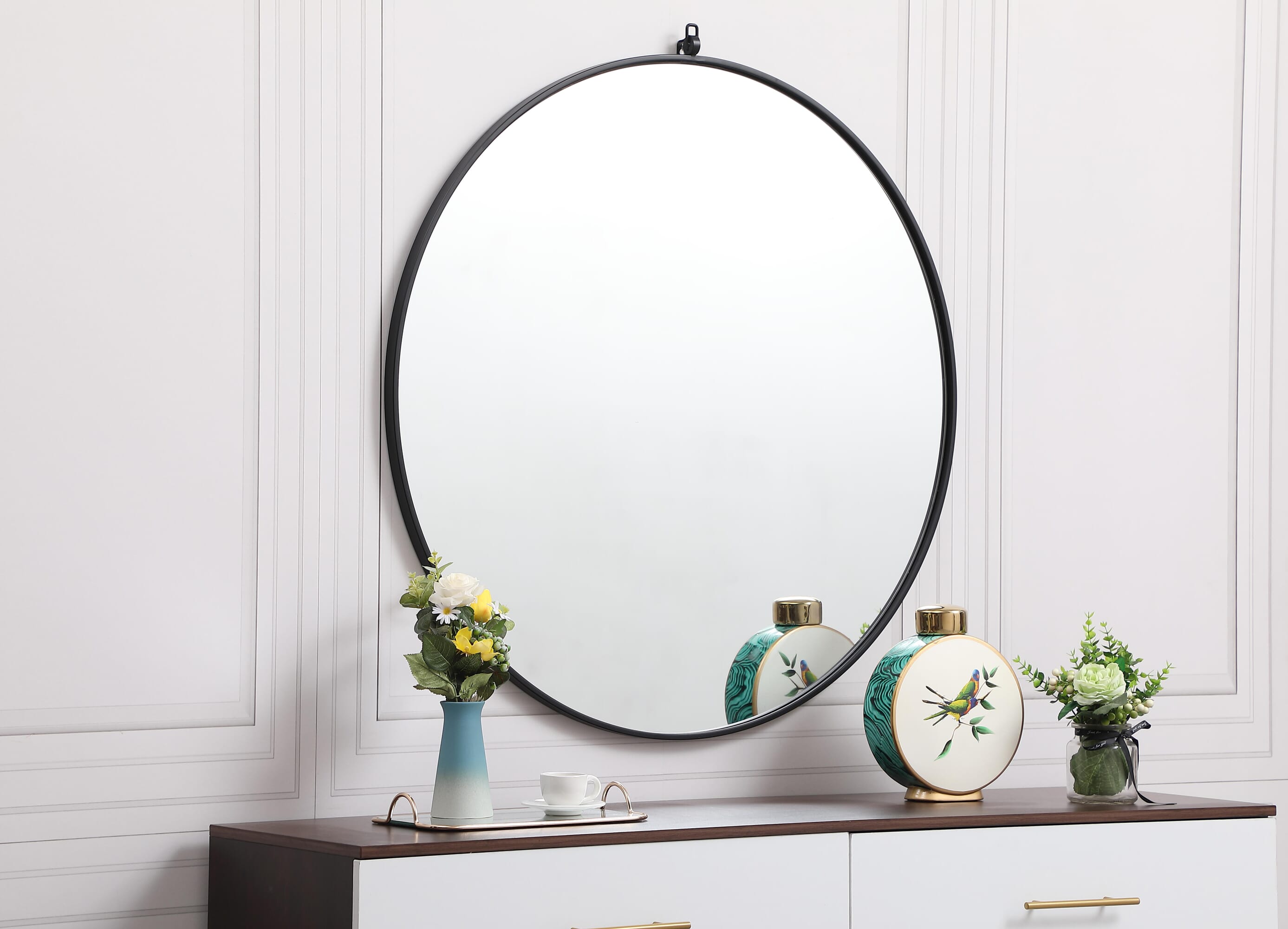 Dimensions Length: 39" Width: 1" Height: 39" Depth: 1" Specifications Product Type: Vanity Mirrors Wire Included: No Harware Material: metal Fixture Material: Metal and MDF Product Shape: Round Assembly Required: No Distressed Finish: No Mirror Frame Shape: Round Mirror Hanging Orientation: Vertical and Horizontal Mirror Mounting: Metal Inset hanger Mirror Type: clear mirror Frameless: No Weight: 24.3 Product Warranty: 1 year limited Shipment type: Oversized Ground