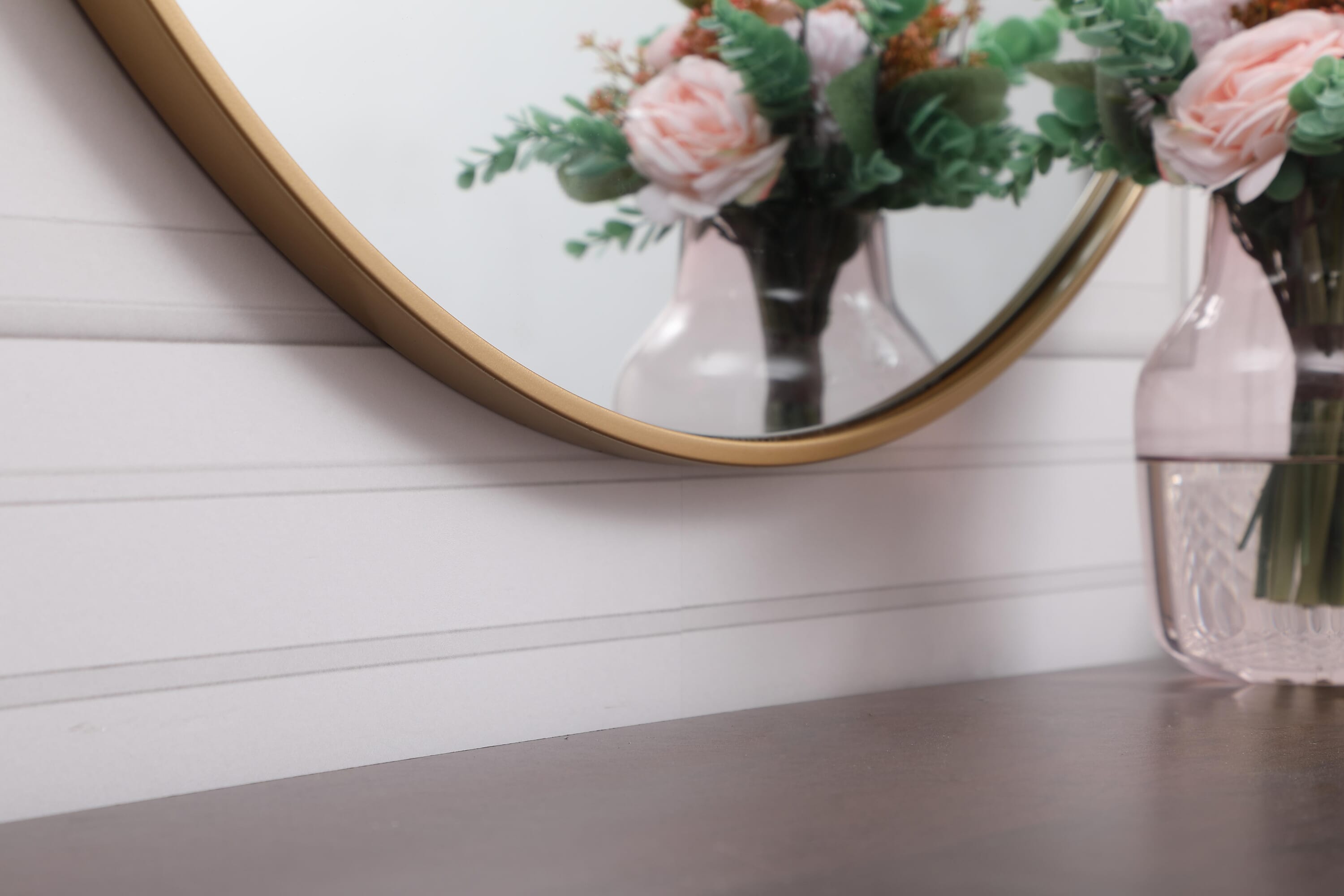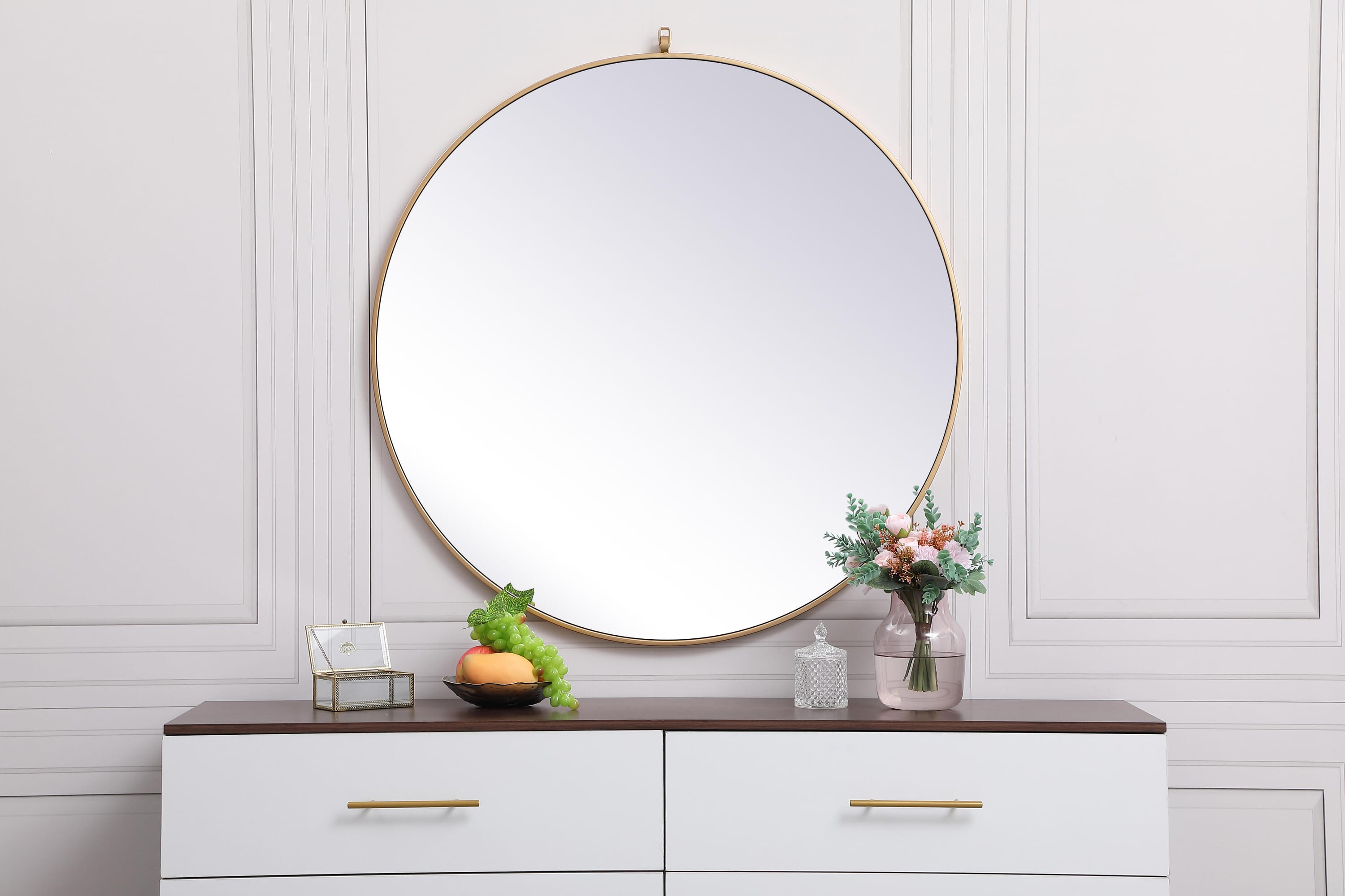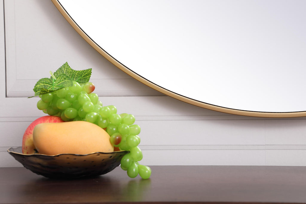 Dimensions Length: 39" Width: 1" Height: 39" Depth: 1" Specifications Product Type: Vanity Mirrors Wire Included: No Harware Material: metal Fixture Material: Metal and MDF Product Shape: Round Assembly Required: No Distressed Finish: No Mirror Frame Shape: Round Mirror Hanging Orientation: Vertical and Horizontal Mirror Mounting: Metal Inset hanger Mirror Type: clear mirror Frameless: No Weight: 24.3 Product Warranty: 1 year limited Shipment type: Oversized Ground