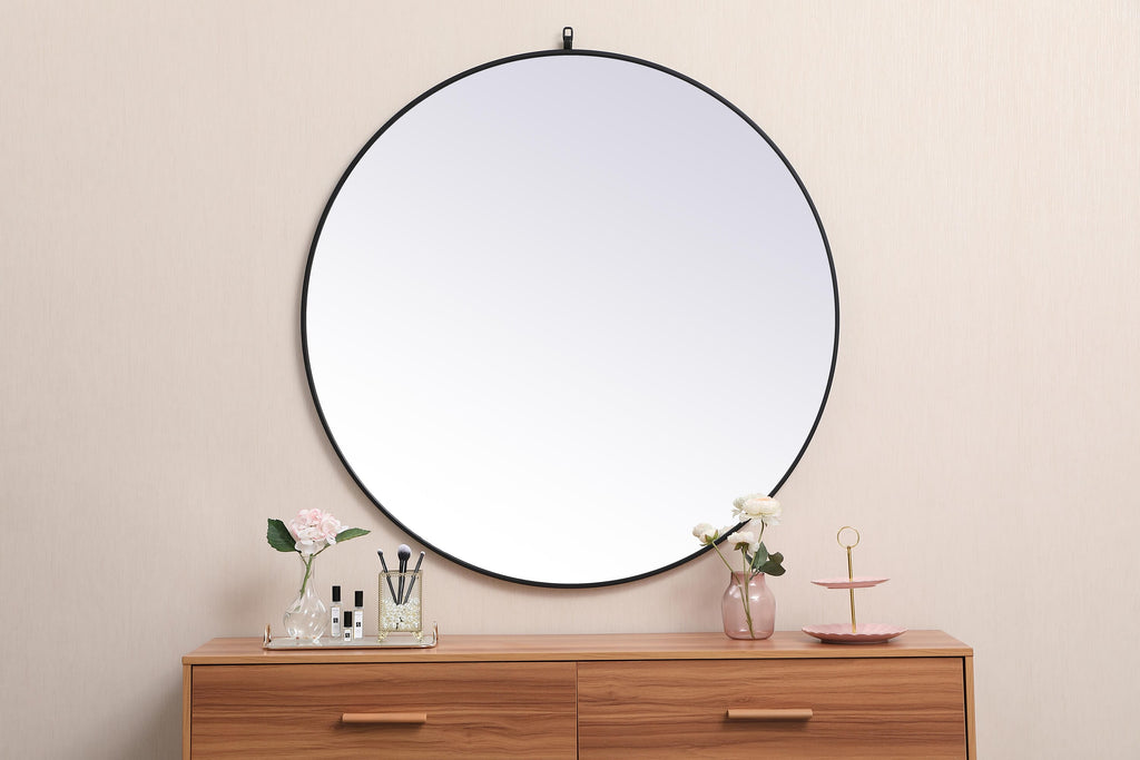 Dimensions Length: 45" Width: 1" Height: 45" Depth: 1" Specifications Product Type: Vanity Mirrors Wire Included: No Harware Material: metal Fixture Material: Metal and MDF Product Shape: Round Assembly Required: No Distressed Finish: No Mirror Frame Shape: Round Mirror Hanging Orientation: Vertical and Horizontal Mirror Mounting: Metal Inset hanger Mirror Type: clear mirror Frameless: No Weight: 31.8 Product Warranty: 1 year limited Shipment type: Oversized Ground