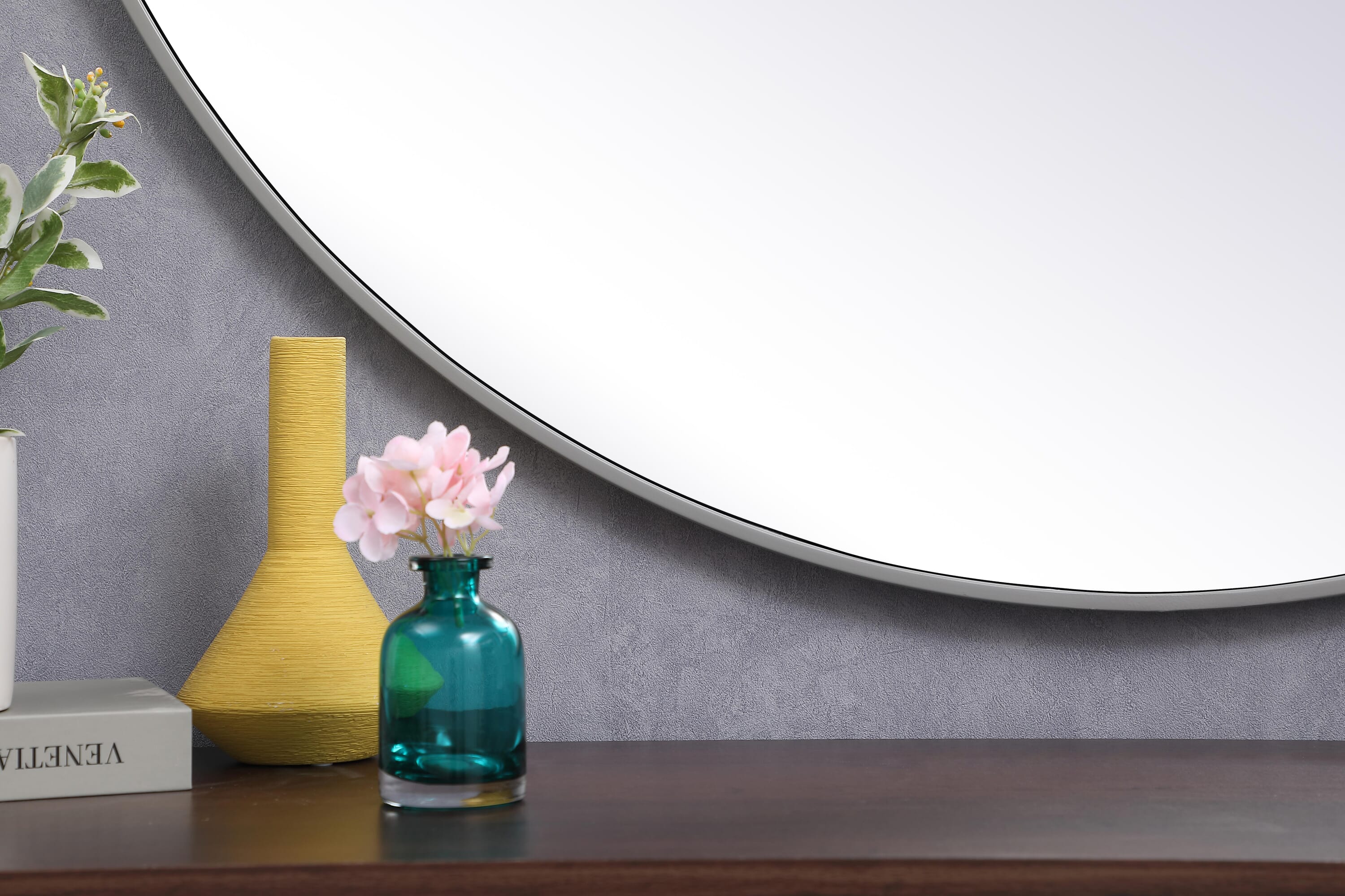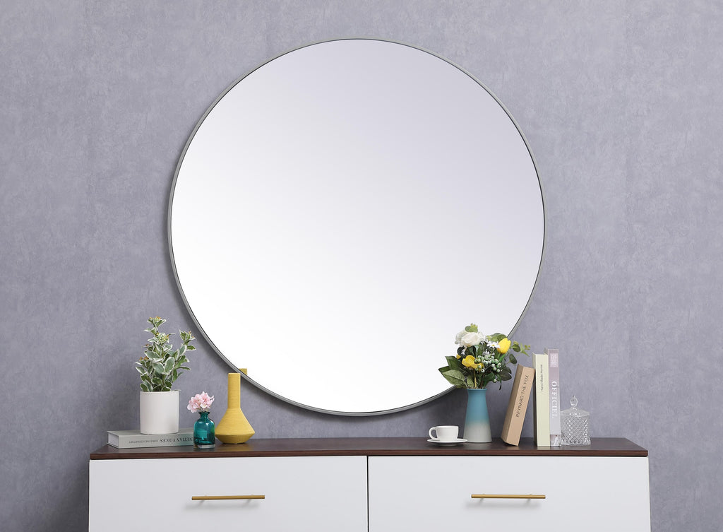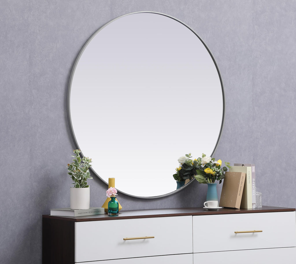 Dimensions Length: 45" Width: 1" Height: 45" Depth: 1" Specifications Product Type: Vanity Mirrors Wire Included: No Harware Material: metal Fixture Material: Metal and MDF Product Shape: Round Assembly Required: No Distressed Finish: No Mirror Frame Shape: Round Mirror Hanging Orientation: Vertical and Horizontal Mirror Mounting: Metal Inset hanger Mirror Type: clear mirror Frameless: No Weight: 31.7 Product Warranty: 1 year limited Shipment type: Oversized Ground