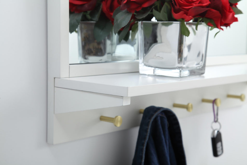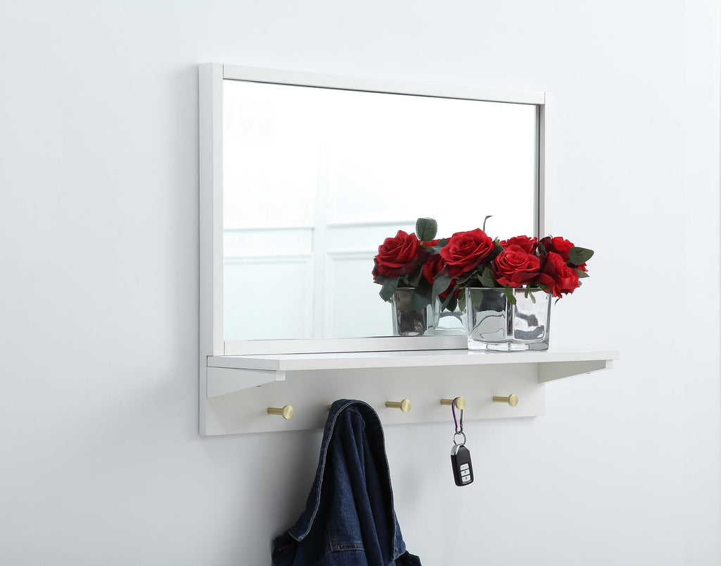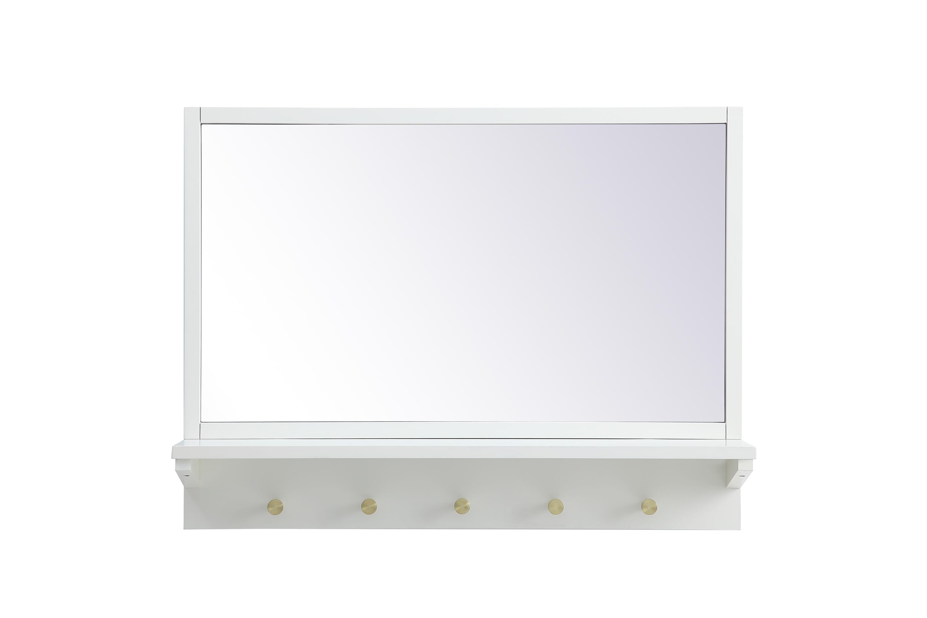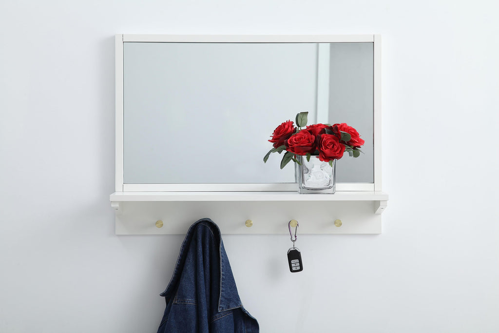 Dimensions Length: 28" Width: 1" Height: 21" Specifications Product Type: Vanity Mirrors Wire Included: No Harware Material: steel Fixture Material: MDF, Glass, and Metal Product Shape: Rectangle Assembly Required: yes, shelf Distressed Finish: no Hardware Finish: brass Mirror Frame Shape: Rectangle Mirror Hanging Orientation: Horizontal Mirror Mounting: Metal Keyhole hangers Frameless: no Dry/Wet/Damp: Damp Weight: 18.48 Product Warranty: 1 year limited Shipment type: Small Parcel Shelves Number of Shelves: 1 Shelf Width: 28