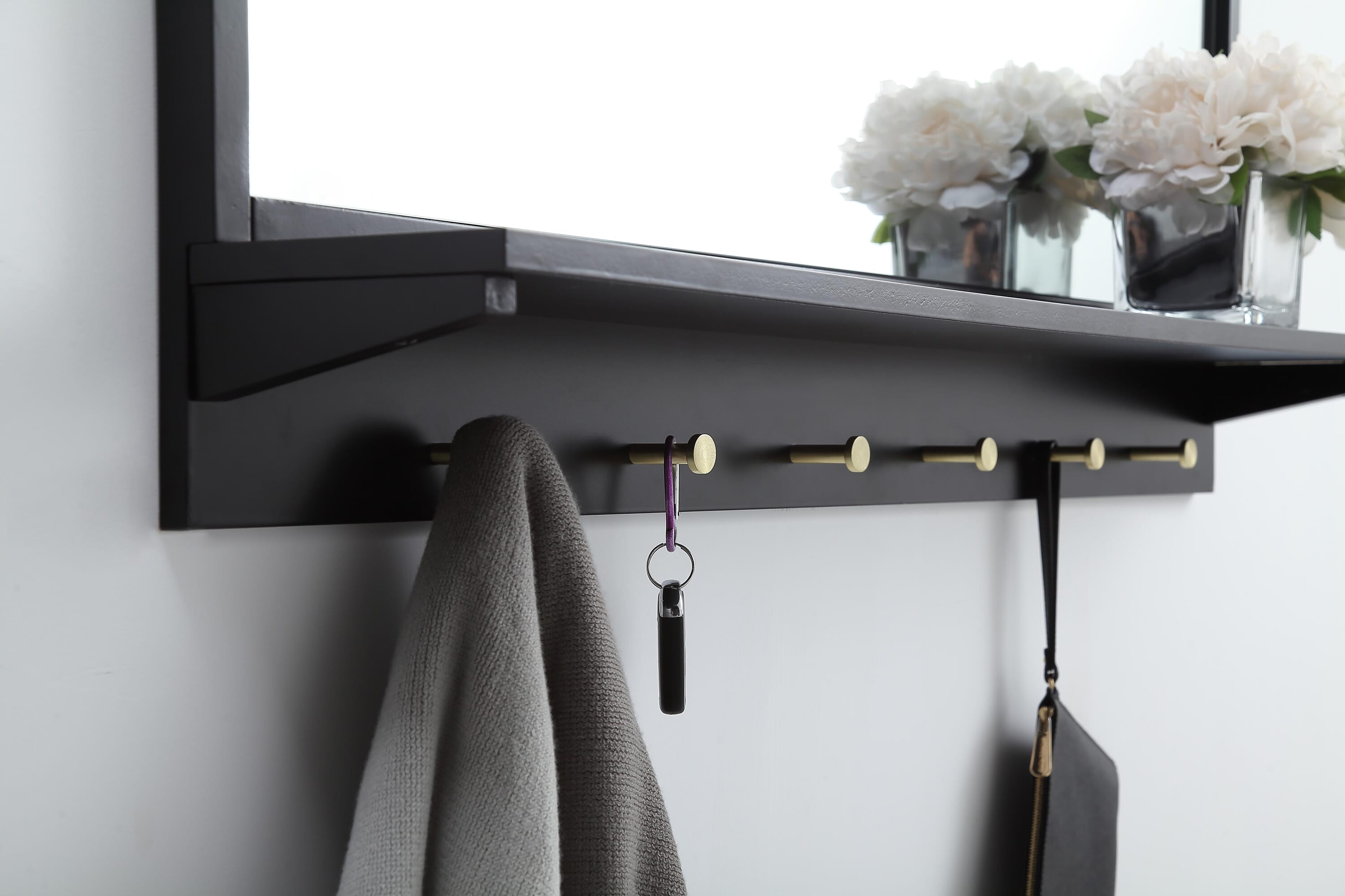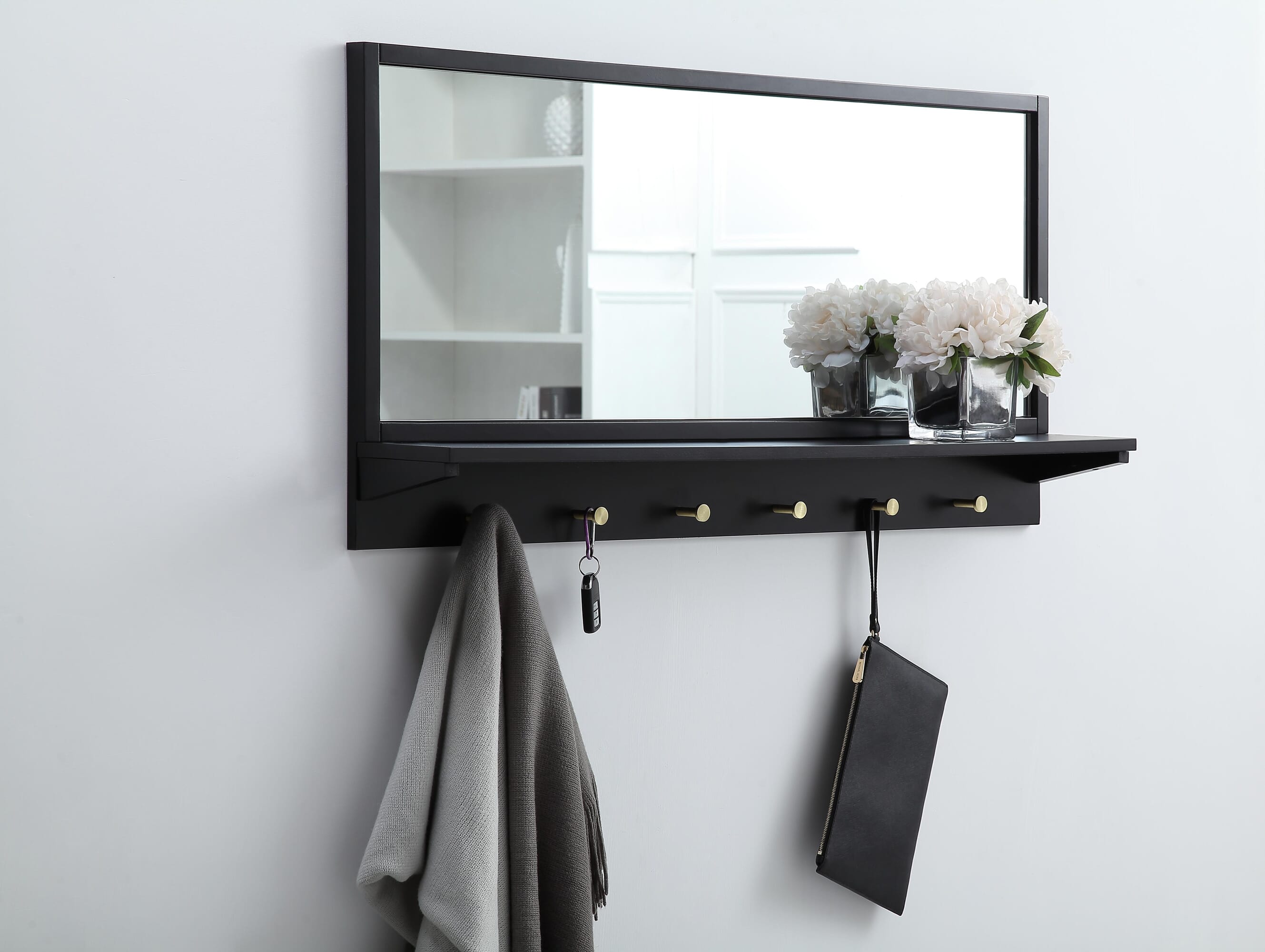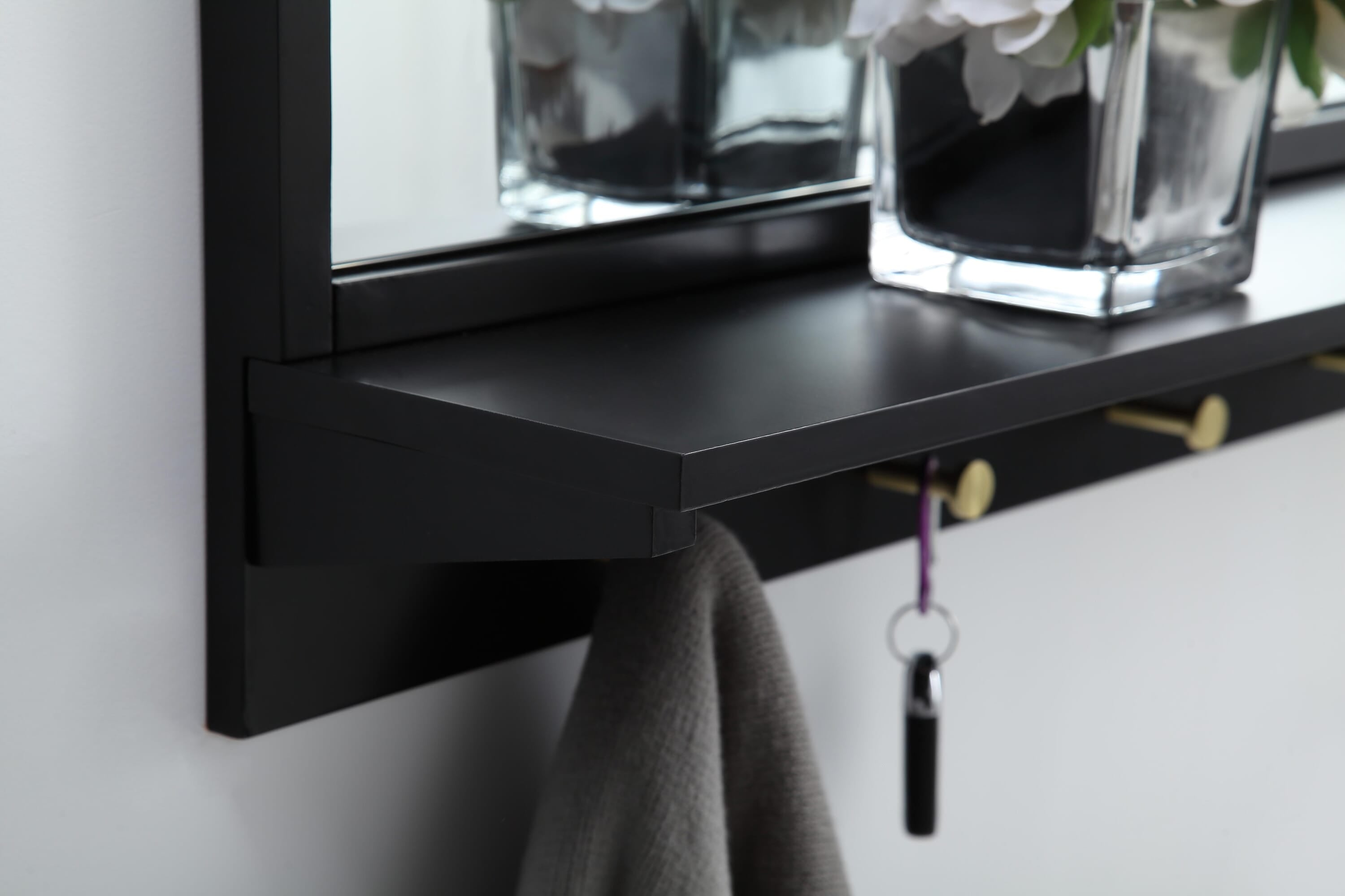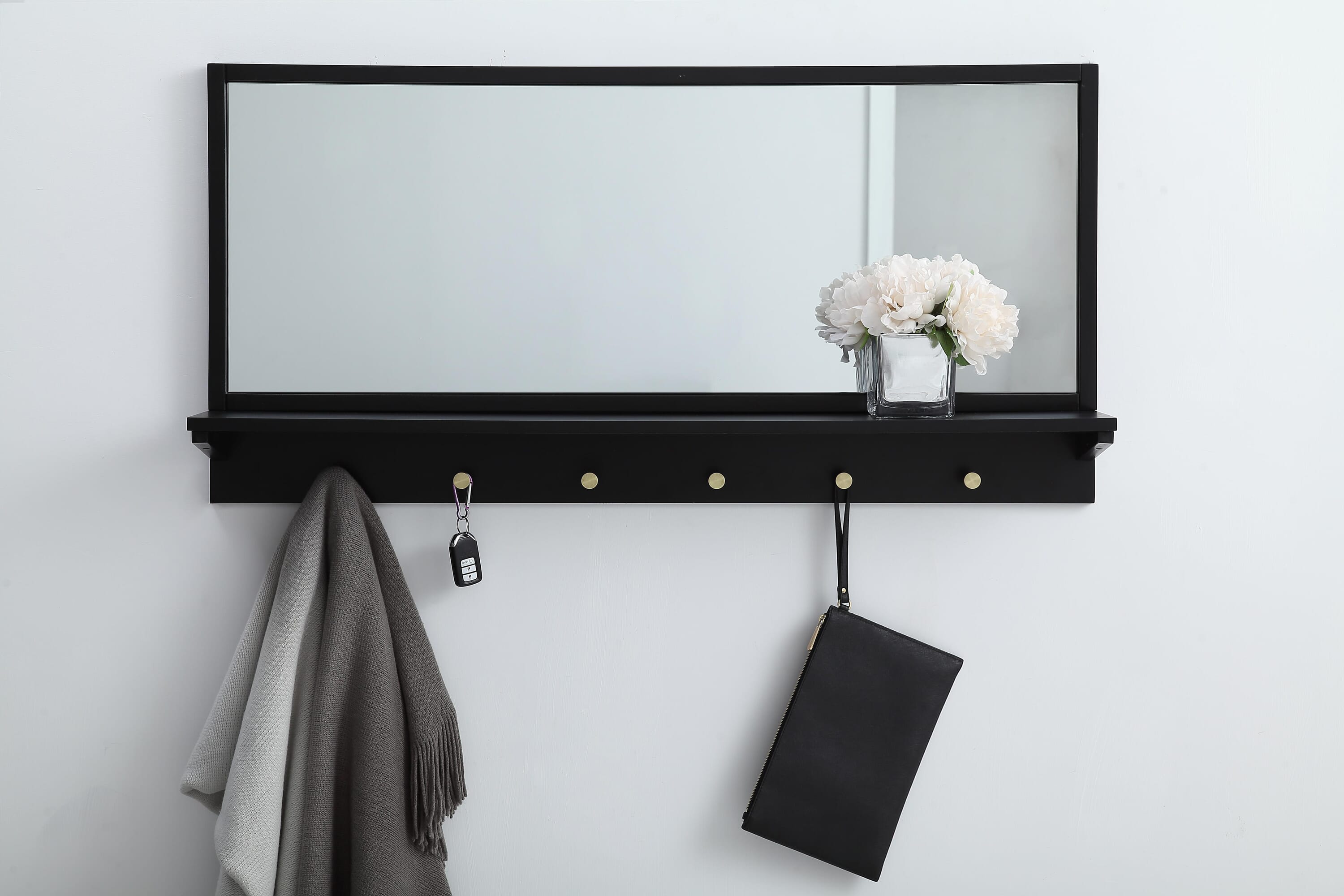 Dimensions Length: 42" Width: 1" Height: 21" Specifications Product Type: Vanity Mirrors Wire Included: No Harware Material: steel Fixture Material: MDF, Glass, and Metal Product Shape: Rectangle Assembly Required: yes, shelf Distressed Finish: no Hardware Finish: brass Mirror Frame Shape: Rectangle Mirror Hanging Orientation: Horizontal Mirror Mounting: Metal Keyhole hangers Frameless: no Dry/Wet/Damp: Damp Weight: 27.06 Product Warranty: 1 year limited Shipment type: Small Parcel Shelves Number of Shelves: 1 Shelf Width: 42