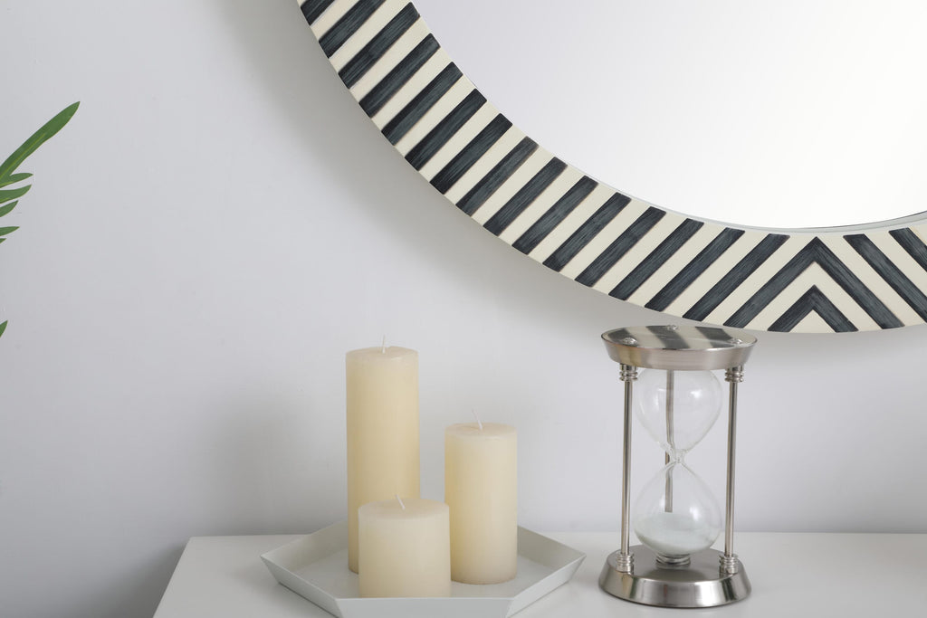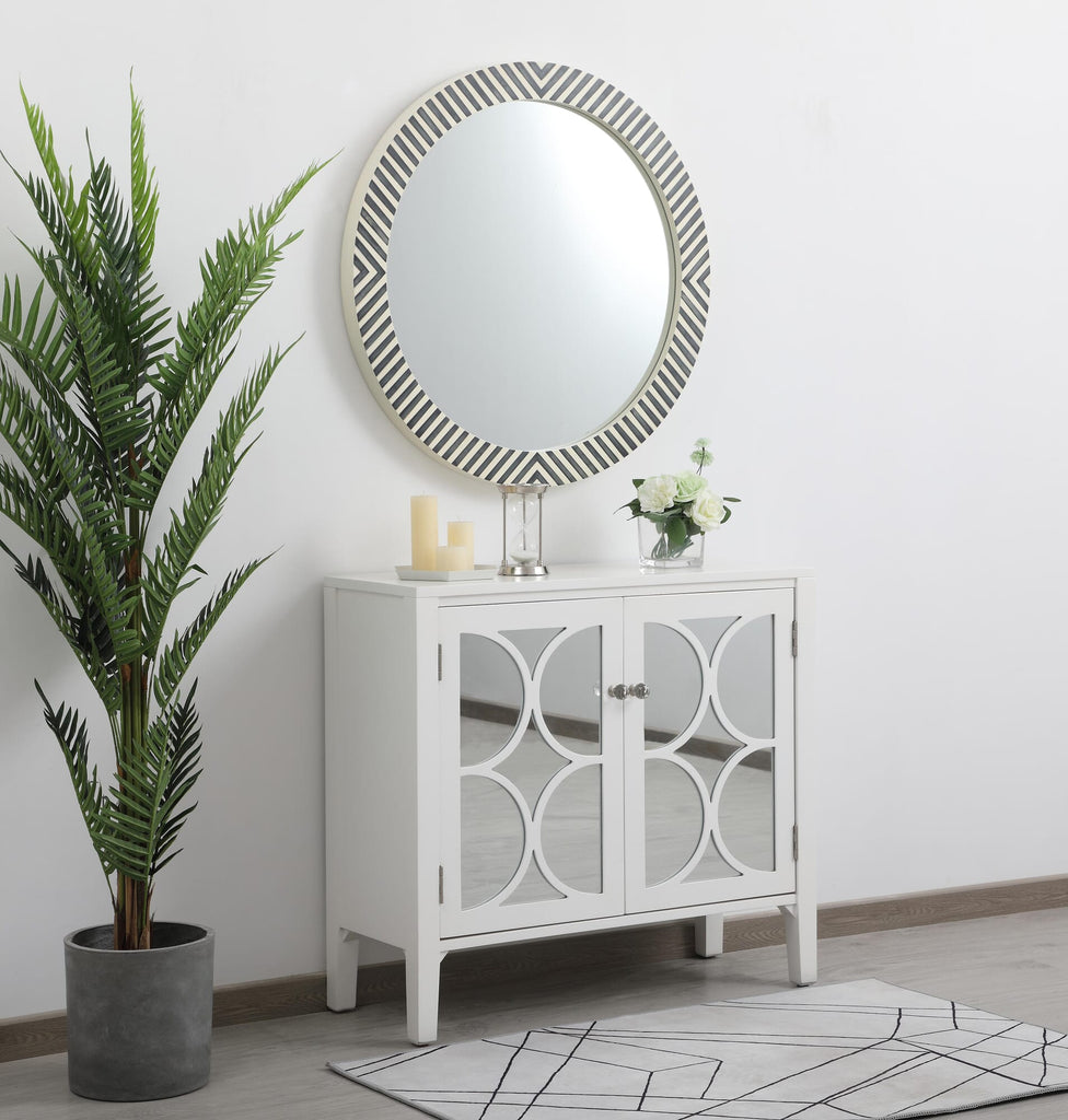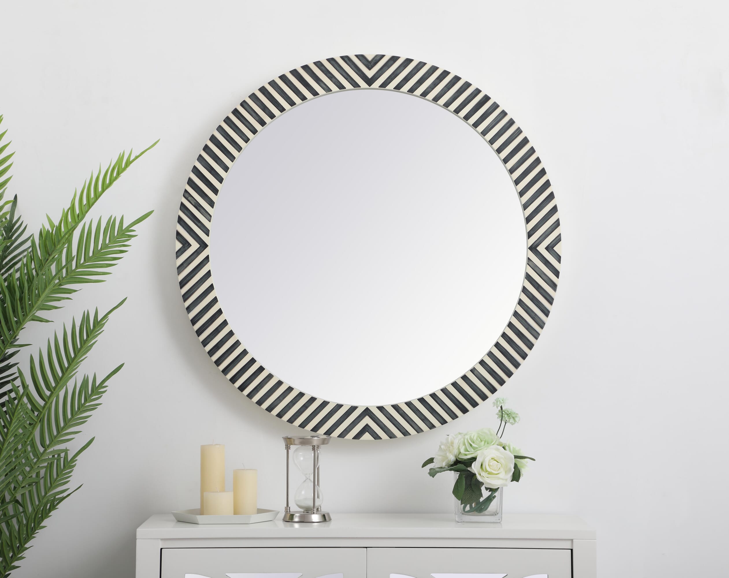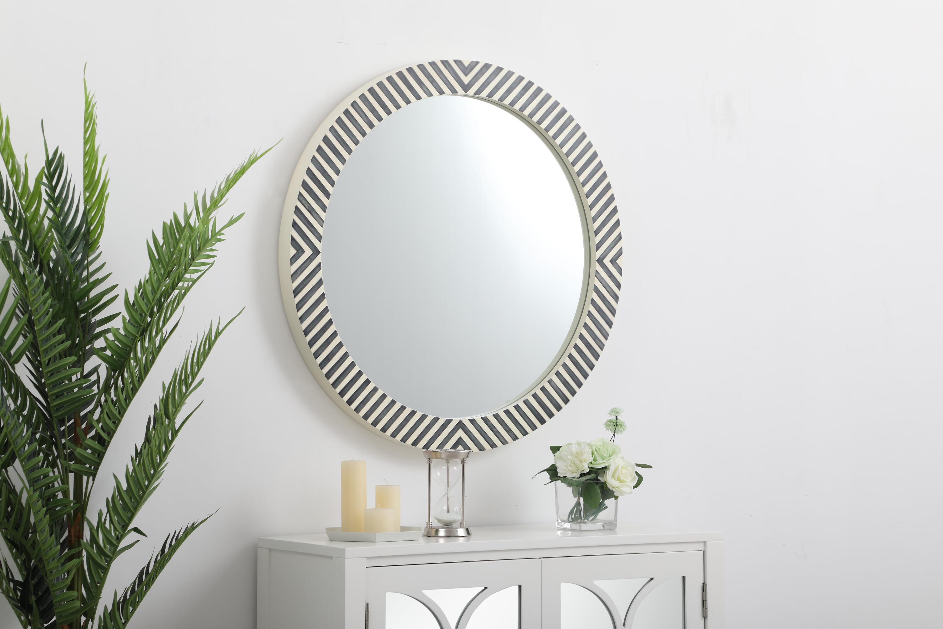 Dimensions Length: 32" Width: 2" Height: 32" Depth: 2" Specifications Product Type: Vanity Mirrors Wire Included: No Fixture Material: Glass and Wood Product Shape: Round Assembly Required: No Mirror Frame Shape: round Mirror Hanging Orientation: Vertical Mirror Mounting: Metal hook Mirror Type: Clear mirror Frameless: NO Weight: 10 Product Warranty: 1 year limited Shipment type: Small Parcel
