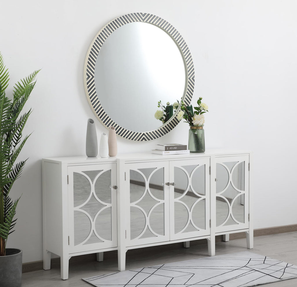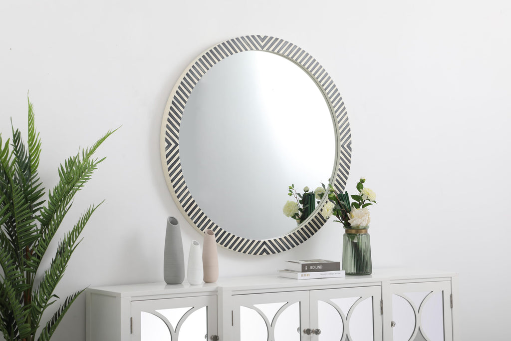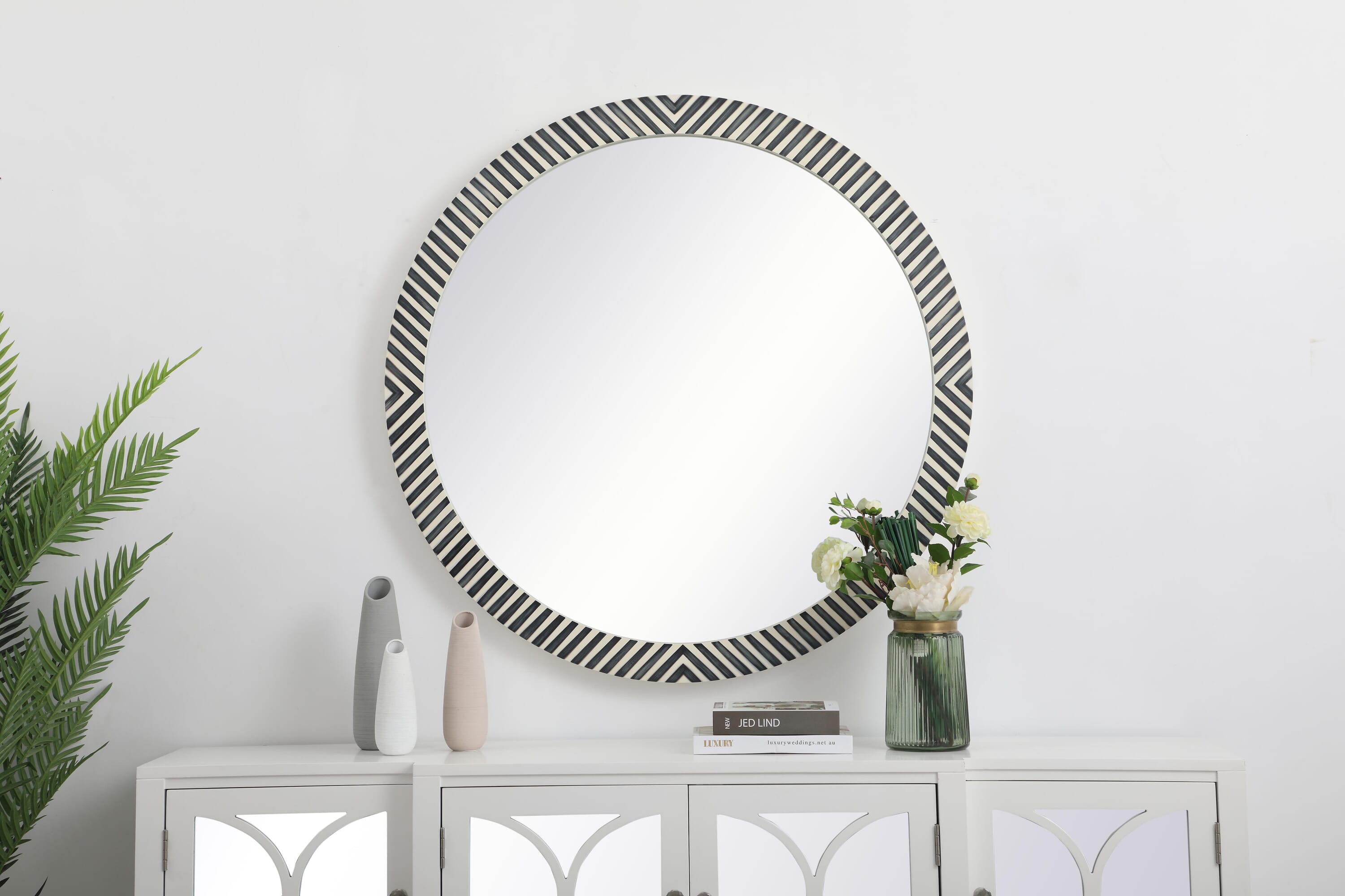 Dimensions Length: 42" Width: 2" Height: 42" Depth: 2" Specifications Product Type: Vanity Mirrors Wire Included: No Fixture Material: Glass and Wood Product Shape: Round Assembly Required: No Mirror Frame Shape: round Mirror Hanging Orientation: Vertical Mirror Mounting: Metal hook Mirror Type: Clear mirror Frameless: NO Weight: 16.4 Product Warranty: 1 year limited Shipment type: Oversized Ground