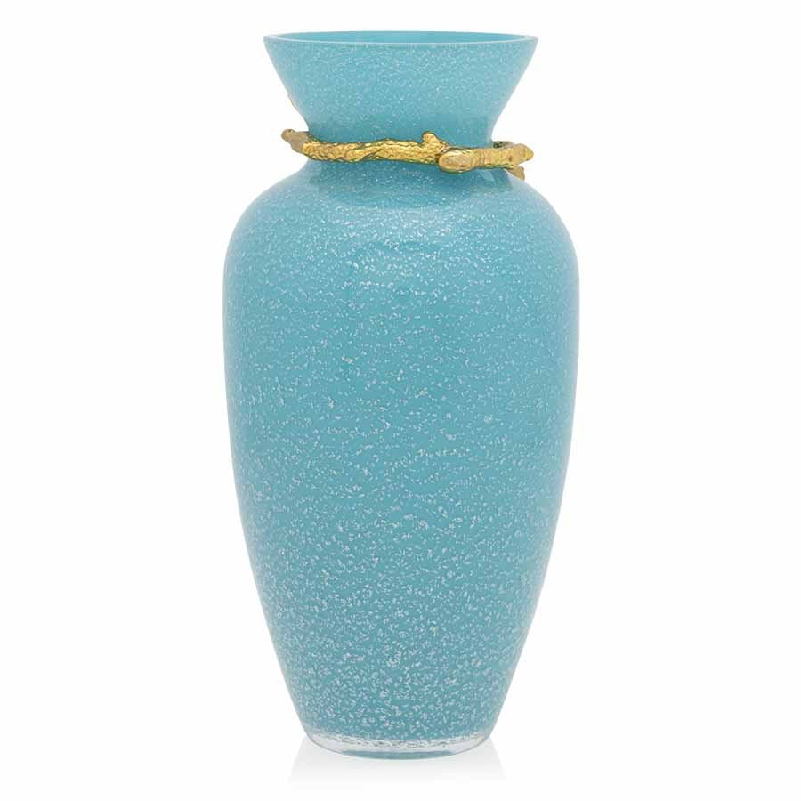 Mouth-blown silver speckled turquoise glass vase with a 14K Gold finished metal collar hand painted with enamels and hand-set with Swarovski crystals.