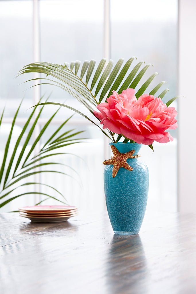 A whimsical jeweled starfish rests at the neck of this beautiful turquoise glass vase. Each Asteria Starfish vase begins with the mouth-blown glass vase - speckled in silver wrapped in a 14K Gold finished metal collar. Individually painted in coral shades of enamel and hand-set with sparkling crystals. A great pop of color on its own and equally pretty filled with flowers!