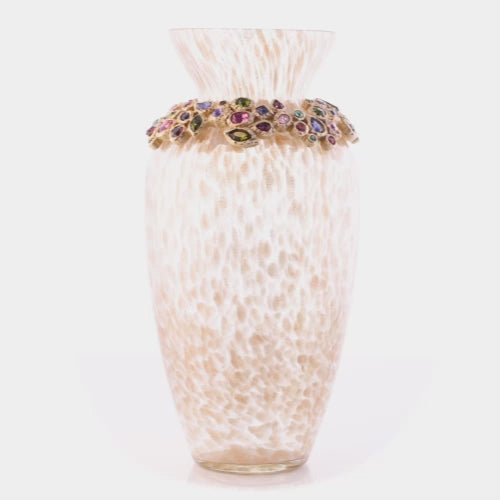 Crowned with a wreath of Swarovski crystals in vibrant peacock hues set in 14K gold this hand-blown glass vase is the embodiment of refined elegance and master artistry. Crystal-clear and shimmering champagne glass swirl together with one-of-a-kind results.