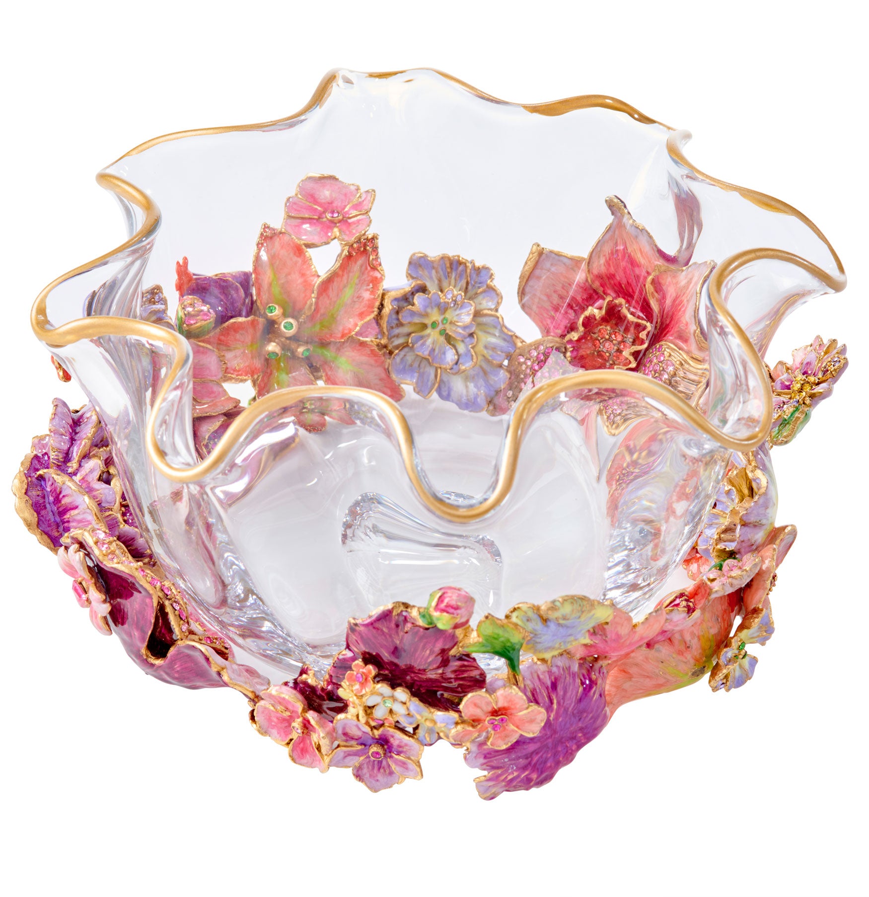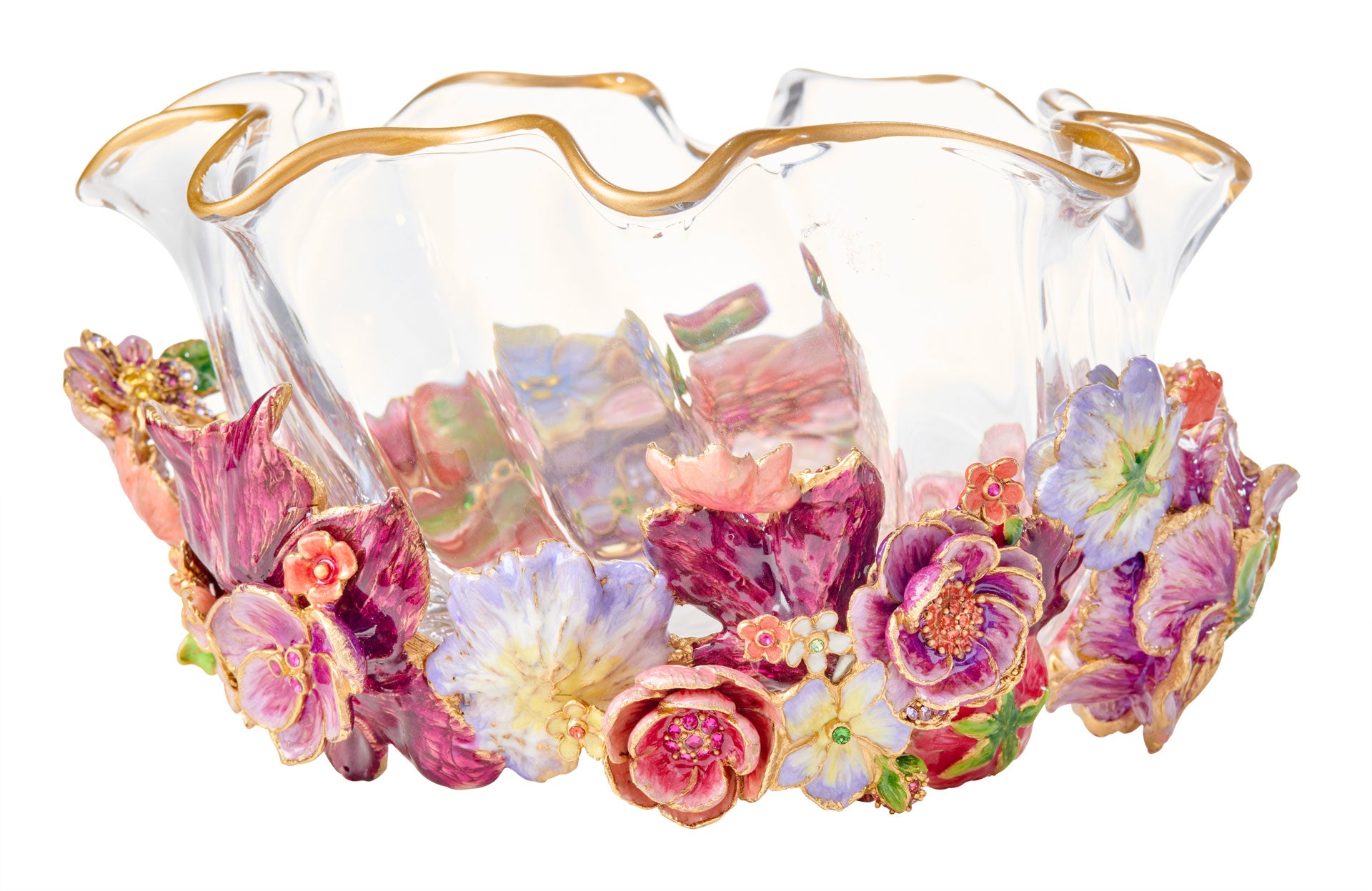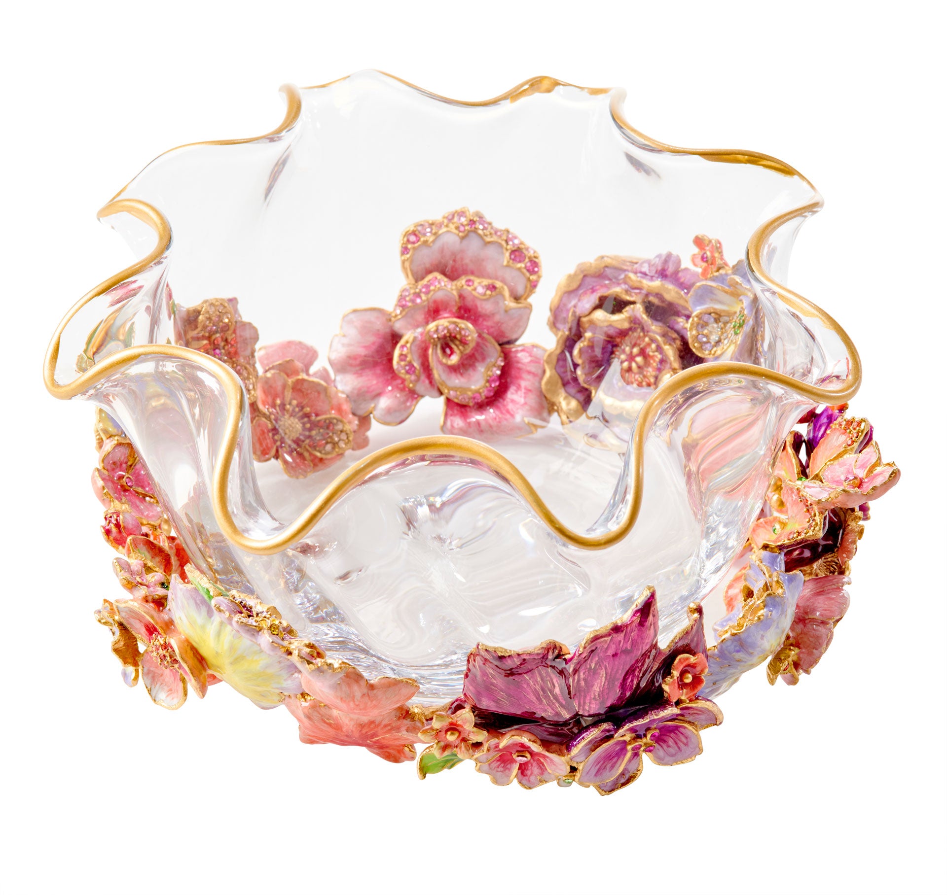 Our artistry shines with this gorgeous bowl of jeweled flowers wrapping around the gold lipped glass with a ring of flowers at the base. All flowers are handset with a variety of sparkling Swarovski crystals. Our finest artisans at the Jay Strongwater Rhode Island workshop bring all the elements together to make each bowl. A beautiful statement on its own or equally elegant when filled with fruits.