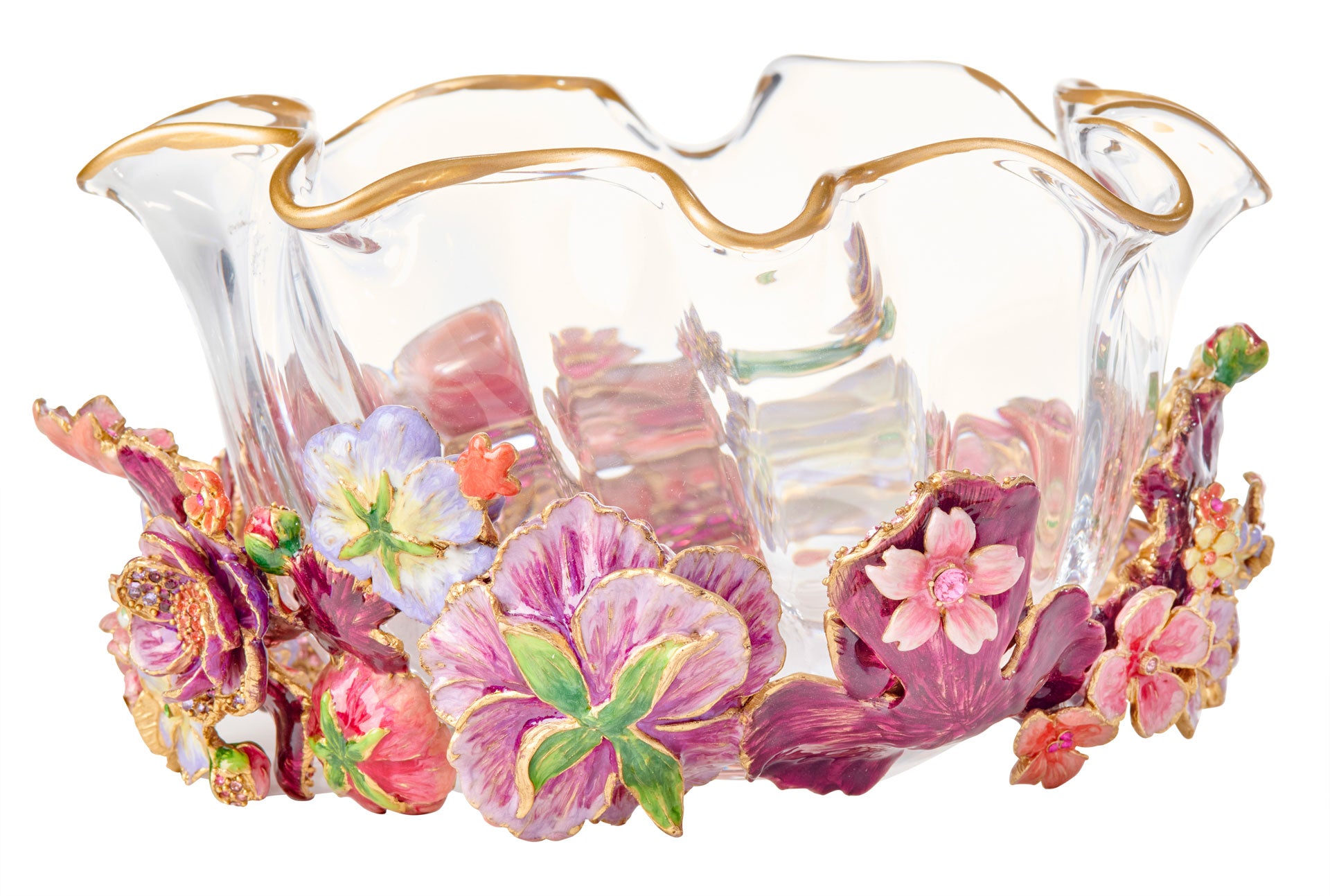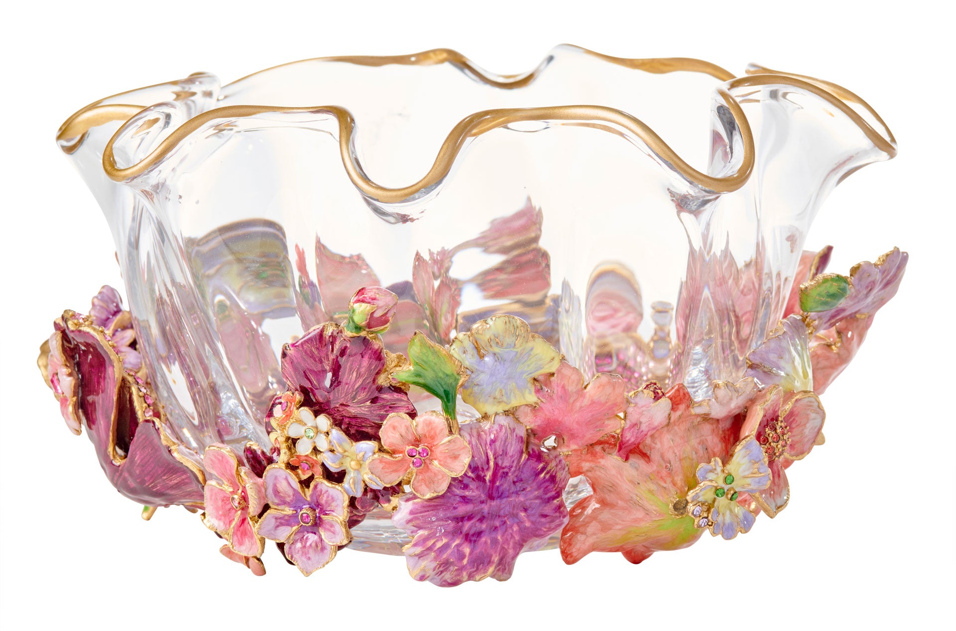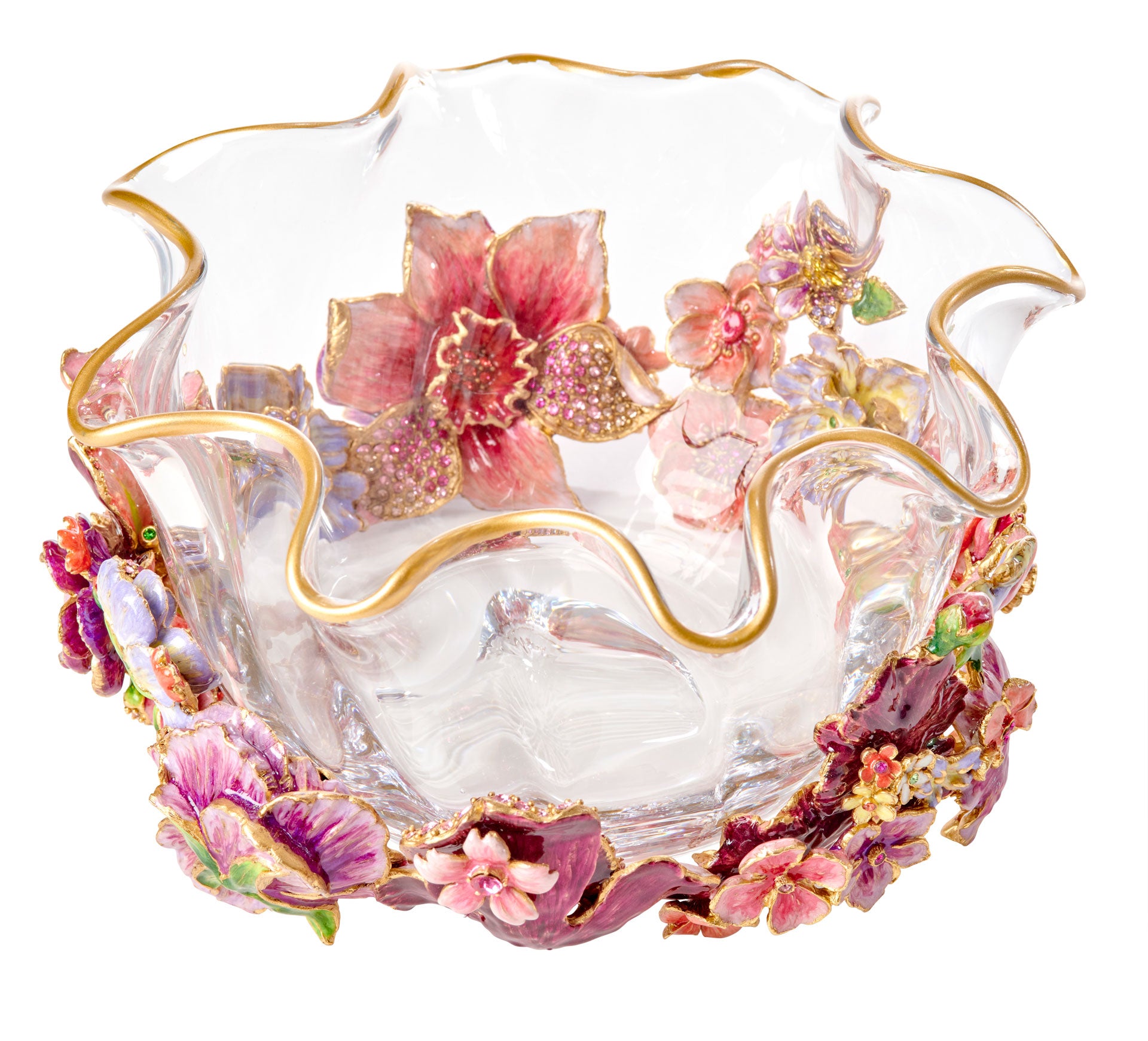 Our artistry shines with this gorgeous bowl of jeweled flowers wrapping around the gold lipped glass with a ring of flowers at the base. All flowers are handset with a variety of sparkling Swarovski crystals. Our finest artisans at the Jay Strongwater Rhode Island workshop bring all the elements together to make each bowl. A beautiful statement on its own or equally elegant when filled with fruits.